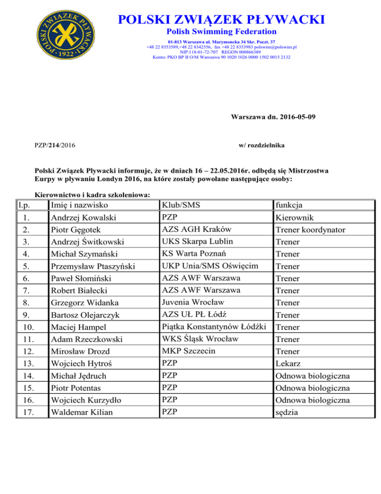 POLSKI ZWIĄZEK PŁYWACKI Polish Swimming Federation 01-813 Warszawa ul. Marymoncka 34 Skr. Poczt. 37 +48 22 8353589,+48 22 8342556, fax +48 22 8353983 [email protected] NIP:118-01-72-707 REGON 000866389 Konto: PKO BP II O/M Warszawa 90 1020 1026 0000 1502 0015 2132 Warszawa dn. 2016-05-09 PZP/214/2016 w/ rozdzielnika Polski Związek Pływacki informuje, że w dniach 16 – 22.05.2016r. odbędą się Mistrzostwa Eurpy w pływaniu Londyn 2016, na które zostały powołane następujące osoby: Kierownictwo i kadra szkoleniowa: l.p. 1. 2. 3. 4. 5. 6. 7. 8. 9. 10. 11. 12. 13. 14. 15. 16. 17. Imię i nazwisko Andrzej Kowalski Piotr Gęgotek Andrzej Świtkowski Michał Szymański Przemysław Ptaszyński Paweł Słomiński Robert Białecki Grzegorz Widanka Bartosz Olejarczyk Maciej Hampel Adam Rzeczkowski Mirosław Drozd Wojciech Hytroś Michał Jędruch Piotr Potentas Wojciech Kurzydło Waldemar Kilian Klub/SMS PZP AZS AGH Kraków UKS Skarpa Lublin KS Warta Poznań UKP Unia/SMS Oświęcim AZS AWF Warszawa AZS AWF Warszawa Juvenia Wrocław AZS UŁ PŁ Łódź Piątka Konstantynów Łódźki WKS Śląsk Wrocław MKP Szczecin PZP PZP PZP PZP PZP funkcja Kierownik Trener koordynator Trener Trener Trener Trener Trener Trener Trener Trener Trener Trener Lekarz Odnowa biologiczna Odnowa biologiczna Odnowa biologiczna sędzia Zawodnicy : Imię i nazwisko Cieślak Marcin Klub/SMS MUKP Warszawianka funkcja zawodnik 2. Baranowska Katarzyna AZS AWFiS Gdańsk zawodnik 3. Czerniak Konrad AZS AWF Katowice zawodnik 4. Czerniak Monika Kormoran Olsztyn zawodnik 5. Dowgiert Anna WKS Śląsk Wrocław zawodnik 6. Karpisz Milena Piątka Konstantynów Łódźki zawodnik 7. Kawęcki Radosław AZS AWF Warszawa zawodnik 8. Klich Kacper WKS Śląsk Wrocław zawodnik 9. Korzeniowski Paweł AZS AWF Warszawa zawodnik 10. Krupecki Oskar WKS Śląsk Wrocław zawodnik 11. Majchrzak Kacper KS Warta Poznań zawodnik 12. Orczykowska Wioletta Jordan Kraków zawodnik 13. Paluszek Weronika AZS AWF Warszawa zawodnik 14. Piechota Paulina UKS 190 Łódź zawodnik 15. Polewka Tomasz AZS AWF Katowice zawodnik 16. Sokołowska Diana AZS AWFiS Gdańsk zawodnik 17. Świtkowski Jan UKS Skarpa Lublin zawodnik 18. Sztandera Dominika MKS Juvenia Wrocław zawodnik 19. Szynal Ludwika UKS Skarpa Lublin zawodnik 20. Tarczyński Marcin Legia Warszawa zawodnik 21. Tchórz Alicja MKS Juvenia Wrocław zawodnik 22. Aleksandra Urbańczyk AZS UŁ PŁ Łódź zawodnik 23. Wojdak Wojciech UKP Unia Oświęcim zawodnik 24. Wypych Filip AZS UŁ PŁ Łódź zawodnik 25. Zaborowski Filip MKP Szczecin zawodnik 26. Żukowska Paula MKS Juvenia Wrocław zawodnik l.p. 1. Polski Związek Pływacki pokryje koszty przelotów i pobytu ww osób podczas zawodów, natomiast koszty przejazdu do Warszawy i powrotu do miejsca zamieszkania pokrywają jednostki delegujące. Na wyjazd na zawody należy zgłosić się na lotnisku Warszawa Okęcie, w dniu 14.05.2016r o godzinie 12:00. Wylot na Mistrzostwa Europy do Londyny odbędzie się o godzinie 15:10 lotem LO 279 do Londynu. Powrót nastąpi 23.05.2016 r. o godzinie 13:45 lotem LO 282 z Londynu. Trener Koordynator Prezes Andrzej Kowalski Piotr Gęgotek