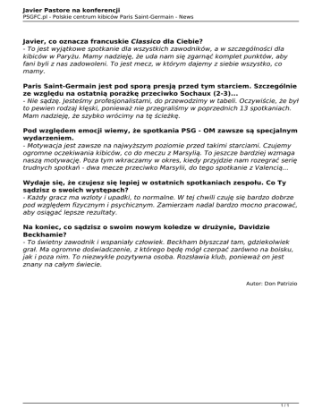 Javier Pastore na konferencji PSGFC.pl - Polskie centrum kibiców Paris Saint-Germain - News Javier, co oznacza francuskie Classico dla Ciebie? - To jest wyjątkowe spotkanie dla wszystkich zawodników, a w szczególności dla kibiców w Paryżu. Mamy nadzieję, że uda nam się zgarnąć komplet punktów, aby fani byli z nas zadowoleni. To jest mecz, w którym dajemy z siebie wszystko, co mamy. Paris Saint-Germain jest pod sporą presją przed tym starciem. Szczególnie ze względu na ostatnią porażkę przeciwko Sochaux (2-3)... - Nie sądzę. Jesteśmy profesjonalistami, do przewodzimy w tabeli. Oczywiście, że był to pewien rodzaj klęski, ponieważ nie przegraliśmy w poprzednich 13 spotkaniach. Mam nadzieję, że szybko wrócimy na tę ścieżkę. Pod względem emocji wiemy, że spotkania PSG - OM zawsze są specjalnym wydarzeniem. - Motywacja jest zawsze na najwyższym poziomie przed takimi starciami. Czujemy ogromne oczekiwania kibiców, co do meczu z Marsylią. To jeszcze bardziej wzmaga naszą motywację. Poza tym wkraczamy w okres, kiedy przyjdzie nam rozegrać serię trudnych spotkań - dwa mecze przeciwko Marsylii, do tego spotkanie z Valencią... Wydaje się, że czujesz się lepiej w ostatnich spotkaniach zespołu. Co Ty sądzisz o swoich występach? - Każdy gracz ma wzloty i upadki, to normalne. W tej chwili czuję się bardzo dobrze pod względem fizycznym i psychicznym. Zamierzam nadal bardzo mocno pracować, aby osiągać lepsze rezultaty. Na koniec, co sądzisz o swoim nowym koledze w drużynie, Davidzie Beckhamie? - To świetny zawodnik i wspaniały człowiek. Beckham błyszczał tam, gdziekolwiek grał. Ma ogromne doświadczenie, z którego będę mógł czerpać zarówno na boisku, jak i poza nim. To niezwykle pozytywna osoba. Rozsławia klub, ponieważ on jest znany na całym świecie. Autor: Don Patrizio 1/1 Powered by TCPDF (www.tcpdf.org)