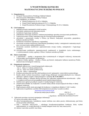 X WOJEWÓDZKI KONKURS MATEMATYCZNE ŚCIEŻKI PO POLSCE I. Organizatorzy: 1. Związek Nauczycielstwa Polskiego Oddział Gdańsk 2. Stowarzyszenie Miłośników Polskiej Tradycji przy współpracy ze szkołami: Szkoła Podstawowa Nr 69 w Gdańsku Zespół Szkół Ogólnokształcących Nr 2 w Gdańsku Zespół Kształcenia Podstawowego i Gimnazjalnego Nr 26 w Gdańsku II. Cele konkursu: 1. popularyzowanie matematyki wśród uczniów, 2. rozwijanie zainteresowań matematycznych, 3. kształcenie logicznego myślenia, 4. pobudzanie twórczego myślenia i niekonwencjonalnego sposobu rozwiązywania problemów, 5. wykorzystywanie wiedzy matematycznej do rozwiązywania problemów, 6. utrwalanie i poszerzanie wiedzy o Polsce, jej historii, tradycjach, przyrodzie, gospodarce, kulturze narodowej Polski 7. kształcenie tożsamości narodowej i regionalnej, 8. stworzenie uczniom możliwości sprawdzenia posiadanej wiedzy i umiejętności matematycznych przy rozwiązywaniu zadań problemowych, 9. stworzenie uczniom możliwości zaprezentowania swojej wiedzy, umiejętności i logicznego myślenia, 10. rozwiązywanie problemów matematycznych osadzonych w kontekście życia codziennego, z wykorzystaniem wiedzy ogólnej o Polsce i kulturze narodowej Polski. III. Zakres materiału: 1. z matematyki – zgodny z programem klas wymienionych w kategorii wiekowej, nieznacznie wykraczający poza podstawę programową 2. z zakresu wiedzy ogólnej – wiedza o Polsce, jej historii, tradycjach, kulturze narodowej Polski, dostosowane do kategorii wiekowej. IV. Organizacja konkursu 1. Konkurs odbywa się w trzech kategoriach wiekowych: - kat. I – klasy 2-3 szkoły podstawowej - kat. II – klasy 4-6 szkoły podstawowej - kat. III – klasy 1-3gimnazjum 2. Konkurs przeznaczony jest dla szkół podstawowych i gimnazjów województwa pomorskiego. 3. Każda szkoła wybiera trzyosobowy zespół drogą eliminacji wewnątrzszkolnych (we własnym zakresie) i zgłasza zespół w danej kategorii w terminie do 11.01.2016 r. 4. Wszelkie zmiany w składzie drużyn powinny być zgłaszane organizatorom niezwłocznie – tylko w wyjątkowych/losowych przypadkach przed startem danej drużyny. 5. Szkoła może zgłosić po jednym zespole w każdej kategorii wiekowej. 6. Zespół może składać się wyłącznie z uczniów danej szkoły uczęszczających do klasy w danej kategorii wiekowej. 7. Reprezentacja szkoły może przystąpić do konkursu w niepełnym składzie (1 lub 2 osoby). 8. Zgłoszenia (wypełnione czytelnie lub komputerowo) prosimy wysyłać na adres: [email protected] lub pocztą tradycyjną na adres: ZSO Nr 2 Gdańsk, ul. Wodnika 57 z dopiskiem: KONKURS MATEMATYCZNY 9. Zgłoszenie powinno zawierać następujące informacje: a) nazwę oraz pełny adres szkoły, b) adres korespondencyjny, kontaktowy numer telefonu oraz adres poczty elektronicznej, pod który można przesłać informacje, c) imię i nazwisko nauczyciela – szkolnego koordynatora/opiekuna konkursu, który wyłoni reprezentantów ze swojej placówki (w każdej kategorii może być inny nauczyciel), d) imiona i nazwiska uczniów oraz klasę. 1 10. Zgłoszenie powinno być opatrzone pieczątką szkoły, podpisem dyrektora szkoły oraz nauczyciela/koordynatora. 11. Każdą kategorię wysyłamy na osobnej karcie zgłoszenia. 12. Każdy przystępujący do konkursu uczestnik powinien posiadać ze sobą podpisaną przez rodzica lub opiekuna prawnego zgodę na przetwarzanie danych osobowych związane wyłącznie z prezentacją przebiegu oraz wyników konkursu. Wzór takiego oświadczenia załączamy, ale także pozostaje do pobrania na stronie internetowej http://barbarakowalińska.pl/ w zakładce Wojewódzki Konkurs Matematyczne Ścieżki po Polsce. Potrzeba wyrażenia zgody wynika z przepisów prawa. 13. Uczestnicy konkursu przyjeżdżają na koszt własny. 14. Podczas zawodów każda osoba indywidualnie rozwiązuje zadania przez 60 minut. 15. Każde zadanie można rozwiązać na dwa sposoby – korzystając z wiedzy matematycznej lub bezpośrednio z wiedzy ogólnej. 16. W trakcie konkursu nie można korzystać z kalkulatorów ani innych pomocy. 17. Oprócz klasyfikacji indywidualnej, prowadzona będzie również klasyfikacja zespołowa. Nagrody zostaną przyznane w obu klasyfikacjach. 18. W przypadku remisu na pierwszych trzech miejscach w klasyfikacji indywidualnej lub zespołowej przeprowadzona zostanie dogrywka między tymi osobami lub zespołami. 19. Zadania matematyczne przygotowane są przez nauczycieli członków Sekcji Kształcenia Ogólnego Związku Nauczycielstwa Polskiego Oddział Gdańsk. 20. W skład Komisji zawodów międzyszkolnych wchodzą nauczyciele powołani przez organizatorów. 21. Komisja konkursowa zobowiązana jest do: a) przygotowania i opracowania zadań, b) przeprowadzenia konkursu, c) czuwania nad prawidłowością przebiegu konkursu, d) rzetelnego sprawdzania i oceniania prac zgodnie z opracowaną wcześniej punktacją, e) sporządzenia protokołu z prac komisji. 22. Sprawy nieujęte w regulaminie rozstrzyga organizator. 23. Od decyzji organizatora i Komisji Konkursowej nie przysługuje odwołanie. 24. Koordynatorzy poszczególnych kategorii odpowiedzialni są za przygotowanie sal i sprawne przeprowadzenie Konkursu na terenie danej szkoły. 25. Organizatorom przysługuje prawo przyznania dodatkowych nagród i wyróżnień. 26. Termin i miejsce konkursu: Kategoria Uczniowie klas Data Godzina I 2-3 szkoły podstawowej 4-6 szkoły podstawowej 1-3 gimnazjum 23.01.2016 r. 10.00 30.01.2016 r. 10.00 23.01.2016 r. 10.00 II III Miejsce Szkoła Podstawowa Nr 69 Gdańsk, ul. Zielony Trójkąt 1 ZSO Nr 2 Gdańsk, ul. Wodnika 57 ZKPiG nr 26 Gdańsk, ul. VII Dwór 7 27. Uroczyste wręczenie nagród nastąpi 05.02.2016 r. o godz. 12.00 w ZSO N 2 w Gdańsku. 28. Informacje na temat Konkursu dostępne są na stronach: http://barbarakowalińska.pl/ http://www.gim33.gdansk.pl/ http://znpgdansk.org/ 29. Dodatkowych informacji związanych z Konkursem 