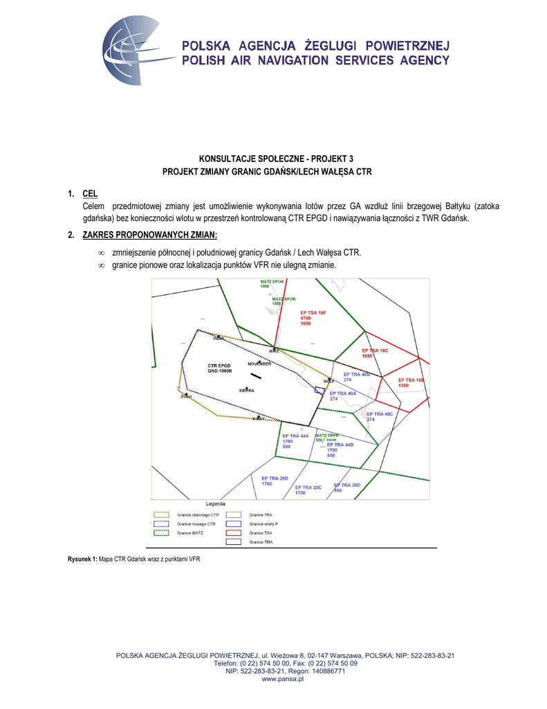 KONSULTACJE SPOŁECZNE - PROJEKT 3 PROJEKT ZMIANY GRANIC GDAŃSK/LECH WAŁĘSA CTR 1. CEL Celem przedmiotowej zmiany jest umożliwienie wykonywania lotów przez GA wzdłuż linii brzegowej Bałtyku (zatoka gdańska) bez konieczności wlotu w przestrzeń kontrolowaną CTR EPGD i nawiązywania łączności z TWR Gdańsk. 2. ZAKRES PROPONOWANYCH ZMIAN: • • zmniejszenie północnej i południowej granicy Gdańsk / Lech Wałęsa CTR. granice pionowe oraz lokalizacja punktów VFR nie ulegną zmianie. Rysunek 1: Mapa CTR Gdańsk wraz z punktami VFR POLSKA AGENCJA ŻEGLUGI POWIETRZNEJ, ul. Wieżowa 8, 02-147 Warszawa, POLSKA; NIP: 522-283-83-21 Telefon: (0 22) 574 50 00, Fax: (0 22) 574 50 09 NIP: 522-283-83-21, Regon: 140886771 www.pansa.pl Rysunek 2: Mapa przedstawiająca nowe granice Gdańsk / Lech Wałęsa CTR (kolor czerwony) – linia brzegu Bałtyku jest odsłonięta. 3. UZASADNIENIE Mając na uwadze intensywny ruch VFR wokół granic CTR oraz wychodząc naprzeciw oczekiwaniom środowiska GA poddano szczegółowej analizie obecne granice Gdańsk / Lech Wałęsa CTR. W związku z niedawnym wprowadzeniem kolejnych procedur dla lotniska Rembiechowo (GNSS), uwzględniając liczbę opublikowanych procedur podejścia do lądowania na EPGD podjęto decyzję o wycofaniu procedur opartych o pomoc nawigacyjną NDB GDN tj. NDB RWY 29 oraz ILS Z or LOC z RWY 29. W wyniku analiz tras nominalnych procedur podejścia oraz ich pierwszorzędnych przestrzeni chronionych opracowano projekt zakładający zmniejszenie północnych oraz południowych granic CTR. Zmniejszenie granic CTR EPGD od strony północnej umożliwi wykonywanie przelotów wzdłuż linii brzegowej Bałtyku (zatoka Gdańska) bez konieczność wlatywania w przestrzeń kontrolowaną Gdańsk / Lech Wałęsa CTR oraz nawiązywania łączności z kontrolerem TWR Gdańsk. Dodatkowo zmiana skróci przebieg tras dla ruchu tranzytowego GA wzdłuż północnej granicy CTR. 4. Korzyści i ograniczenia wynikające z wprowadzenia przedmiotowych zasad: Cost Benefit Analysis POTENCJALNE ZYSKI Z1 Z2 Z3 Zwiększenie dostępności lotnictwa GA do przestrzeni klasy G. Zmniejszenie granic CTR Gdańsk w szczególności od strony północnej umożliwi wykonywanie przelotów wzdłuż linii brzegowej Bałtyku (zatoka Gdańska) bez konieczność wlatywania w przestrzeń kontrolowaną Gdańsk / Lech Wałęsa CTR Zmiana wpłynie na odciążenie organu ATC poprzez brak konieczności nawiązywania łączności z TWR Gdańsk przy wykonywaniu przelotów przez GA wzdłuż linii brzegowej Bałtyku (zatoka Gdańska). Skrócenie przebiegu tras dla ruchu tranzytowego GA wzdłuż północnej i południowej granicy CTR ASPEKT POTENCJALNE STRATY ASPEKT EFF OPS/ EFF OPS/ SAF/ EFF S1 EFF S2