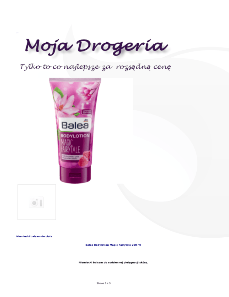 Niemiecki balsam do ciała Balea Bodylotion Magic Fairytale 200 ml Niemiecki balsam do codziennej pielęgnacji skóry. Strona 1 z 3 Delikatna, aksamitna opieka dla ciała. Dodaje przyjemnego zapachu magnolii i malin, nawadnia oraz odżywia skórę. Szybko wchłaniający się balsam. Przebadany dermatologicznie. Jeżeli potrzebujesz więcej produktów, lub masz specjalne zamówienie to napisz do nas a my je wycenimy i po Twoim potwierdzeniu zrealizujemy. Jak dobre zakupy to tylko: www.mojadrogeria.eu Strona 2 z 3 rodzaj produktu balsam do ciała rodzaj opakowania plastikowa tuba waga/objętość 200 ml kraj pochodzenia Niemcy Strona 3 z 3