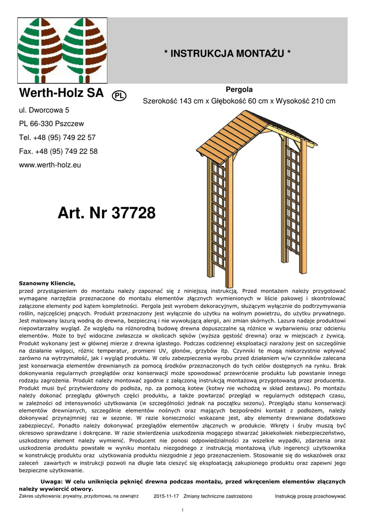 * INSTRUKCJA MONTAŻU * Werth-Holz SA PL Pergola Szerokość 143 cm x Głębokość 60 cm x Wysokość 210 cm ul. Dworcowa 5 PL 66-330 Pszczew Tel. +48 (95) 749 22 57 Fax. +48 (95) 749 22 58 www.werth-holz.eu Art. Nr 37728 Szanowny Kliencie, przed przystąpieniem do montażu należy zapoznać się z niniejszą instrukcją. Przed montażem należy przygotować wymagane narzędzia przeznaczone do montażu elementów złącznych wymienionych w liście pakowej i skontrolować załączone elementy pod kątem kompletności. Pergola jest wyrobem dekoracyjnym, służącym wyłącznie do podtrzymywania roślin, najczęściej pnących. Produkt przeznaczony jest wyłącznie do użytku na wolnym powietrzu, do użytku prywatnego. Jest malowany lazurą wodną do drewna, bezpieczną i nie wywołującą alergii, ani zmian skórnych. Lazura nadaje produktowi niepowtarzalny wygląd. Ze względu na różnorodną budowę drewna dopuszczalne są różnice w wybarwieniu oraz odcieniu elementów. Może to być widoczne zwłaszcza w okolicach sęków (wyższa gęstość drewna) oraz w miejscach z żywicą. Produkt wykonany jest w głównej mierze z drewna iglastego. Podczas codziennej eksploatacji narażony jest on szczególnie na działanie wilgoci, różnic temperatur, promieni UV, glonów, grzybów itp. Czynniki te mogą niekorzystnie wpływać zarówno na wytrzymałość, jak i wygląd produktu. W celu zabezpieczenia wyrobu przed działaniem w/w czynników zalecana jest konserwacja elementów drewnianych za pomocą środków przeznaczonych do tych celów dostępnych na rynku. Brak dokonywania regularnych przeglądów oraz konserwacji może spowodować przewrócenie produktu lub powstanie innego rodzaju zagrożenia. Produkt należy montować zgodnie z załączoną instrukcją montażową przygotowaną przez producenta. Produkt musi być przytwierdzony do podłoża, np. za pomocą kotew (kotwy nie wchodzą w skład zestawu). Po montażu należy dokonać przeglądu głównych części produktu, a także powtarzać przegląd w regularnych odstępach czasu, w zależności od intensywności użytkowania (w szczególności jednak na początku sezonu). Przeglądu stanu konserwacji elementów drewnianych, szczególnie elementów nośnych oraz mających bezpośredni kontakt z podłożem, należy dokonywać przynajmniej raz w sezonie. W razie konieczności wskazane jest, aby elementy drewniane dodatkowo zabezpieczyć. Ponadto należy dokonywać przeglądów elementów złącznych w produkcie. Wkręty i śruby muszą być okresowo sprawdzane i dokręcane. W razie stwierdzenia uszkodzenia mogącego stwarzać jakiekolwiek niebezpieczeństwo, uszkodzony element należy wymienić. Producent nie ponosi odpowiedzialności za wszelkie wypadki, zdarzenia oraz uszkodzenia produktu powstałe w wyniku montażu niezgodnego z instrukcją montażową i/lub ingerencji użytkownika w konstrukcję produktu oraz użytkowania produktu niezgodnie z jego przeznaczeniem. Stosowanie się do wskazówek oraz zaleceń zawartych w instrukcji pozwoli na długie lata cieszyć się eksploatacją zakupionego produktu oraz zapewni jego bezpieczne użytkowanie. Uwaga: W celu uniknięcia pęknięć drewna podczas montażu, przed wkręceniem elementów złącznych należy wywiercić otwory. Zakres użytkowania: prywatny, przydomowa, na zewnątrz 2015-11-17 Zmiany techniczne zastrzeżono 1 Instrukcję proszę przechowywać Wykaz elementow Ryc. Lp. Ilosc 1 1 526x1800 2 2 590x736 3 6 35x55x190 A 12 4,0x45 B 8 4,0x60 2 1 Wymiar [mm] 2 3 A B 2 A B 3 A A 1 1 2