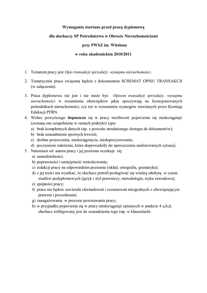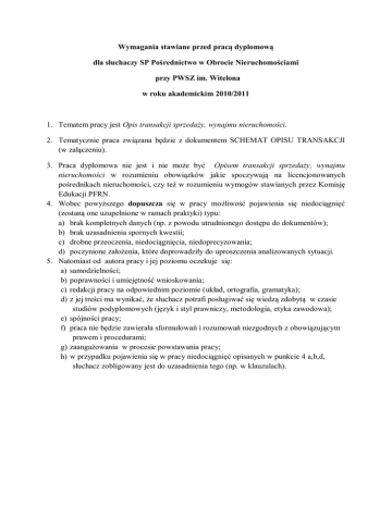 Wymagania stawiane przed pracą dyplomową dla słuchaczy SP Pośrednictwo w Obrocie Nieruchomościami przy PWSZ im. Witelona w roku akademickim 2010/2011 1. Tematem pracy jest Opis transakcji sprzedaży, wynajmu nieruchomości. 2. Tematycznie praca związana będzie z dokumentem SCHEMAT OPISU TRANSAKCJI (w załączeniu). 3. Praca dyplomowa nie jest i nie może być Opisem transakcji sprzedaży, wynajmu nieruchomości w rozumieniu obowiązków jakie spoczywają na licencjonowanych pośrednikach nieruchomości, czy też w rozumieniu wymogów stawianych przez Komisję Edukacji PFRN. 4. Wobec powyższego dopuszcza się w pracy możliwość pojawienia się niedociągnięć (zostaną one uzupełnione w ramach praktyki) typu: a) brak kompletnych danych (np. z powodu utrudnionego dostępu do dokumentów); b) brak uzasadnienia spornych kwestii; c) drobne przeoczenia, niedociągnięcia, niedoprecyzowania; d) poczynione założenia, które doprowadziły do uproszczenia analizowanych sytuacji. 5. Natomiast od autora pracy i jej poziomu oczekuje się: a) samodzielności; b) poprawności i umiejętność wnioskowania; c) redakcji pracy na odpowiednim poziomie (układ, ortografia, gramatyka); d) z jej treści ma wynikać, że słuchacz potrafi posługiwać się wiedzą zdobytą w czasie studiów podyplomowych (język i styl prawniczy, metodologia, etyka zawodowa); e) spójności pracy; f) praca nie będzie zawierała sformułowań i rozumowań niezgodnych z obowiązującym prawem i procedurami; g) zaangażowania w procesie powstawania pracy; h) w przypadku pojawienia się w pracy niedociągnięć opisanych w punkcie 4 a,b,d, słuchacz zobligowany jest do uzasadnienia tego (np. w klauzulach).