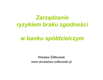 Zarządzanie ryzykiem braku zgodności w banku spółdzielczym Wiesław Żółtkowski www.doradztwo.zoltkowski.pl Uwagi ogólne Zarządzanie ryzykiem, jego istotność i zakres trzeba rozpatrywać w kontekście całego systemu funkcjonowania banku. Nie chodzi o mechaniczne wdrażanie określonych procedur lecz o zrozumienie istoty ryzyka i stosowanie procedur odpowiednich do sytuacji danego banku. „Zarząd banku odpowiada za skuteczność systemu zarządzania ryzykiem …” (art..5 uchwały nr 4/2007). „Systemy i procesy … (zarządzania ryzykiem) powinny być dostosowane do wielkości oraz stopnia złożoności działalności banku.” (art.. 6.2 Uchwały nr 4/2007). A więc nie mogą być takie same w każdym banku. Zasięg zarządzania musi obejmować cały proces, koncentrować się na wynikach i sprawnym funkcjonowaniu. W dużym banku wymaga rozbudowanej struktury organizacyjnej podległej zarządowi. W małym banku wszystko mieści się w głowie menedżera. I często niepotrzebne są formalne struktury 2 organizacyjne. Bank spółdzielczy jako organizacja Większość banków spółdzielczych charakteryzuje: 9 jeden szczebel kierowania, co oznacza podejmowanie wszystkich ważnych decyzji przez zespół zarządu; 9 zatrudnienie na poziomie od kilkunastu do stu kilkudziesięciu osób; 9 tylko proste instrumenty finansowe i procedury. Duże banki spółdzielcze mają: 9 Zarząd, który tworzy wszystkie regulacje wewnętrzne, mimo istnienia dwóch – trzech szczebli kierowania; 9 istnieje wyodrębniona centrala nie pełniąca funkcji operacyjnych. Zatrudnienie na poziomie 150 – 300 osób; 9 tylko proste instrumenty finansowe i procedury. Sa to banki samodzielne, nie należą do międzynarodowych korporacji. 3 Uwagi ogólne Peter F. Drucker wskazuje: Każda firma powinna regularne sprawdzać, czy naprawdę potrzebuje raportów i procedur, które stosuje. Złe procedury mogą ograniczyć zyski. Raporty i procedury powinny koncentrować się tylko na tych działaniach, które są potrzebne do osiągnięcia określonych rezultatów w kluczowych obszarach. Raporty i procedury powinny być narzędziem dla osoby, która je sporządza. Nie można oceniać jakości pracy na podstawie jakości wypełniania formularzy. Podstawowym kryterium oceny są efekty. Zarządzam, jeśli mierzę. Jest w banku obszar niepewności, którym nie zarządza się w sformalizowany sposób. Tutaj jest miejsce na doświadczenie, 4 intuicję, talent i szczęście. Czy istnieje kolizja zakresu kontroli wewnętrznej i ryzyka braku zgodności? Ryzyko braku zgodności, to „skutki nieprzestrzegania przepisów prawa, regulacji wewnętrznych oraz przyjętych przez bank standardów postępowania” (art..22 uchwały nr 4/2007). Jakiego prawa, każdego czy tylko dotyczącego niektórych kwestii? Czynności kontrolne mają stwierdzić „przestrzeganie przepisów prawa oraz obowiązujących w banku regulacji wewnętrznych” , a dalej „skuteczności ujawniania w ramach kontroli funkcjonalnej błędów i nieprawidłowości oraz podejmowania skutecznych działań naprawczych i korygujących” (art..37 uchwały nr 4/20075). 5 Kontrola a ryzyko braku zgodności Jak rozgraniczyć obszar kontroli wewnętrznej od obszaru zarządzania ryzykiem braku zgodności? Kontrola nie powinna dotyczyć tworzenia prawa wewnętrznego, bo potem bada jego przestrzeganie. Ryzyko braku zgodności nie może badać przestrzegania procedur przez pracowników, to funkcja kontroli. Dlatego obszar ryzyka braku zgodności może obejmować: 9 proces przygotowania do działania, a nie realizację zadań, 9 poprawność procedur, a nie ich przestrzeganie, 9 specjalny tryb działania w sytuacji braku procedur wewnętrznych (chodzi o bezpośrednie kierowanie się prawem zewnętrznym). 6 Tymczasem występują w bankach przykłady definiowania ryzyka braku zgodności • • • • • Nieprzestrzeganie tajemnicy bankowej. Bark ochrony danych osobowych. Nieprzestrzeganie przepisów BHP. Pranie pieniędzy. Niedostosowanie narzędzi informatycznych do zmieniających się przepisów wewnętrznych. • Pomyłki pracowników, oszustwa, brak kwalifikacji. • Niezgodność przepisów wewnętrznych baku z przepisami prawa. • Nieprzestrzeganie standardów biznesowych. To podejście oznacza patrzenie z różnych punktów widzenia na to samo zdarzenie. A trzeba zdecydować, która definicja ryzyka lepiej opisuje narażenie banku na straty z tytułu zdarzenia. 7 Polityka zgodności „Polityka zgodności zawiera podstawowe zasady działania pracowników banku i wyjaśnia główne procedury identyfikujące ryzyko braku zgodności i umożliwiające zarządzanie ryzykiem braku zgodności na wszystkich szczeblach organizacji banku” (art..23.2 uchwały nr 4/2007) Obszar ryzyka braku zgodności: badanie zgodności z prawem nowych regulacji wewnętrznych i produktów, okresowe badanie zgodności regulacji wewnętrznych ze zmieniającym się prawem zewnętrznym. 8 Kto zarządza ryzykiem braku zgodności? Zarząd ustanawia „stałą i efektywnie działającą jednostkę ds.. zarządzania ryzykiem braku zgodności w banku” (art.. 25 uchwały nr 4/2007) . Sądzę, że wystarczy wskazanie członka zarządu (i ew. prawnika) , który zajmuje się; 9 kwalifikowaniem spraw jako obarczonych ryzykiem braku zgodności, 9 zadawaniem pytań prawnym określonym podmiotom. Kto może odpowiedzieć na te pytania? 9 Departament Prawny (lub inny) w banku zrzeszającym, 9 jednostka prawna obsługująca bank (jeśli jest). Czy wszyscy pracownicy mają uczestniczyć w zarządzaniu ryzykiem braku zgodności? – N i e. Jeśli mają zarządzać wszyscy, to znaczy że nikt. 9 Co jeszcze obejmuje ryzyko braku zgodności? Można wpisać do procedury różne „miękkie” wartości: • Etyka biznesu • Przestrzeganie kodeksów zawodowych • Tolerancja wobec religii, płci, rasy. Ale jak to zmierzyć? Czy powinno się wpisywać do procedur apele dotyczące poprawnego zachowania? Normy e