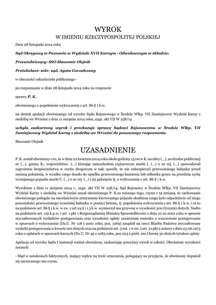 WYROK W IMIENIU RZECZYPOSPOLITEJ POLSKIEJ Dnia 28 listopada 2014 roku Sąd Okręgowy w Poznaniu w Wydziale XVII Karnym - Odwoławczym w składzie: Przewodniczący: SSO Sławomir Olejnik Protokolant: sekr. sąd. Agata Gorzałczany w obecności oskarżyciela publicznego po rozpoznaniu w dniu 28 listopada 2014 roku na rozprawie sprawy P. K. obwinionego o popełnienie wykroczenia z art. 86 § 1 k.w. na skutek apelacji obwinionego od wyroku Sądu Rejonowego w Środzie Wlkp. VII Zamiejscowy Wydział Karny z siedzibą we Wrześni z dnia 11 sierpnia 2014 roku, sygn. akt VII W 258/14 uchyla zaskarżony wyrok i przekazuje sprawę Sądowi Rejonowemu w Środzie Wlkp. VII Zamiejscowy Wydział Karny z siedzibą we Wrześni do ponownego rozpoznania Sławomir Olejnik UZASADNIENIE P. K. został obwiniony o to, że w dniu 22 kwietnia 2014 roku około godziny 15.00 w K. na ulicy (...), na drodze publicznej nr (...), gmina K., województwa (...) kierując samochodem ciężarowym marki I. (...) o nr rej. (...) spowodował zagrożenie bezpieczeństwa w ruchu drogowym w taki sposób, że nie zabezpieczył przewożonego ładunku przed zmianą położenia, w wyniku czego doszło do upadku przewożonego kamienia lub odłamka gruzu na przednią szybę wymijanego pojazdu marki C. (...) o nr rej. (...) i jej pęknięcie tj. o wykroczenie z art. 86 § 1 k.w. Wyrokiem z dnia 11 sierpnia 2014 r., sygn. akt VII W 258/14, Sąd Rejonowy w Środzie Wlkp. VII Zamiejscowy Wydział Karny z siedzibą we Wrześni uznał obwinionego P. K.za winnego tego, czynu z tą zmianą, że zachowanie obwinionego polegało na niewłaściwym utrzymaniu kierowanego pojazdu skutkiem czego było odpadniecie od niego pozostałości przewożonego wcześniej ładunku w postaci betonu, tj. popełnienia wykroczenia z art. 86 § 1 k.w. i za to na podstawie art. 86 § 1 k.w. w zw. z art.24 § 1 i 3 k.w. wymierzył mu grzywnę w wysokości 300 (trzysta) złotych. Nadto na podstawie art. 119 k.p.w. i art. 1 pkt 1 Rozporządzenia Ministra Sprawiedliwości z dnia 10.10.2001 roku w sprawie zryczałtowanych wydatków postępowania oraz wysokości opłaty zaniesienie wniosku o wznowienie postępowania w sprawach o wykroczenia (Dz.U. Nr 118 z 2001 roku, poz. 1269) zasądził na rzecz Skarbu Państwa zryczałtowane wydatki postępowania w kwocie 100 złotych oraz na podstawie art. 3 ust. 1 w zw. z art. 21 pkt 2 ustawy z dnia 23.06.1973 roku o opłatach w sprawach karnych (Dz.U. Nr 49 z 1083 roku, poz.223 z późń. zm.) kwotę 30 złotych tytułem opłaty. Apelację od wyroku Sądu I instancji wniósł obwiniony, zaskarżając powyższy wyrok w całości. Obwiniony wyrokowi zarzucił: - błąd w ustaleniach faktycznych, mający wpływ na treść orzeczenia, polegający na przyjęciu, że obwiniony dopuścił się zarzucanego mu czynu, - naruszenie przepisów postępowania polegające na nie wyjaśnieniu wszelkich okoliczności faktycznych istotnych dla rozstrzygnięcia sprawy. Skarżący wniósł o uchylenie wyroku i przekazanie sprawy do ponownego rozpoznania sądowi I instancji. W uzasadnieniu obwiniony wskazał, że Sąd Rejonowy jedynie na podstawie doświadczenia życiowego stwierdził, że na ścianach i obrzeża zbiornika pozostają resztki płynnego betonu, tymczasem obwiniony dokładnie oczyścił tą cześć pojazdu. Sąd w sposób dowolny ustalił stan faktyczny sprawy nie biorąc pod uwagę budowy pojazdu przeznaczonego do przewozu płynnego betonu, usytuowania otworów służących jedynie do napełnienia zbiornika z płynnego betonu, sposobu opróżniania beczki za pomocą leja, usytuowania pojazdów na dwóch przeciwległych pasach drogi oraz praw fizyki. Obwiniony wskazał, iż beton nie jest wylewany z beczki bezpośrednio ze zbiornika, ale za pośrednictwem specjalnego leja, nawet jeśli na leju znajdowałyby się resztki betonu to miejsce przechowywania leja uniemożliwia wyklucza możliwość spadnięcia resztek betonu na przednia szybę pojazdu poruszającego się na przeciwległym pasie, ponieważ resztki mogłyby spaść jedynie na boczne szyby. W ocenie skarżącego bezpodstawne jest ustalenie Sądu Rejonowego, że resztki betonu po pewnym czasie uległy stwardnieniu i w twardej postaci oderwały się od zbiornika uszkadzając szybę samochodu osobowego. Sąd nie wziął pod uwagę, iż beton twardnieje dopiero po kilku godzinach, zatem nawet jeśliby nawet oderwał się od zbiornika byłby w postaci płynnej i nie mógłby uszkodzić szyby. Sąd Okręgowy zważył, co następuje: Wniesiona apelacja okazała się zasadna i skutkować musiała uchyleniem zaskarżonego wyroku w całości z jednoczesnym przekazaniem sprawy do ponownego rozpoznania Sądowi I instancji. W pierwszej kolejności stwierdzić należy, że błąd w ustaleniach faktycznych przyjętych za podstawę orzeczenia to błąd, który wynika bądź to z niepełności postępowania dowodowego , bądź też z przekroczenia granic swobodnej oceny dowodów. Może on więc być wynikiem nieznajomości określonych dowodów lub nieprzestrzegania dyrektyw obowiązujących przy ocenie dowodów (art. 7 k.p.k. w zw. z art. 8 k.p.w.), np. błąd logiczny w rozumowaniu, zlekceważenie niektórych dowodów, danie wiary dowodom nieprzekonującym, bezpodstawne pominięcie określonych twierdzeń dowodowych, oparcie się na faktach w istocie nie udowodnionych itd. (Komentarz do art. 438 w Komentarzu do KPK pod red. T. Grzegorczyka, Zakamycze 2004 ). W niniejszej sprawie mamy do czynienia niewątpliwie z obiema kategoriami błędów – braków postępowania dowodowego, jak i przekroczeniem granic swobodnej oceny dowodów. Nie sposób bowiem nie zgodzić się ze stanowiskiem apelującego, że ocena materiału dowodowego zaprezentowana w uzasadnieniu zaskarżonego orzeczenia pozostaje w sprzeczności z doświadczeniem życiowym i zasadami logicznego rozumowania, a w konsekwencji ma charakter dowolnej, nadto Sąd zaniechał dokonania szeregu istotnych z punktu widzenia odpowiedzialności obw