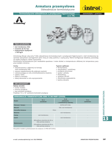 Armatura przemysłowa Odwadniacze termostatyczne Termostatyczne odwadniacze z przyłączami higienicznymi serii TC Opis produktów • stal nierdzewna 316L • cisnienie do 8,3 bar • maksymalna wydajność 1 700 kg/h Armstrong oferuje całą serię T-316L odwadniaczy termostatycznych z przyłączami higienicznymi z stali nierdzewnej, by sprostać specjalnym wymaganiom jakie niosą ze sobą systemy z czystą parą. Różne konfiguracje obudowy, pozwalają na wybór przyłącza i łatwe czyszczenie. Konstrukcja termostatyczna jest swobodnie-spustowa i może działać w temperaturze zbliżonej do temperatury pary przy każdym ciśnieniu. Typowe aplikacje: • fermentatory • sterylizatory / autoklawy • przyłącze procesowe • spady i cylindry • bioreaktory • systemy CIP/SIP • sterylizacja wyposażenia • bariery sterylne Cechy: • skonstruowany z odpornej na korozję stali nierdzewnej 316L • wysoce wypolerowany dla większej czystości • samoosuszający w celu zminimalizowania skażenia • spójny i lekki • łatwy w montażu • łatwy demontaż w celu wyczyszczenia ODWADNIACZE TERMOSTATYCZNE SERII TC DO PARY CZYSTEJ Model TC-R otwierane, z możliwością naprawy TC-C zaciskowe TC-S zamkniete ASTM A479 316L Pokrywa i korpus 316L stal nierdzewna Mieszki Viton Uszczelka korpusu stal nierdzewna Retainer Clamp stal nierdzewna - - Gwint - stal nierdzewna - - - Wykończenie 180 politura ziarnista do 20 ra albo ponizej wnętrza 150 politura ziarnista do 30 ra albo ponizej wnętrza ARMATURA PRZEMYSŁOWA Jak zamawiać? Należy określić: • numer modelu • rozmiar przyłączy • typ końcówki przyłączy Przykład: TC-C, ½” sanitarne końcówki przyłączy 13 Wszystkie modele są dostosowane do artykułu 3.3 PED (97/23/EC). e-mail: [email protected], tel. 032/7890103 ARMATURA PRZEMYSŁOWA 187 Armatura przemysłowa Odwadniacze termostatyczne ODWADNIACZE TERMOSTATYCZNE SERII TC DO PARY CZYSTEJ TC-R otwierane, z możliwością naprawy TC-C zaciskowe Model TC-S zamkniete Maksymalne dopuszczalne ciśnienie 8,3 bar 10 bar Maksymalna dopuszczalna temperatura 177°C 186°C Maksymalne ciśnienie pracy 7 bar 8,3 bar 0,57 Waga w kg 0,68 0,34 Maksymalne ciśnienie zwrotne: 99% ciśnienia wlotowego ODWADNIACZE TERMOSTATYCZNE SERII TC – WYDAJNOŚĆ Ciśnienie różnicowe* bar 0,35 5°C schłodzenia kg/h 11°C schłodzenie kg/h** 82 145 0,7 163 293 1,4 307 503 2,1 458 709 2,8 561 830 3,5 699 915 4,1 837 1 136 4,8 924 1 210 5,5 1 071 1 356 6,2 1 116 1 468 6,9 1 155 1 565 7,6 1 184 1 651 8,3 1 206 1 712 ARMATURA PRZEMYSŁOWA *Przepustowości oparte na ciśnieniu różnicowym, bez ciśnienia zwrotnego ** Przepustowości będą zmieniać się w zależności od stopnia ochłodzenia. Kiedy wymagana będzie większa przepustowość, odwadniacz automatycznie dostosuje się do ładunku, aż do zaprezentowanej maksymalnej przepustowości (zimna woda), poprzez zwiększenie ilości schładzanego kondensatu. ODWADNIACZE TERMOSTATYCZNE Z PRZYŁĄCZAMI HIGIENICZNYMI SERII TC – WYMIARY Model TC-C zaciskowy z obudową zaciskową sanitarną Przyłącza sanitarne ½”, ¾” i 1” 74 mm 66 mm 50 mm 31 mm 13 188 ARMATURA PRZEMYSŁOWA tel. 032/7890103, e-mail: [email protected] Armatura przemysłowa Odwadniacze termostatyczne Model TC-S zamknięty Przyłącza sanitarne ½” i ¾” Model TC-S zamknięty Przyłącza sanitarne 1” Model TC-S zamknięty Przyłącza gwintowane ½” i ¾” Model TC-S zamknięty Przyłącza rurowe ½” i ¾” 48 mm Diameter 50 mm Diameter 39 mm Diameter 39 mm Diameter 95 mm 65 mm 65 mm Model TC-R, możliwość naprawy, skręcona obudowa i pokrywa Przyłącza sanitarne ½”, ¾” i 1” Model TC-R, możliwość naprawy, skręcona obudowa i pokrywa Przyłącza gwintowane ½” i ¾” 108 mm Model TC-R, możliwość naprawy, skręcona obudowa i pokrywa Przyłącza rurowe ½” i ¾” 65 mm Diameter 65 mm Diameter 65 mm Diameter 93 mm 105 mm ARMATURA PRZEMYSŁOWA 66 mm 13 e-mail: [email protected], tel. 032/7890103 ARMATURA PRZEMYSŁOWA 189