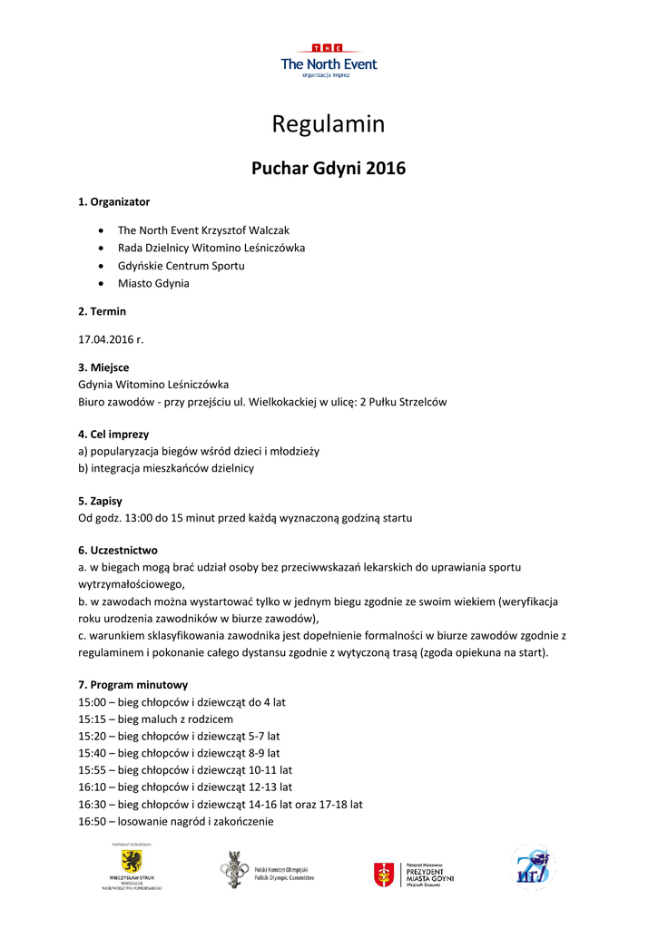 Regulamin Puchar Gdyni 2016 1. Organizator The North Event Krzysztof Walczak Rada Dzielnicy Witomino Leśniczówka Gdyńskie Centrum Sportu Miasto Gdynia 2. Termin 17.04.2016 r. 3. Miejsce Gdynia Witomino Leśniczówka Biuro zawodów - przy przejściu ul. Wielkokackiej w ulicę: 2 Pułku Strzelców 4. Cel imprezy a) popularyzacja biegów wśród dzieci i młodzieży b) integracja mieszkańców dzielnicy 5. Zapisy Od godz. 13:00 do 15 minut przed każdą wyznaczoną godziną startu 6. Uczestnictwo a. w biegach mogą brać udział osoby bez przeciwwskazań lekarskich do uprawiania sportu wytrzymałościowego, b. w zawodach można wystartować tylko w jednym biegu zgodnie ze swoim wiekiem (weryfikacja roku urodzenia zawodników w biurze zawodów), c. warunkiem sklasyfikowania zawodnika jest dopełnienie formalności w biurze zawodów zgodnie z regulaminem i pokonanie całego dystansu zgodnie z wytyczoną trasą (zgoda opiekuna na start). 7. Program minutowy 15:00 – bieg chłopców i dziewcząt do 4 lat 15:15 – bieg maluch z rodzicem 15:20 – bieg chłopców i dziewcząt 5-7 lat 15:40 – bieg chłopców i dziewcząt 8-9 lat 15:55 – bieg chłopców i dziewcząt 10-11 lat 16:10 – bieg chłopców i dziewcząt 12-13 lat 16:30 – bieg chłopców i dziewcząt 14-16 lat oraz 17-18 lat 16:50 – losowanie nagród i zakończenie 8. Dystans i kategorie wiekowe O przynależności do kategorii wiekowej decyduje rok urodzenia. Zawodnicy, którzy wystartują w złej kategorii wiekowej nie zostaną ujęci w klasyfikacji. 100 metrów chłopcy i dziewczęta do 4 lat 100 metrów maluch z rodzicem * 500 metrów chłopcy i dziewczęta 5-7 lat 500 metrów chłopcy i dziewczęta 8-9 lat 1000 metrów chłopcy i dziewczęta 10-11 lat 1000 metrów chłopcy i dziewczęta 12-13 lat 2000 metrów chłopcy i dziewczęta 14-16 lat 2000 metrów chłopcy i dziewczęta 17-18 lat We wszystkich kategoriach (nie dotyczy kategorii specjalnej „maluch z rodzicem”), każdy zawodnik musi wystartować sam, bez pomocy i obecności na trasie rodzica/opiekuna. Jeżeli mimo powyższego zapisu rodzic/opiekun dziecka pojawi się na trasie biegu, zawodnik może zostać zdyskwalifikowany i nie otrzymuje pamiątkowego medalu. *Kategoria specjalna: „maluch z rodzicem” ma charakter rekreacyjny, gdzie nie przewiduje się nagród za zajęte miejsca, a jedynie pamiątkowy medal za uczestnictwo w biegu. 9. Nagrody a. każdy uczestnik biegu na mecie otrzyma pamiątkowy medal b. pierwsze trójki (oprócz kategorii „maluch z rodzicem”) – puchary* d. ceremonia podsumowania Pucharu Gdyni odbędzie się po zakończeniu cyklu, miejsce i termin zostaną opublikowane na stronie http://www.puchargdyni.pl *Nagrody zostają wręczane bezpośrednio po starcie danej kategorii wiekowej. 10. Punktacja Punkty do klasyfikacji generalnej zdobywa się według klucza: 1. 100 pkt 2. 80 pkt 3. 70 pkt 4. 60 pkt 5. 50 pkt 6. 45 pkt 7. 40 pkt 8. 35 pkt 9. 30 pkt 10. 25 pkt 11. 24 pkt 12. 23 pkt …. 33. 3 pkt 34. 2 pkt od miejsca 35 wszyscy otrzymują po 1 pkt. 11. Wpisowe W biegach młodzieżowych nie pobiera się opłaty startowej. 12. Zgłoszenia a. on-line: www.puchargdyni.pl – zakładka zgłoszenia b. w dniu imprezy w biurze zawodów Uwaga: Każdy uczestnik musi posiadać pisemną zgodę opiekuna – dostępną na stronie: http://www.puchargdyni.pl/p/zgloszenia.html 12. Postanowienia końcowe a. zawody odbędą się bez względu na pogodę, b. organizator nie ponosi odpowiedzialności za rzeczy zgubione podczas imprezy i za szkody wyrządzone przez uczestników, c. w depozycie nie można pozostawiać rzeczy wartościowych, d. uczestnicy imprezy będą ubezpieczeni od następstw nieszczęśliwych wypadków, e. zawodnik, który odebrał numer startowy zgadza się na powyżej przedstawiony regulamin, f. ostateczna klasyfikacja opublikowana zostanie po akceptacji przez sędziego głównego, g. wszelkie protesty i odwołania należy składać najpóźniej do 2 tygodni po imprezie, w późniejszym terminie nie będą brane one pod uwagę, h. ostateczna interpretacja regulaminu należy do organizatorów. Patronat honorowy: Prezydent Miasta Gdyni Wojciech Szczurek Polski Komitet Olimpijski Marszałek Województwa Pomorskiego Mieczysław Struk Zespół Szkół nr 7 w Gdyni Patronat sportowy: Ranata Walendziak, Waldemar Lisicki, Andrzej Magier, Antoni Cichończuk. Patronaty medialne: www.maratonypolskie.pl www.radiogdansk.pl www.zKaszub.info www.mlodagdynia.pl KONTAKT Z ORGANIZATOREM – od poniedziałku do piątku – w godz. 9:00-16:00 – t. 881 048 884