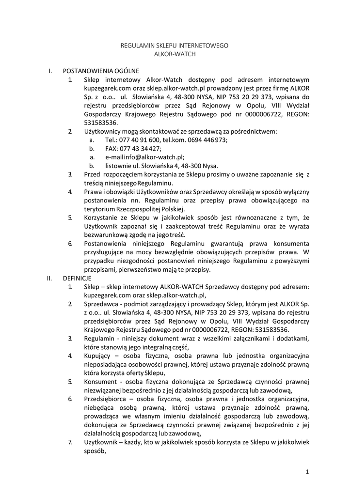 REGULAMIN SKLEPU INTERNETOWEGO ALKOR-WATCH I. II. POSTANOWIENIA OGÓLNE 1. Sklep internetowy Alkor-Watch dostępny pod adresem internetowym kupzegarek.com oraz sklep.alkor-watch.pl prowadzony jest przez firmę ALKOR Sp. z o.o.. ul. Słowiańska 4, 48-300 NYSA, NIP 753 20 29 373, wpisana do rejestru przedsiębiorców przez Sąd Rejonowy w Opolu, VIII Wydział Gospodarczy Krajowego Rejestru Sądowego pod nr 0000006722, REGON: 531583536. 2. Użytkownicy mogą skontaktować ze sprzedawcą za pośrednictwem: a. Tel.: 077 40 91 600, tel.kom. 0694 446 973; b. FAX: 077 43 34 427; a. e-mail [email protected]; b. listownie ul. Słowiańska 4, 48-300 Nysa. 3. Przed rozpoczęciem korzystania ze Sklepu prosimy o uważne zapoznanie się z treścią niniejszego Regulaminu. 4. Prawa i obowiązki Użytkowników oraz Sprzedawcy określają w sposób wyłączny postanowienia nn. Regulaminu oraz przepisy prawa obowiązującego na terytorium Rzeczpospolitej Polskiej. 5. Korzystanie ze Sklepu w jakikolwiek sposób jest równoznaczne z tym, że Użytkownik zapoznał się i zaakceptował treść Regulaminu oraz że wyraża bezwarunkową zgodę na jego treść. 6. Postanowienia niniejszego Regulaminu gwarantują prawa konsumenta przysługujące na mocy bezwzględnie obowiązujących przepisów prawa. W przypadku niezgodności postanowień niniejszego Regulaminu z powyższymi przepisami, pierwszeństwo mają te przepisy. DEFINICJE 1. Sklep – sklep internetowy ALKOR-WATCH Sprzedawcy dostępny pod adresem: kupzegarek.com oraz sklep.alkor-watch.pl, 2. Sprzedawca - podmiot zarządzający i prowadzący Sklep, którym jest ALKOR Sp. z o.o.. ul. Słowiańska 4, 48-300 NYSA, NIP 753 20 29 373, wpisana do rejestru przedsiębiorców przez Sąd Rejonowy w Opolu, VIII Wydział Gospodarczy Krajowego Rejestru Sądowego pod nr 0000006722, REGON: 531583536. 3. Regulamin - niniejszy dokument wraz z wszelkimi załącznikami i dodatkami, które stanowią jego integralną część, 4. Kupujący – osoba fizyczna, osoba prawna lub jednostka organizacyjna nieposiadająca osobowości prawnej, której ustawa przyznaje zdolność prawną która korzysta oferty Sklepu, 5. Konsument - osoba fizyczna dokonująca ze Sprzedawcą czynności prawnej niezwiązanej bezpośrednio z jej działalnością gospodarczą lub zawodową, 6. Przedsiębiorca – osoba fizyczna, osoba prawna i jednostka organizacyjna, niebędąca osobą prawną, której ustawa przyznaje zdolność prawną, prowadząca we własnym imieniu działalność gospodarczą lub zawodową, dokonująca ze Sprzedawcą czynności prawnej związanej bezpośrednio z jej działalnością gospodarczą lub zawodową, 7. Użytkownik – każdy, kto w jakikolwiek sposób korzysta ze Sklepu w jakikolwiek sposób, 1 8. III. IV. Formularz rejestracji – dostępny w Sklepie formularz on-line, umożliwiający utworzenie Konta, w którym należy podać wszystkie wymagane dane Użytkownika, w tym login i hasło, 9. Formularz zamówienia - dostępny w Sklepie formularz on-line umożliwiający złożenie zamówienia, 10. Produkt - dostępna w Sklepie rzecz ruchoma, będąca przedmiotem umowy sprzedaży pomiędzy Kupującym, a Sprzedawcą, 11. Skrzynka e-mail - elektroniczna skrzynka pocztowa, charakteryzująca się indywidualnym adresem internetowym danej osoby (adres e-mail), za pośrednictwem której dana osoba może wysyłać i odbierać wiadomości i inne dane w ramach usługi poczty elektronicznej, 12. Konto - miejsce w systemie teleinformatycznym Sprzedawcy, dostępne dla Kupującego po zalogowaniu, w którym gromadzone są dane Kupującego, w tym informacje o złożonych Zamówieniach. Za pośrednictwem Konta, Kupujący wprowadza i zarządza danymi, opisami i innymi elementami oraz korzysta z oferty Sklepu, 13. Dowód zakupu – paragon fiskalny, rachunek lub faktura VAT. WYMAGANIA TECHNICZNE 1. Do korzystania z usług Sklepu za pośrednictwem serwisu internetowego niezbędne jest posiadanie urządzenia pozwalającego na korzystanie z zasobów Internetu, skrzynki pocztowej e-mail oraz przeglądarki zasobów internetowych umożliwiającej wyświetlanie stron WWW (zaleca się korzystanie z następujących przeglądarek internetowych w podanych wersjach lub nowszych, z włączona obsługą plików „cookies”: Internet Explorer 8, Opera 10.00, Google Chrome 10.0, Mozilla 4.0 lub ich nowsze wersje). 2. Więcej o plikach „cookies” oraz zasadach ochrony tego typu danych znajdziesz w naszej Polityce prywatności. REJESTRACJA 1. Rejestracja Konta następuje poprzez wykonywanie kolejnych instrukcji na stronie Sklepu internetowego. 2. Poprzez rejestrację Konta Użytkownik oświadcza, że: a. zapoznał się z treścią Regulaminu oraz zaakceptował jego treść w całości, b. spełnia warunki wymagane do korzystania ze Sklepu określone w Regulaminie. 3. Użytkownik jest obowiązany do utrzymania w tajemnicy hasła dostępu do Konta. Użytkownik jest zobowiązany dołożyć najwyższej staranności, aby nie dopuścić do utraty hasła dostępowego lub wejścia w jego posiadanie przez osoby trzecie (niezależnie od sposobu). Użytkownik ponosi wyłączną odpowiedzialność za udostępnienie loginu i hasła osobom trzecim. 4. Użytkownik może w każdej chwili usunąć swoje Konto. Usunięcie Konta powoduje stałe i bezpowrotne usunięcie wszelkich danych Użytkownika z systemu. 5. Sprzedawca może usunąć Konto lub rozwiązać umowę o świadczenie usług drogą elektroniczną w przypadku, gdy: 2 a. V. Sprzedawca stwierdzi, iż Użytkownik naruszył postanowienia Regulaminu, a w szczególności korzysta ze Sklepu w sposób sprzeczny z jego przeznaczeniem, b. Użytkownik nie zaakceptował zmian wprowadzanych przez Sprzedawcę w Regulaminie, c. Użytkownik nie zalogował się ani razu na swoje Konto przez okres 12 miesięcy od ostatniego logowania lub zawieszenia Konta, d. Użytkownik nie aktywuje lub nie zweryfikuje Konta w terminie 30 dni, e. Użytkownik w wyznaczonym terminie liczonym od zablo