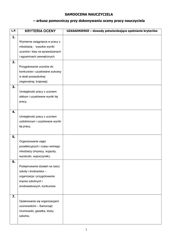SAMOOCENA NAUCZYCIELA – arkusz pomocniczy przy dokonywaniu oceny pracy nauczyciela L.P. KRYTERIA OCENY UZASADNIENIE – dowody potwierdzające spełnianie kryteriów 1. Wymierne osiągnięcia w pracy z młodzieŜą - wysokie wyniki uczniów i klas na sprawdzianach i egzaminach zewnętrznych 2. Przygotowanie uczniów do konkursów i uzyskiwane sukcesy w skali pozaszkolnej (regionalnej, krajowej) 3. Umiejętność pracy z uczniem słabym i uzyskiwane wyniki tej pracy, 4. Umiejętność pracy z uczniem uzdolnionym i uzyskiwane wyniki tej pracy, 5. Organizowanie zajęć pozalekcyjnych i czasu wolnego młodzieŜy (imprezy, wyjazdy, wycieczki, wypoczynek), 6. Podejmowanie działań na rzecz szkoły i środowiska – organizacja i przygotowanie imprez szkolnych i środowiskowych, konkursów 7. Opiekowanie się organizacjami uczniowskimi – Samorząd Uczniowski, gazetka, kluby szkolne, 1 8. Pobudzanie aktywności klasowej do udziału w konkursach szkolnych; klasa, której jest wychowawcą uzyskuje wysokie wyniki w rankingach i konkursach szkolnych. 9. Szczególna aktywność w organizowaniu i wyposaŜaniu pracowni, 10. Aktywny udział w róŜnych formach doskonalenia zawodowego, 11. Wprowadzanie innowacji pedagogicznych, nowoczesnych rozwiązań metodycznych, stosowanie aktywnych metod pracy, 12. Podejmowanie prac organizacyjnych w radzie pedagogicznej i zespołach nauczycielskich, udział w realizacji projektów, 13. Dzielenie się wiedza i umiejętnościami z innymi nauczycielami - prowadzenie lekcji otwartych, szkoleń dla nauczycieli. 14. Umiejętność organizacji współpracy z rodzicami i angaŜowania ich do działań na rzecz szkoły …………….………………………………………………………………. Data, czytelny podpis nauczyciela 2