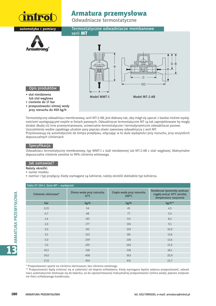 Armatura przemysłowa Odwadniacze termostatyczne Termostatyczne odwadniacze membanowe serii MT D B B A C CC Opis produktów A • stal nierdzewna lub stal węglowa • cisnienie do 17 bar • przepustowości zimnej wody przy rozruchu do 450 kg/h Model WMT-1 Model MT-2-AB Termostatyczny odwadniacz membranowy, serii MT-2-AB, jest dobrany tak, aby mógł się uporać z bardzo niskimi wydajnościami występującymi zwykle w liniach parowych. Odwadniacze termostatyczne MT są tak zaprojektowane by mogły działać dłużej niż inne przewymiarowane, uniwersalne termostatyczne i termodynamiczne odwadniacze parowe. Uszczelnienie wodne zapobiega utratom pary poprzez otwór zaworowy odwadniaczy z serii MT. Przystosowują się automatycznie do tempa przepływu, włączając w to duże wydajności przy rozruchu, przy wszystkich dopuszczalnych ciśnieniach. Specyfikacja Odwadniacz termostatyczny membranowy, typ WMT-1 z stali nierdzewnej lub MT-2-AB z stali węglowej. Maksymalne dopuszczalne ciśnienie zwrotne to 99% ciśnienia wlotowego. Jak zamawiać? Należy określić: • numer modelu • rozmiar i typ przyłączy. Kiedy wymagane są kołnierze, należy określić dokładnie typ kołnierza. ARMATURA PRZEMYSŁOWA Tabla ST-154-1. Seria MT – wydajność 13 Ciśnienie różnicowe* Zimna woda przy rozruchu 21°C Ciepła woda przy rozruchu 100°C Kondensat (powstały podczas ciągłej pracy) 10°C poniżej temperatury nasycenia bar kg/h kg/h kg/h** 0,35 54 45 4,5 0,7 68 77 5,9 1,4 145 113 8,2 2,0 177 136 9,1 3,0 191 159 10,9 3,5 222 181 11,8 5,0 259 218 13,6 7,0 295 263 15,9 10,5 318 318 18,1 14,0 408 363 20,9 17,0 454 431 22,7 * Przepustowości oparte na ciśnieniu różnicowym, bez ciśnienia zwrotnego. ** Przepustowości będą zmieniać się w zależności od stopnia ochłodzenia. Kiedy wymagana będzie większa przepustowość, odwadniacz automatycznie dostosuje się do ładunku, aż do zaprezentowanej maksymalnej przepustowości (zimna woda), poprzez zwiększenie ilości schładzanego kondensatu. 180 ARMATURA PRZEMYSŁOWA tel. 032/7890103, e-mail: [email protected] Armatura przemysłowa Odwadniacze termostatyczne ODWADNIACZ SERII WMT-1 (wymiary w mm) Model WMT-1 Przyłącze ¼” – 3/8” ½” „A” średnia 57 57 „B” od czoła do czoła (gwint i spaw) 84 84 Waga w kg (gwint i spaw) 0,1 0,1 ODWADNIACZ SERII MT-2-AB ( wymiary w mm) Model MT-2-AB Przyłącze 15 20 „A” średnica 25 77,5 „C” od czoła do czoła (gwint i spaw) 88 88 N/A „CC” od czoła do czoła (kołnierz PN40*) 150 150 160 „D” 60 Waga w kg (gwint i spaw) 1,7 Waga w kg (kołnierz PN40*) 4,1 4,3 4,5 *Inne rozmiary kołnierzy, wartości i powierzchnie wymiarów są dostępne na prośbę. Wszystkie modele są dostosowane do artykułu 3.3 PED (97/23/EC). Tabla ST-154-4. Odwadniacz MT-2-AB i WMT-1 Model Przyłącze WMT-1 MT-2-AB gwint BSPT i NPT gwint BSPT, spaw, kołnierz Materiał Pokrywa i korpus ASTM A240 do 304L Kapsuła stal węglowa stal nierdzewna – 304 Maksymalne ciśnienie 17 bar @ 204°C Maksymalne ciśnienie pracy 40 bar @ 400°C 17 bar ARMATURA PRZEMYSŁOWA Maksymalne ciśnienie dopuszczalne Maksymalne ciśnienie zwrotne: 99% ciśnienia wlotowego 13 e-mail: [email protected], tel. 032/7890103 ARMATURA PRZEMYSŁOWA 181
