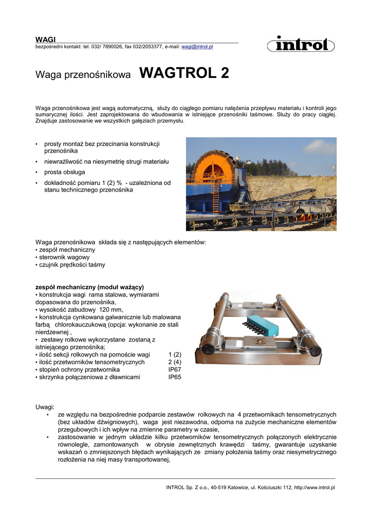 WAGI bezpośredni kontakt: tel. 032/ 7890026, fax 032/2053377, e-mail: [email protected] Waga przenośnikowa WAGTROL 2 Waga przenośnikowa jest wagą automatyczną, służy do ciągłego pomiaru natężenia przepływu materiału i kontroli jego sumarycznej ilości. Jest zaprojektowana do wbudowania w istniejące przenośniki taśmowe. Służy do pracy ciągłej. Znajduje zastosowanie we wszystkich gałęziach przemysłu. • prosty montaż bez przecinania konstrukcji przenośnika • niewrażliwość na niesymetrię strugi materiału • prosta obsługa • dokładność pomiaru 1 (2) % - uzależniona od stanu technicznego przenośnika Waga przenośnikowa składa się z następujących elementów: • zespół mechaniczny • sterownik wagowy • czujnik prędkości taśmy zespół mechaniczny (moduł ważący) • konstrukcja wagi rama stalowa, wymiarami dopasowana do przenośnika, • wysokość zabudowy 120 mm, • konstrukcja cynkowana galwanicznie lub malowana farbą chlorokauczukową (opcja: wykonanie ze stali nierdzewnej , • zestawy rolkowe wykorzystane zostaną z istniejącego przenośnika; • ilość sekcji rolkowych na pomoście wagi 1 (2) • ilość przetworników tensometrycznych 2 (4) • stopień ochrony przetwornika IP67 • skrzynka połączeniowa z dławnicami IP65 Uwagi: • • ze względu na bezpośrednie podparcie zestawów rolkowych na 4 przetwornikach tensometrycznych (bez układów dźwigniowych), waga jest niezawodna, odporna na zużycie mechaniczne elementów przegubowych i ich wpływ na zmienne parametry w czasie, zastosowanie w jednym układzie kilku przetworników tensometrycznych połączonych elektrycznie równolegle, zamontowanych w obrysie zewnętrznych krawędzi taśmy, gwarantuje uzyskanie wskazań o zmniejszonych błędach wynikających ze zmiany położenia taśmy oraz niesymetrycznego rozłożenia na niej masy transportowanej, ____________________________________________________________________________________________________________ INTROL Sp. Z o.o., 40-519 Katowice, ul. Kościuszki 112, http://www.introl.pl WAGI bezpośredni kontakt: tel. 032/ 7890026, fax 032/2053377, e-mail: [email protected] • • • • • zamontowane rolki na wadze oraz w strefie wagi, winny być sprawne. Bicie rolek, dwa zestawy przed i trzy za wagą winno nie przekraczać 0,2 mm, miejsce montażu 3 - 5 stacji rolkowych od zasypu, kąt wzniosu przenośnika nie powinien przekraczać 18º , materiał w trakcie jego transportu nie może się osuwać, boki taśmy tworzące nieckę, nie powinny być nachylone pod kątem większym jak 30º sterownik wagowy prezentuje wynik ważenia: • chwilowa wydajność [ t/h (kg/s)] • licznik główny [ kg, t ] • licznik pomocniczy [ kg, t ] • obciążenie przetworników [ kg ] w trybie diagnostycznym: • obiążenie przetworników [ kg] • sygnał z przetworników [ mV ] • test wyświetlacza, klawiatury • test przekaźników, • ilość impulsów enkodera • prędkość taśmy [ m/min ] • obciążenie taśmy [ kg/m ] • wyjście analogowe [ mA (V) ] Pełnione funkcje: • miernik przepływu, • dozownik • regulator przepływu Wyjścia/wejścia: • RS232 na drukarkę, • RS232 na PC (opcja: RS485 z protokołem ModBus, Profibus) • 11 wyjść przekaźnikowych • opcja: analogowe 0-20, 4-20 mA, 0-10V – chwilowy przepływ • 6 wejść (w tym: enkoder) Zasilanie: 230 VAC; 50 Hz Przewód łączący z skrzynką połączeniową: 6 x 0,35 mm² w ekranie czujnik prędkości taśmy enkoder • zasilanie 12 VDC • ilość impulsów/1 obrót 100 (500) • mocowanie: • dźwignia do konstrukcji na taśmę powrotną • opcja: sprzęgło • przewód łączący do sterownika 4 x 0,24 mm² w ekranie koło pomiarowe: • średnica Ø 159,16 mm • obwód 500 mm ____________________________________________________________________________________________________________ INTROL Sp. Z o.o., 40-519 Katowice, ul. Kościuszki 112, http://www.introl.pl WAGI bezpośredni kontakt: tel. 032/ 7890026, fax 032/2053377, e-mail: [email protected] Zakres dostawy zespół mechaniczny kpl. 1 skrzynka połączeniowa przetworników szt. 1 enkoder z kołem pomiarowym i dźwignią kpl. 1 sterownik szt. 1 skrzynka zewnętrzna (z zabudowanym sterownikiem) kpl. 1 Uwagi montażowe: • zamawiający zapewnia zasilanie wagi (sterownik) – podanie zasilania wykonują upoważnieni pracownicy zamawiającego • kalibrację wagi przeprowadza się statycznie odważnikami, • kalibracja dynamiczna pustej taśmy w ruchu, • kalibracja przepływu próbkami o znanej masie. Próbki materiału można wyznaczyć na wadze kontrolnej (np. samochodowej). Przygotowanie próbek i obsługa zasypu, pomiaru masy próbek zobowiązany jest wykonać Zamawiający. Pomiar może odbywać się przed lub po przejściu materiału przez wagę. Bezwzględnie ilość materiału ważonego musi być taka sama jak ilość materiału transportowanego przez przenośnik. Wielkość pojedynczej próbki zostanie określona w trakcie uruchomienia z uwzględnieniem cech przenośnika. • po wykonanych czynnościach kalibracyjnych, Introl Sp. Z o.o. Wystawia Świadectwo Sprawdzenia wagi. • • • • • ____________________________________________________________________________________________________________ INTROL Sp. Z o.o., 40-519 Katowice, ul. Kościuszki 112, http://www.introl.pl