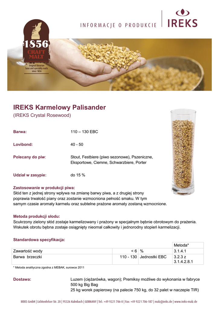 IREKS Karmelowy Palisander (IREKS Crystal Rosewood) Barwa: 110 – 130 EBC Lovibond: 40 - 50 Polecany do piw: Stout, Festbiere (piwo sezonowe), Pszeniczne, Eksportowe, Ciemne, Schwarzbiere, Porter Udział w zasypie: do 15 % Zastosowanie w produkcji piwa: Słód ten z jednej strony wpływa na zmianę barwy piwa, a z drugiej strony poprawia trwałość piany oraz zostanie wzmocniona pełność smaku. W tym samym czasie aromaty karmelu oraz subtelne prażone aromaty zostaną wzmocnione. Metoda produkcji słodu: Scukrzony zielony słód zostaje karmelizowany i prażony w specjalnym bębnie obrotowym do prażenia. Wskutek obrotu bębna zostaje osiągnięty nieomal całkowity i jednorodny stopień karmelizacji. Standardowa specyfikacja: Zawartość wody Barwa brzeczki <6 % 110 - 130 Jednostki EBC Metoda* 3.1.4.1 3.2.3 z 3.1.4.2.8.1 * Metoda analityczna zgodna z MEBAK, surowce 2011 Dostawa: Luzem (ciężarówka, wagon); Premiksy możliwe do wykonania w fabryce 500 kg Big Bag 25 kg worek papierowy (na palecie 750 kg, do 32 palet w naczepie TIR)