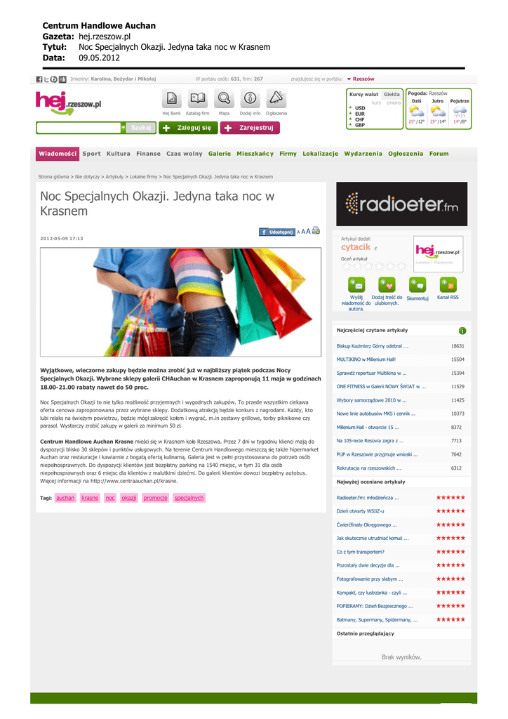 Centrum Handlowe Auchan Gazeta: hej.rzeszow.pl Tytu³: Noc Specjalnych Okazji. Jedyna taka noc w Krasnem Data: 09.05.2012 Imieniny: Karolina, Bożydar i Mikołaj W portalu osób: 631, firm: 267 znajdujesz się w portalu: Rzeszów Kursy walut Hej Bank Wiadomoś ci Sport Kultura Finanse Katalog firm Czas wolny Mapa Galerie Dodaj info USD EUR CHF GBP O głoszenia Mieszkańc y Firmy Lokalizacje Giełda kurs Pogoda: Rzeszów Dziś zmiana 25° /12° Wydarzenia Ogłoszenia Jutro Pojutrze 25° /14° 14°/8° Forum Strona główna > Nie dotyczy > Artykuły > Lokalne firmy > Noc Specjalnych Okazji. Jedyna taka noc w Krasnem Noc Specjalnych Okazji. Jedyna taka noc w Krasnem Udostępnij A AA 2012-0 5-09 17:13 Artykuł dodał: cytacik Oceń artykuł Wyślij Dodaj treść do Skomentuj wiadomość do ulubionych. autora. Kanał RSS Najczęściej czytane artykuły Biskup Kazimierz Górny odebrał ... 18631 MULTIKINO w Millenium Hall! 15504 Sprawdź repertuar Multikina w ... 15394 18.00-21.00 rabaty nawet do 50 proc. ONE FITNESS w Galerii NOWY ŚWIAT w ... 11529 Noc Specjalnych Okazji to nie tylko możliwość przyjemnych i wygodnych zakupów. To przede wszystkim ciekawa oferta cenowa zaproponowana przez wybrane sklepy. Dodatkową atrakcją będzie konkurs z nagrodami. Każdy, kto Wybory samorządowe 2010 w ... 11425 Nowe linie autobusów MKS i cennik ... 10373 Millenium Hall - otwarcie 15 ... 8372 Na 105-lecie Resovia zagra z ... 7713 PUP w Rzeszowie przyjmuje wnioski ... 7642 Rekrutacja na rzeszowskich ... 6312 Wyjątkowe, wieczorne zakupy będzie można zrobić już w najbliższy piątek podczas Nocy Specjalnych Okazji. Wybrane sklepy galerii CHAuchan w Krasnem zaproponują 11 maja w godzinach lubi relaks na świeżym powietrzu, będzie mógł zakręcić kołem i wygrać, m.in zestawy grillowe, torby piknikowe czy parasol. Wystarczy zrobić zakupy w galerii za minimum 50 zł. Centrum Handlowe Auchan Krasne mieści się w Krasnem koło Rzeszowa. Przez 7 dni w tygodniu klienci mają do dyspozycji blisko 30 sklepów i punktów usługowych. Na terenie Centrum Handlowego mieszczą się także hipermarket Auchan oraz restauracje i kawiarnie z bogatą ofertą kulinarną. Galeria jest w pełni przystosowana do potrzeb osób niepełnosprawnych. Do dyspozycji klientów jest bezpłatny parking na 1540 miejsc, w tym 31 dla osób niepełnosprawnych oraz 6 miejsc dla klientów z malutkimi dziećmi. Do galerii klientów dowozi bezpłatny autobus. Więcej informacji na http://www.centraauchan.pl/krasne. Najwyżej oceniane artykuły Tagi: auchan krasne noc okazji promocje specjalnych Radioeter.fm: młodzieńcza ... Dzień otwarty WSIiZ-u Ćwierćfinały Okręgowego ... Jak skutecznie utrudniać komuś ... Co z tym transportem? Pozostały dwie decyzje dla ... Fotografowanie przy słabym ... Kompakt, czy lustrzanka - czyli ... POPIERAMY: Dzień Bezpiecznego ... Batmany, Supermany, Spidermany, ... Ostatnio przeglądający Brak wyników. Centrum Handlowe Auchan Gazeta: hej.rzeszow.pl Tytu³: Noc Specjalnych Okazji. Jedyna taka noc w Krasnem Data: 09.05.2012 Kontakt do NAS: Powered by mediasens.pl HejGrupa - 39-300 Mielec, ul. Szafera 33 Redakcja: [email protected] Biuro: [email protected] Copyright (c) HejGrupa Prywatność | Mapa serwisu | Reklama Na skróty: Miasto | Sport | Kultura | Finanse | Czas wolny