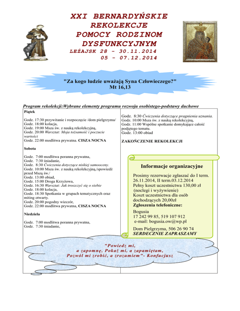 XXI BERNARDYŃSKIE REKOLEKCJE POMOCY RODZINOM DYSFUNKCYJNYM LEŻAJSK 28 - 30.11.2014 05 - 07.12.2014 "Za kogo ludzie uważają Syna Człowieczego?" Mt 16,13 Program rekolekcji:Wybrane elementy programu rozwoju osobistego-podstawy duchowe Piątek Godz. 17:30 przywitanie i rozpoczęcie /dom pielgrzyma/ Godz. 18:00 kolacja, Godz. 19:00 Msza św. z nauką rekolekcyjną, Godz. 20:00 Warsztat: Moja tożsamość i poczucie wartości Godz. 22:00 modlitwa prywatna. CISZA NOCNA Godz. 8:30 Ćwiczenia dotyczące pragnienia uznania. Godz. 10:00 Msza św. z nauką rekolekcyjną, Godz. 11:00 Wspólne spotkanie domykające całość podjętego tematu. Godz. 13:00 obiad ZAKOŃCZENIE REKOLEKCJI Sobota Godz. 7:00 modlitwa poranna prywatna, Godz. 7:30 śniadanie, Godz. 8:30 Ćwiczenia dotyczące niskiej samooceny. Godz. 10:00 Msza św. z nauką rekolekcyjną,/spowiedź przed Mszą św./ Godz. 13:00 obiad, Godz. 15:00 Droga Krzyżowa, Godz. 16:30 Warsztat: Jak troszczyć się o siebie Godz. 18:00 kolacja, Godz. 18:30 Spotkania w grupach tematycznych oraz miting otwarty. Godz. 20:00 pogodny wieczór, Godz. 22:00 modlitwa prywatna, CISZA NOCNA Niedziela Godz. 7:00 modlitwa poranna prywatna, Godz. 7:30 śniadanie, Informacje organizacyjne Prosimy rezerwacje zgłaszać do I term. 26.11.2014, II term.03.12.2014 Pełny koszt uczestnictwa 130,00 zł (noclegi i wyżywienie) Koszt uczestnictwa dla osób dochodzących 20,00zł Zgłoszenia telefoniczne: Bogusia 17 242 99 85, 519 107 912 e-mail: [email protected] Dom Pielgrzyma, 506 26 90 74 SERDECZNIE ZAPRASZAMY "Powiedz mi, a zapomnę, Pokaż mi, a zapamiętam, Pozwól mi zrobić, a zrozumiem"- Konfucjusz