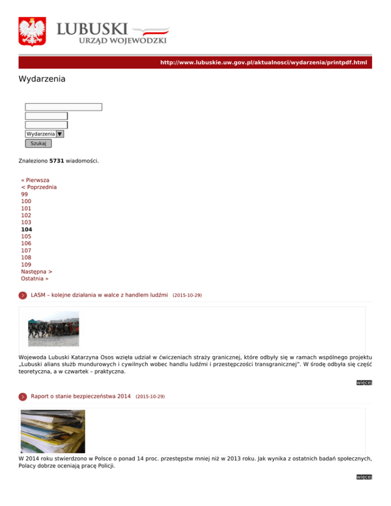 http://www.lubuskie.uw.gov.pl/aktualnosci/wydarzenia/printpdf.html Wydarzenia Wydarzenia ▼ Szukaj Znaleziono 5731 wiadomości. « Pierwsza < Poprzednia 99 100 101 102 103 104 105 106 107 108 109 Następna > Ostatnia » LASM – kolejne działania w walce z handlem ludźmi (2015-10-29) Wojewoda Lubuski Katarzyna Osos wzięła udział w ćwiczeniach straży granicznej, które odbyły się w ramach wspólnego projektu „Lubuski alians służb mundurowych i cywilnych wobec handlu ludźmi i przestępczości transgranicznej”. W środę odbyła się część teoretyczna, a w czwartek – praktyczna. więcej Raport o stanie bezpieczeństwa 2014 (2015-10-29) W 2014 roku stwierdzono w Polsce o ponad 14 proc. przestępstw mniej niż w 2013 roku. Jak wynika z ostatnich badań społecznych, Polacy dobrze oceniają pracę Policji. więcej E-Granica - innowacyjna aplikacja do pobrania (2015-10-29) "e-Granica" to całkowicie BEZPŁATNA, oficjalna aplikacja Lubuskiego Urzędu Wojewódzkiego w Gorzowie Wielkopolskim. więcej Karta Dużej Rodziny – zaproszenie dla partnerów (2015-10-29) Małe, średnie i duże firmy oraz instytucje zachęcamy do przyłączenia się do grona partnerów Karty Dużej Rodziny. więcej W Lubuskiem rusza cykl szkoleń dla pracowników socjalnych (2015-10-28) Z inicjatywy Ministra Pracy i Polityki Społecznej w czwartek, 29 października 2015 r. rozpoczyna się cykl szkoleń dla kadr pomocy społecznej, służących podniesieniu jej bezpieczeństwa. więcej Czad - niebezpieczeństwo jesienią i zimą (2015-10-28) Niebezpieczeństwo zatrucia tlenkiem węgla wynika z tego, że jest on bezwonny, bezbarwny i pozbawiony smaku. Blokuje dostęp tlenu do organizmu. więcej Nowy odcinek programu W obiektywie Wojewody (2015-10-28) Na antenie i portalu TVP Gorzów Wlkp. można obejrzeć relacje z działań aktualnie realizowanych przez Wojewodę Lubuskiego Katarzynę Osos i podległe służby. więcej Jak wyrobić dowód osobisty przez internet [e-usługi] (2015-10-27) Kończy się ważność Twojego dowodu osobistego? Pamiętaj, że możesz to zrobić przez internet. Watro poznać stronę www.obywatel.gov.pl. więcej Problem imigrantów i uchodźców oczami młodzieży (2015-10-27) Drugie spotkanie z licealistami z Sulechowa przygotowującymi się do debaty oksfordzkiej na temat problemów dotyczącymi pomocy rozwojowej oraz uchodźców i imigrantów za nami. więcej NIE JESTEŚ NA SPRZEDAŻ (2015-10-27) Wojewoda Lubuski informuje, że w ramach realizacji zadań ustawy o pomocy społecznej koordynuje działania w zakresie zapobiegania handlowi ludźmi oraz wsparcia udzielanego ofiarom handlu ludźmi. więcej « Pierwsza < Poprzednia 99 100 101 102 103 104 105 106 107 108 109 Następna > Ostatnia »