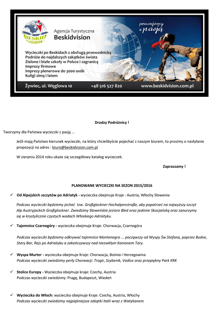 Drodzy Podróżnicy ! Tworzymy dla Państwa wycieczki z pasją ... Jeśli mają Państwo kierunek wycieczki, na który chcielibyście pojechać z naszym biurem, to prosimy o nasłyłanie propozycji na adres : [email protected] W sierpniu 2014 roku ukaże się szczegółowy katalog wycieczek. Zapraszamy ! PLANOWANE WYCIECZKI NA SEZON 2015/2016 Od Alpejskich szczytów po Adriatyk - wycieczka obejmuje Kraje : Austria, Włochy Słowenia Podczas wycieczki będziemy jechać tzw. Großglockner Hochalpenstraße, aby popatrzeć na najwyższy szczyt Alp Austryjackich Großglockner. Zwiedzimy Słoweńskie jezioro Bled oraz jaskinie Skocjańską oraz zanurzymy się w krystylicznie czystych wodach Włoskiego Adriatyku. Tajemnice Czarnogóry - wycieczka obejmuje Kraje: Chorwacja, Czarnogóra Podczas wycieczki będziemy odkrywać tajemnice Montenegro ... począwszy od Wyspy Św.Stefana, poprzez Budve, Stary Bar, Rejs po Adriatyku a zakończywszy nad niezwkłym Kanionem Tary. Wyspa Murter - wycieczka obejmuje Kraje: Chorwacja, Bośnia i Hercegowina Podczas wycieczki zwiedzimy perły Chorwacji: Trogir, Szybenik, Vodice oraz przepiękny Park KRK Stolice Europy - Wycieczka obejmuje kraje: Czechy, Austria Podczas wycieczki zwiedzimy: Pragę, Budapeszt, Wiedeń Wycieczka do Włoch: wycieczka obejmuje Kraje: Czechy, Austria, Włochy Podczas wycieczki zwiedzimy najpiękniejsze zakątki Italii wraz z Watykanem Wycieczka do Medjugorie - wycieczka obejmuje Kraje: Chorwacja, Bośnia i Hercegowica Podczas wycieczki zwiedzimy: Riviere Makarską, Dubrownik, Mostar, Split, wodospady Kravice Wyjazd narciarski w Alpy Francuskie: wycieczka obejmuje Kraje: Francja Będziemy stacjonować w bazie narciarskiej Le Grand Domaine Saint Francois Longchamp Wyjazd narciarski w Alpy Francuskie: wycieczka obejmuje Kraje: Francja Będziemy stacjonować w największej na świecie bazie narciarskiej - Trzy Doliny Litwa - wycieczka obejmuje Kraje: Litwa Podczas wycieczki zwiedzimy magiczną Litwe: Vilno, Kowno, Troki, Pożajście Białe szkoły w Beskidzie Żywieckim, Beskidzie Sądeckim oraz na Podhalu Zielone szkoły w Polsce oraz Chorwacji Wycieczki objazdowe po Polsce: Szlak Renesansu, Warszawa, Bieszczady, Beskidy, Warmia i Mazury