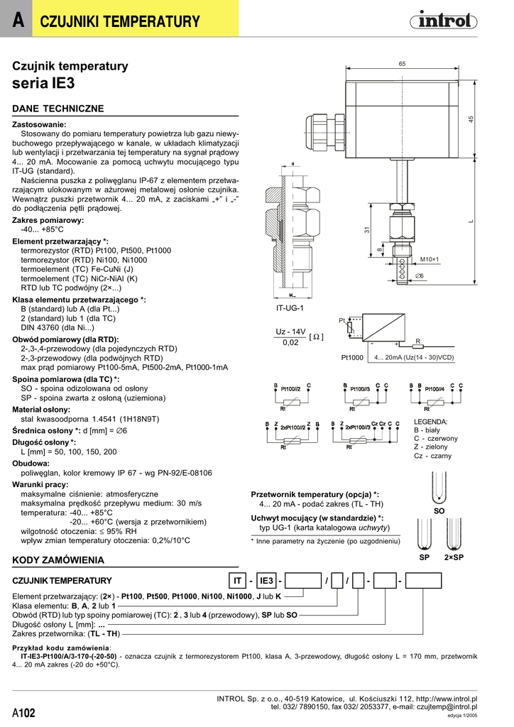 A CZUJNIKI TEMPERATURY 65 Czujnik temperatury CZUJNIK TEMPERATURY seria IE3 seria IE3 45 DANE DANE TECHNICZNE TECHNICZNE Zastosowanie: Stosowany do pomiaru temperatury powietrza lub gazu niewybuchowego przep³ywaj¹cego w kanale, w uk³adach klimatyzacji lub wentylacji i przetwarzania tej temperatury na sygna³ pr¹dowy 4... 20 mA. Mocowanie za pomoc¹ uchwytu mocuj¹cego typu IT-UG (standard). Nacienna puszka z poliwêglanu IP-67 z elementem przetwarzaj¹cym ulokowanym w a¿urowej metalowej os³onie czujnika. Wewn¹trz puszki przetwornik 4... 20 mA, z zaciskami + i - do pod³¹czenia pêtli pr¹dowej. 31 L Zakres pomiarowy: -40... +85°C 8 Element przetwarzaj¹cy *: termorezystor (RTD) Pt100, Pt500, Pt1000 termorezystor (RTD) Ni100, Ni1000 termoelement (TC) Fe-CuNi (J) termoelement (TC) NiCr-NiAl (K) RTD lub TC podwójny (2×...) M10×1 ∅6 Klasa elementu przetwarzaj¹cego *: B (standard) lub A (dla Pt...) 2 (standard) lub 1 (dla TC) DIN 43760 (dla Ni...) IT-UG-1 Pt Obwód pomiarowy (dla RTD): 2-,3-,4-przewodowy (dla pojedynczych RTD) 2-,3-przewodowy (dla podwójnych RTD) max pr¹d pomiarowy Pt100-5mA, Pt500-2mA, Pt1000-1mA Uz - 14V [Ω] 0,02 Pt1000 + R 4... 20mA (Uz(14 - 30)VCD) Spoina pomiarowa (dla TC) *: SO - spoina odizolowana od os³ony SP - spoina zwarta z os³on¹ (uziemiona) Materia³ os³ony: stal kwasoodporna 1.4541 (1H18N9T) rednica os³ony *: d [mm] = ∅6 LEGENDA: B - bia³y C - czerwony Z - zielony Cz - czarny D³ugoæ os³ony *: L [mm] = 50, 100, 150, 200 Obudowa: poliwêglan, kolor kremowy IP 67 - wg PN-92/E-08106 Warunki pracy: maksymalne cinienie: atmosferyczne maksymalna prêdkoæ przep³ywu medium: 30 m/s temperatura: -40... +85°C -20... +60°C (wersja z przetwornikiem) wilgotnoæ otoczenia: ≤ 95% RH wp³yw zmian temperatury otoczenia: 0,2%/10°C Przetwornik temperatury (opcja) *: 4... 20 mA - podaæ zakres (TL - TH) SO Uchwyt mocuj¹cy (w standardzie) *: typ UG-1 (karta katalogowa uchwyty) * Inne parametry na ¿yczenie (po uzgodnieniu) SP SPOSÓB OZNACZANIA I ZAMAWIANIA KODY ZAMÓWIENIA CZUJNIK TEMPERATURY IT - IE3 - / / - 2×SP - Element przetwarzaj¹cy: (2×) - Pt100, Pt500, Pt1000, Ni100, Ni1000, J lub K Klasa elementu: B, A, 2 lub 1 Obwód (RTD) lub typ spoiny pomiarowej (TC): 2 , 3 lub 4 (przewodowy), SP lub SO D³ugoæ os³ony L [mm]: ... Zakres przetwornika: (TL - TH) Przyk³ad kodu zamówienia: IT-IE3-Pt100/A/3-170-(-20-50) - oznacza czujnik z termorezystorem Pt100, klasa A, 3-przewodowy, d³ugoæ os³ony L = 170 mm, przetwornik 4... 20 mA zakres (-20 do +50°C). A102 INTROL Sp. z o.o., 40-519 Katowice, ul. Ko ściusz ki 112, http://www.introl.pl tel. 032/ 7890150, fax 032/ 2053377, e-mail: [email protected] edycja 1/2005