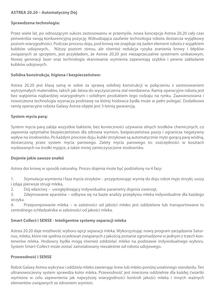 ASTREA 20.20 – Automatyczny Dój Sprawdzona technologia: Przez wiele lat, po odnoszącym sukces zastosowaniu w przemyśle, nowa koncepcja Astrea 20.20 cały czas potwierdza swoją konkurencyjną pozycję. Wzbudzająca zaufanie technologia robota dostarcza wyjątkowy poziom wiarygodności. Podczas procesu doju, pod krową nie znajduje się żaden element robota z wyjątkiem kubków udojowych.. Niższy poziom stresu, ale również redukcja ryzyka zranienia krowy i błędów związanych ze sprzętem, jest przykładem, że Astrea 20.20 jest niezaprzeczalnie systemem unikatowym. Nowej generacji laser oraz technologia skanowania wymienia zapewniają szybkie i pewne zakładanie kubków udojowych. Solidna konstrukcja, higiena i bezpieczeństwo: Astrea 20.20 jest klasą samą w sobie za sprawą solidnej konstrukcji w połączeniu z zastosowaniem wytrzymałych materiałów, takich jak: łatwa do wyczyszczenia stal nierdzewna. Ramię operacyjne robota jest bez wątpienia najbardziej wiarygodnym i solidnym produktem tego rodzaju na rynku. Zaawansowana i nowoczesna technologia wyznacza podstawę na której hodowca bydła może w pełni polegać. Dodatkowo ramię operacyjne robota Galaxy Astrea objęte jest 3-letnią gwarancją. System mycia parą: System mycia parą zabija wszystkie bakterie, bez konieczności używania silnych środków chemicznych, co zapewnia optymalne bezpieczeństwo dla zdrowia wymion, bezpieczeństwa paszy i ogranicza negatywny wpływ na środowisko. Po każdym procesie doju, kubki strzykowe są automatycznie myte gorącą parą wodną, dostarczoną przez system mycia parowego. Zalety mycia parowego to: oszczędności w kosztach wydawanych na środki myjące, a także mniej zanieczyszczone środowisko. Dojenie jakie zawsze znałeś Astrea doi krowę w sposób naturalny. Proces dojenia może być podzielony na 4 fazy: 1. Stymulacja wymienia i faza mycia strzyków – przygotowując wymię do doju robot myje strzyki, suszy i zdaja pierwsze strugi mleka, 2. Dój właściwy – uwzględniający indywidualne parametry dojenia zwierząt, 3. Zdejmowanie aparatów – odbywa się na bazie analizy przepływu mleka indywidualnie dla każdego strzyka. 4. Przepompowanie mleka – w zależności od jakości mleko jest oddzielane lub transportowane to centralnego schładzalnika w zależności od jakości mleka. Smart Collect i SENSE - Inteligentne systemy separacji mleka Astrea 20.20 daje możliwość wyboru opcji separacji mleka. Wykorzystując nowy program zarządzania Saturnus, mleko, które nie spełnia oczekiwań związanych z jakością zostanie zgromadzone w jednym z trzech kontenerów mleka. Hodowcy bydła mogą również oddzielać mleko na podstawie indywidualnego wyboru. System Smart-Collect może zostać zainstalowany niezależnie od robota udojowego. Przewodność i SENSE Robot Galaxy Astrea wykrywa i oddziela mleko zawierając krew lub mleko poniżej ustalonego standardu. Ten ultranowoczesny system sprawdza kolor mleka. Przewodność jest mierzona oddzielnie dla każdej ćwiartki wymiona w celu zapewnienia jak najwyższej wiarygodności kontroli jakości mleka i innych ważnych elementów związanych ze zdrowiem wymion. Karmienie krów i boks udojowy Przestronny boks udojowy z gumową podłogą gwarantuje maksymalny komfort krów. Bez stresu w przestronnym boksie (???). Stacja paszowa może dozować do 3 różnych typów paszy treściwej. Oprócz tego, stacja paszowa jest bardzo szybko i łatwo instalowana i montowana (???). Standardowe czujniki, przyjazne krowom sterowanie bramkami oraz otwarta konstrukcja zapewniająca doskonałą widoczność boksu udojowego i żywienia to praktyczne udogodnienia zarówno dla krów jak i dla hodowców. Wiarygodność Wiarygodność wynikająca z wysokiej jakości. Solidność konstrukcji wynika z wysokiej jakości ramienia operacyjnego Astrea 20.20, które jest objęte 3 letnią gwarancją. Niskie koszty konserwacji Konserwacja nigdy wcześniej nie była łatwiejsza. Centralna jednostka maszynowa pozwala na to, że konserwacja jest wykonywana podczas pracy systemu.. Wszystkie komponenty są stabilnie wykonane i łatwo dostępne. Niskie zużycie wody Nowa centralna jednostka udojowa bezpośrednio przyczynia się do bardzo efektywnego wewnętrznego mycia. Rezultatem jest niskie zużycie wody. Niskie zużycie energii Astrea 20.20 korzysta z jednego centralnego kompresora. Ramię robota wyposażone w jest w najnowsze elektryczne silniki, których oszczędność energetyczna jest oceniana przeciętnie na 35% . Dzięki unikatowej koncepcji ASTREA 20.20, ramię operacyjne robota jest w stanie kontrolować dwa boksy paszowe i udojowe jednocześnie. Dowolny ruch krów, nastawienie na opiekę nad zwierzętami Brak stresu, wszystkie zwierzęta mają swobodę. System ten jest wolny od presji i stresu, wszystkie zwierzęta mogą przystępować do boksu udojowego, kiedy mają na to ochotę. Dobrostan zwierząt i maksymalna produkcja mleka są wynikiem prostej koncepcji, która może być zastosowana w każdej oborze. Niezależnie czy koncentrujemy się na szybkiej i łatwej obsłudze czy maksymalnym komforcie krów, Astrea 20.20 może być zastosowana w każdym typie obory Nie ma to ujemnego wpływu na monitoring ruchu krów i produkcję najwyższej jakości mleka. Naturalna stymulacja przed-udojowa Tak jak wspomnieliśmy wcześniej nowa ASTREA korzysta z unikatowych i naturalnych zasad stymulacji przed-udojowej. Za pomocą dodatkowego, specjalnego kubka przygotowującego wymię do doju każdy strzyk jest myty i suszony indywidualnie. Masowanie każdego pojedynczego strzyka powoduje uwolnienie oksytocyny. Kubek przed-udojowy jest myty zawsze po każdej krowie, aby zapobiec przeniesieniu potencjalnego zakażenia na inne zwierzęta a tym samym zagwarantować ochronę wymion w całym stadzie. Wybieg Używając bramki selekcyjnej udoskonalonej i zastosowanej przez Insentec oraz specyficznych ustawień żywienia pastwiskowego w programie Saturnus bardzo łat