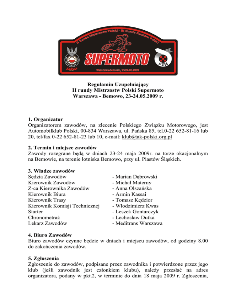 Regulamin Uzupełniający II rundy Mistrzostw Polski Supermoto Warszawa - Bemowo, 23-24.05.2009 r. 1. Organizator Organizatorem zawodów, na zlecenie Polskiego Związku Motorowego, jest Automobilklub Polski, 00-834 Warszawa, ul. Pańska 85, tel.0-22 652-81-16 lub 20, tel/fax 0-22 652-81-23 lub 10, e-mail: [email protected] 2. Termin i miejsce zawodów Zawody rozegrane będą w dniach 23-24 maja 2009r. na torze okazjonalnym na Bemowie, na terenie lotniska Bemowo, przy ul. Piastów Śląskich. 3. Władze zawodów Sędzia Zawodów Kierownik Zawodów Z-ca Kierownika Zawodów Kierownik Biura Kierownik Trasy Kierownik Komisji Technicznej Starter Chronometraż Lekarz Zawodów - Marian Dąbrowski - Michał Materny - Anna Olszańska - Armin Kassai - Tomasz Kędzior - Włodzimierz Kwas - Leszek Gontarczyk - Lechosław Dutka - Meditrans Warszawa 4. Biuro Zawodów Biuro zawodów czynne będzie w dniach i miejscu zawodów, od godziny 8.00 do zakończenia zawodów. 5. Zgłoszenia Zgłoszenie do zawodów, podpisane przez zawodnika i potwierdzone przez jego klub (jeśli zawodnik jest członkiem klubu), należy przesłać na adres organizatora, podany w pkt.2, w terminie do dnia 18 maja 2009 r. Zgłoszenia, które wpłyną po tym terminie (decyduje data stempla pocztowego lub wpływu faksu lub e-maila), traktowane będą jako złożone w II terminie. W zgłoszeniu należy podać imię i nazwisko kierownika ekipy lub teamu, upoważnionego do reprezentowania klubu/teamu wobec władz zawodów. Zawodnik zgłaszający się do zawodów musi przedłożyć w biurze zawodów: - certyfikat i licencję A (dla dyscypliny supermoto, wyścigi lub motocross/enduro), ważną na 2009 rok - książeczkę zdrowia sportowca z ważną zdolnością, potwierdzoną przez przychodnię sportowo-lekarską lub lekarza medycyna sportowej - wypełnioną kartę zgłoszenia - dowód wpłaty wpisowego W zawodach mogą startować zawodnicy zagraniczni, spełniający wymogi niniejszego regulaminu. Od zawodników nie jest wymagane posiadanie pozwolenia na prowadzenie pojazdów mechanicznych. Wpisowe do zawodów dla wszystkich klas wynosi: - przy zgłoszeniu złożonym w I terminie - 180 zł od zawodnika - przy zgłoszeniu złożonym w II terminie - 230 zł od zawodnika - za start w drugiej klasie - 90 zł od zawodnika - za zgłoszenie zespołu - 50 zł od zespołu (obowiązuje licencja sponsorska) Zawodnicy polscy, niebędący członkami PZM opłacają wpisowe podwyższone o 50%. 6. Odbiór techniczny Odbiór techniczny obejmuje sprawdzenie zgodności pojazdu i wyposażenia osobistego zawodnika z wymogami RSM i Regulaminem Ramowym Supermoto na 2009 rok. Na badanie techniczne zawodnik zobowiązany jest stawić się z kaskiem. Pojazdy i kaski, które przejdą pozytywnie badanie techniczne, powinny być oznakowane. Zawodnicy muszą posiadać odpowiednie wyposażenie indywidualne, tj. homologowany kask motocyklowy, rękawice, buty z wysoką cholewką i kombinezon zgodny z RSM. Każdy pojazd musi posiadać trzy numery startowe – jeden z przodu i dwa po obu jego bokach. Numery startowe nadaje organizator (wg kolejności zgłoszeń) i zapewnia możliwość ich nabycia. Numery raz nadane zawodnikowi obowiązują go do końca sezonu. Kolory tła i cyfr oraz zakres numerów startowych wg Regulaminu Ramowego Supermoto na 2009 rok. 7. Treningi Dla każdej klasy przeprowadzone będą dwa 15-minutowe treningi z pomiarem czasu. Warunkiem dopuszczenia do zawodów jest przejechanie w obu treningach łącznie minimum 5 krążeń trasy. Zawodnik startujący w dwóch klasach, musi przejechać w drugiej klasie dodatkowo minimum 3 okrążenia. 8. Zawody Zawody rozegrane będą w następujących klasach: - klasa S1 – motocykle o pojemności pow. 175cc do 250cc – 2T oraz pow. 290cc do 450cc – 4T, wiek zawodników od 15 lat - klasa OPEN – wiek zawodników od 17 lat, Wszystkie wyścigi rozgrywane będą na dystansie 15 minut + 2 okrążenia. Zawodnicy ustawieni będą na polach startowych wg czasów uzyskanych w treningach. W każdej klasie odbędą się dwa biegi. Możliwy jest start w jednym tylko biegu, z prawem do klasyfikacji. Zawodnicy będą sklasyfikowani w kolejności ukończenia wyścigu i liczby pełnych okrążeń, tzn. że wszyscy zawodnicy kończący to samo okrążenia co zwycięzca, będą sklasyfikowani w kolejności przekroczenia linii mety. W następnej kolejności zaś zawodnicy z jednym okrążeniem mniej, potem z dwoma okrążeniami mniej, itd. Zawodnicy muszą przejechać linię mety w ciągu pięciu minut po zwycięzcy, tzn. mają pięć minut na ukończenie okrążenia, albo nie będzie ono doliczone do ich wyników. Klasyfikacja zawodników, którzy nie ukończyli okrążenia w ciągu pięciu minut od przyjazdu zwycięzcy, będzie opierała się na liczbie ukończonych okrążeń, a w przypadku remisu - na podstawie kolejności ukończenia poprzedniego okrążenia. Zwycięzcą zawodów w danej klasie zostaje zawodnik, który uzyska największą ilość punktów, w obu biegach łącznie. W przypadku równej ilości punktów decyduje wynik drugiego biegu. Organizator wręczy pamiątkowe puchary trzem pierwszym zawodnikom w każdej klasie oraz wypłaci nagrody finansowe zgodnie z pkt. XIX Regulaminu Ramowego Supermoto na 2009 rok. Dekoracja trzech pierwszych zawodników każdej klasy odbędzie się na zakończenie zawodów. 9. Protesty Sposób składania protestów powinien być zgodny z RSM i Regulaminem Ramowym Supermoto na 2009 rok. Kaucja wymagana przy składaniu protestów wynosi 1000 zł w przypadku gdy konieczne jest rozbieranie pojazdu i 500 zł w pozostałych przypadkach. 10. Ubezpieczenie zawodów Zawody będą ubezpieczone od odpowiedzialności cywilnej OC, a osoby biorące udział w ich organizacji od NW. Organizator nie ponosi odpowiedzialności za szkody motocykli lub ich części powstałe w wyniku uczestnictwa w zawodach. 11. Uwagi końcowe Każdy uczestnik zobowiązany jest podporządkować się bezwzględnie polece