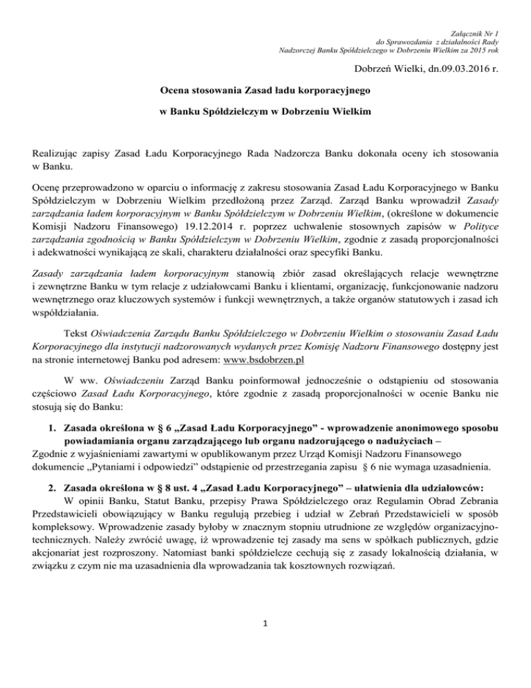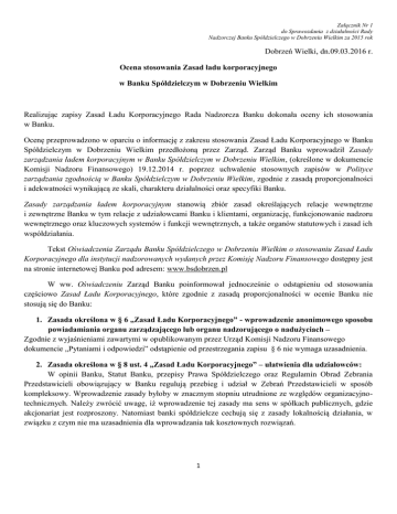 Załącznik Nr 1 do Sprawozdania z działalności Rady Nadzorczej Banku Spółdzielczego w Dobrzeniu Wielkim za 2015 rok Dobrzeń Wielki, dn.09.03.2016 r. Ocena stosowania Zasad ładu korporacyjnego w Banku Spółdzielczym w Dobrzeniu Wielkim Realizując zapisy Zasad Ładu Korporacyjnego Rada Nadzorcza Banku dokonała oceny ich stosowania w Banku. Ocenę przeprowadzono w oparciu o informację z zakresu stosowania Zasad Ładu Korporacyjnego w Banku Spółdzielczym w Dobrzeniu Wielkim przedłożoną przez Zarząd. Zarząd Banku wprowadził Zasady zarządzania ładem korporacyjnym w Banku Spółdzielczym w Dobrzeniu Wielkim, (określone w dokumencie Komisji Nadzoru Finansowego) 19.12.2014 r. poprzez uchwalenie stosownych zapisów w Polityce zarządzania zgodnością w Banku Spółdzielczym w Dobrzeniu Wielkim, zgodnie z zasadą proporcjonalności i adekwatności wynikającą ze skali, charakteru działalności oraz specyfiki Banku. Zasady zarządzania ładem korporacyjnym stanowią zbiór zasad określających relacje wewnętrzne i zewnętrzne Banku w tym relacje z udziałowcami Banku i klientami, organizację, funkcjonowanie nadzoru wewnętrznego oraz kluczowych systemów i funkcji wewnętrznych, a także organów statutowych i zasad ich współdziałania. Tekst Oświadczenia Zarządu Banku Spółdzielczego w Dobrzeniu Wielkim o stosowaniu Zasad Ładu Korporacyjnego dla instytucji nadzorowanych wydanych przez Komisję Nadzoru Finansowego dostępny jest na stronie internetowej Banku pod adresem: www.bsdobrzen.pl W ww. Oświadczeniu Zarząd Banku poinformował jednocześnie o odstąpieniu od stosowania częściowo Zasad Ładu Korporacyjnego, które zgodnie z zasadą proporcjonalności w ocenie Banku nie stosują się do Banku: 1. Zasada określona w § 6 „Zasad Ładu Korporacyjnego” - wprowadzenie anonimowego sposobu powiadamiania organu zarządzającego lub organu nadzorującego o nadużyciach – Zgodnie z wyjaśnieniami zawartymi w opublikowanym przez Urząd Komisji Nadzoru Finansowego dokumencie „Pytaniami i odpowiedzi” odstąpienie od przestrzegania zapisu § 6 nie wymaga uzasadnienia. 2. Zasada określona w § 8 ust. 4 „Zasad Ładu Korporacyjnego” – ułatwienia dla udziałowców: W opinii Banku, Statut Banku, przepisy Prawa Spółdzielczego oraz Regulamin Obrad Zebrania Przedstawicieli obowiązujący w Banku regulują przebieg i udział w Zebrań Przedstawicieli w sposób kompleksowy. Wprowadzenie zasady byłoby w znacznym stopniu utrudnione ze względów organizacyjnotechnicznych. Należy zwrócić uwagę, iż wprowadzenie tej zasady ma sens w spółkach publicznych, gdzie akcjonariat jest rozproszony. Natomiast banki spółdzielcze cechują się z zasady lokalnością działania, w związku z czym nie ma uzasadnienia dla wprowadzania tak kosztownych rozwiązań. 1 3. Zasady określone w § powiązanymi. 11 „Zasad Ładu Korporacyjnego” – transakcje z podmiotami Bank nie posiada podmiotów powiązanych w rozumieniu Ustawy z dnia 29 sierpnia 1997 r. Prawo bankowe, w związku z czym nie wprowadził zapisów dotyczących § 11 „Zasad Ładu Korporacyjnego” do Polityki. 4. Zasady określone w § 12 ust. 1 i 2 „Zasad Ładu Korporacyjnego” – dokapitalizowanie i dofinansowanie Banku przez udziałowców. W ocenie Banku zasady te nie dotyczą Banku, m.in. ze względu na fakt, iż aktualnie obowiązujące przepisy prawa nie dopuszczają możliwości zaliczenia funduszu udziałowego do funduszy własnych Banku tzw. CET I, co oznacza, iż nie ma możliwości skutecznego dokapitalizowania Banku. Ponadto obowiązek dostarczenia wsparcia finansowego wydaje się być racjonalny dla banków komercyjnych, gdzie występują udziałowcy większościowi. W przypadku Banku, który posiada dużą liczbę udziałowców będących osobami fizycznymi, nałożenie na nich dodatkowego obowiązku udzielenia wsparcia finansowego jest niewykonalne i nieracjonalne. W związku z powyższym Bank postanowił nie stosować zasad określonych w tych przepisach. 5. Zasady określone w § 22 ust. 1 i 2 „Zasad Ładu Korporacyjnego” – niezależność członków organów Banku. Zgodnie z Ustawą z dnia 16 września 1982 r. Prawo spółdzielcze, do organów spółdzielni mają prawo być wybierani jej członkowie. W związku z powyższym, Bank uznaje, iż zasady określone w przytoczonych przepisach, dot. niezależności członków organu nadzorującego, nie znajdują zastosowania do banku funkcjonującego w formie spółdzielni, jakim jest Bank. Jednocześnie Rada Nadzorcza stwierdza, że badanie bilansu w Banku przeprowadza rewident, który nie pełni funkcji członka Rady Nadzorczej Banku. biegły 6. Zasady określone w „Zasadach Ładu Korporacyjnego” dot. komitetu audytu oraz komórki audytu. Zgodnie z art. 86 ust. 2 pkt 4) Ustawy z dnia 7 maja 2009 r. o biegłych rewidentach i ich samorządzie, podmiotach uprawnionych do badania sprawozdań finansowych oraz o nadzorze publicznym, banki spółdzielcze nie mają obowiązku powoływania komitetu audytu, w związku z czym postanowienia Zasad w tym zakresie nie stosują się do Banku. 7. Zasady określone w rozdziale 9 „Wykonywanie uprawnień z aktywów nabytych na ryzyko klienta” „Zasad Ładu Korporacyjnego” 2 W związku z niewykonywaniem przez Bank działalności w zakresie określonym w Rozdziale 9, Bank nie wprowadził postanowień tego Rozdziału do swojej Polityki. W 2015 roku Bank przestrzegał Zasad Ładu Korporacyjnego z uwzględnieniem wyżej wymienionych wyłączeń m. in. dokonując stosownych zmian w regulacjach wewnętrznych: w Strategii Rozwoju Banku, w Polityce zarządzania zgodnością, w Regulaminie działania Zarządu, w Regulaminie działania Rady Nadzorczej w Regulaminie kontroli wewnętrznej. Bank dąży do zapewnienia jak największej transparentności swoich działań, należytej jakości komunikacji z klientami oraz ochrony praw udziałowców, także w materiałach nie regulowanych przepisami prawa. Rada Na