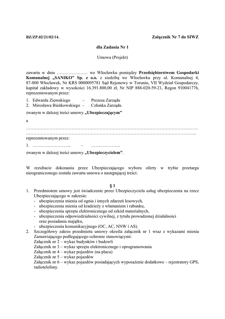 Załącznik Nr 7 do SIWZ BZ/ZP.02/21/02/14. dla Zadania Nr 1 Umowa (Projekt) zawarta w dniu ………………… we Włocławku pomiędzy Przedsiębiorstwem Gospodarki Komunalnej „SANIKO” Sp. z o.o. z siedzibą we Włocławku przy ul. Komunalnej 4, 87-800 Włocławek, Nr KRS 0000095781 Sąd Rejonowy w Toruniu, VII Wydział Gospodarczy, kapitał zakładowy w wysokości 16.391.800,00 zł, Nr NIP 888-020-59-21, Regon 910041776, reprezentowanym przez: 1. Edwarda Ziemskiego – 2. Mirosława Bieńkowskiego – Prezesa Zarządu Członka Zarządu zwanym w dalszej treści umowy „Ubezpieczającym” a ……………………………………………………………………………………………………… …………………………………………………………………………………………………….. reprezentowanym przez: 1. …………………….. – ……………….. zwanym w dalszej treści umowy „Ubezpieczycielem”. W rezultacie dokonania przez Ubezpieczającego wyboru oferty w trybie przetargu nieograniczonego została zawarta umowa o następującej treści: 1. 2. §1 Przedmiotem umowy jest świadczenie przez Ubezpieczyciela usług ubezpieczenia na rzecz Ubezpieczającego w zakresie: - ubezpieczenia mienia od ognia i innych zdarzeń losowych, - ubezpieczenia mienia od kradzieży z włamaniem i rabunku, - ubezpieczenia sprzętu elektronicznego od szkód materialnych, - ubezpieczenia odpowiedzialności cywilnej, z tytułu prowadzonej działalności oraz posiadania majątku, - ubezpieczenia komunikacyjnego (OC, AC, NNW i AS). Szczegółowy zakres przedmiotu umowy określa załącznik nr 1 wraz z wykazami mienia Zamawiającego podlegającego ochronie stanowiącymi: Załącznik nr 2 – wykaz budynków i budowli Załącznik nr 3 – wykaz sprzętu elektronicznego i oprogramowania Załącznik nr 4 – wykaz pojazdów (na placu) Załącznik nr 5 – wykaz pojazdów Załącznik nr 6 – wykaz pojazdów posiadających wyposażenie dodatkowe – rejestratory GPS, radiotelefony. 1. 2. §2 Termin realizacji umowy obejmuje okres 1 roku - 1 rok od dnia następnego po którym wygasają ważne umowy ubezpieczenia. Okresy obowiązywania ubezpieczeń precyzuje załącznik nr 1, 4 i 5 do Umowy. §3 Ubezpieczyciel zobowiązany jest do: 1. Wystawiania polis ubezpieczeniowych dla ubezpieczeń będących przedmiotem umowy dla których kończy się okres ubezpieczeniowy. Polisy winny spełniać wymogi określone w niniejszej umowie. 2. Dostarczania polis ubezpieczeniowych do siedziby Ubezpieczającego w terminie najpóźniej na 7 dni przed początkiem okresu obowiązywania, zgodnie z załącznikami do niniejszej umowy. 3. Ubezpieczający dopuszcza w ubezpieczeniu komunikacyjnym dostarczenia polisy zbiorczej obejmującej całą flotę pojazdów Ubezpieczającego. 4. Ponoszenia odpowiedzialności za ubezpieczone mienie Ubezpieczającego do terminu przypadającego na zapłacenie składki przez Ubezpieczającego. 5. Zagwarantowania stałości składek określonych w załącznikach 7 i 8 do Umowy. 6. Rozszerzenia zakresu ochrony ubezpieczeniowej o klauzule określone w załączniku nr 9 do Umowy. 7. Stosowania franszyz w wysokości i rodzaju określonych w załączniku nr 10 do Umowy. 8. Zwrotu składki za okres niewykorzystanej ochrony ubezpieczeniowej w przypadku wygaśnięcia stosunku ubezpieczeniowego przed upływem okresu, na jaki polisa została zawarta. 1. 2. 3. §4 Strony ustalają, że obowiązującą formą wynagrodzenia za wykonanie przedmiotu umowy, o którym mowa w § 1 jest wynagrodzenie niezmienne w okresie ważności umowy określone zgodnie z formularzem zestawienia składek stanowiącym załącznik nr 7 do umowy, na kwotę: …………………….. (słownie:…….…………………………………………………. ……………………………………………………………………………………………….). Przedmiot umowy zwolniony jest z podatku VAT – zgodnie z załącznikiem nr 4 do ustawy z dnia 11 marca 2004 r. o podatku od towarów i usług (Dz. U. z 2004 r., Nr 54, poz. 535 z późn. zm.), o którym mowa w Dziale VIII, Rozdz. 2 art. 43. Cena umowy zawiera całkowity koszt realizacji przedmiotu umowy i obejmuje wszystkie koszty związane z realizacją zadania niezbędne do jego prawidłowego wykonania, z uwzględnieniem wszystkich opłat i podatków, koszty dostarczania polis ubezpieczeniowych Ubezpieczającemu. §5 1. Zapłata wynagrodzenia, o którym mowa w § 4 ust. 1 niniejszej umowy będzie następowała w częściach na podstawie otrzymywanych polis ubezpieczeniowych wystawionych przez Ubezpieczyciela w oparciu o stawki określone w zestawieniach stanowiących załącznik nr 8 i 9 do umowy. 2. Płatność składek będzie dokonywana przelewem na rachunek bankowy Ubezpieczyciela w terminie 30 dni od daty wystawienia polisy przez Ubezpieczyciela a w przypadku polisy zbiorczej na ubezpieczenia komunikacyjne w terminie 30 dni od daty rozpoczęcia ochrony ubezpieczeniowej. 2 §6 1. Ustaloną przez strony formą odszkodowania za nienależyte wykonanie umowy będą kary umowne. 2. Ubezpieczyciel zobowiązany jest do zapłaty Ubezpieczającemu kar umownych w następujących przypadkach: a) Za niedotrzymanie terminu, określonego w § 3 ust. 2 Ubezpieczyciel zapłaci karę umowną w wysokości 2% składki ubezpieczeniowej, należnej od pojazdu, za każdy dzień opóźnienia w dostarczeniu polisy ubezpieczeniowej. b) Za odstąpienie od umowy z przyczyn zależnych od Ubezpieczyciela – kara umowna w wysokości 5% wartości przedmiotu umowy, o której mowa w § 4 ust. 1 niniejszej umowy. 3. Ubezpieczający jest zobowiązany do zapłaty Ubezpieczycielowi kary umownej w wysokości 5% wartości przedmiotu umowy, o której mowa w § 4 ust. 1 niniejszej umowy w razie odstąpienia Ubezpieczającego od umowy z powodu okoliczności za które odpowiada Ubezpieczający. 4. Ubezpieczający zastrzega sobie prawo dochodzenia odszkodowa