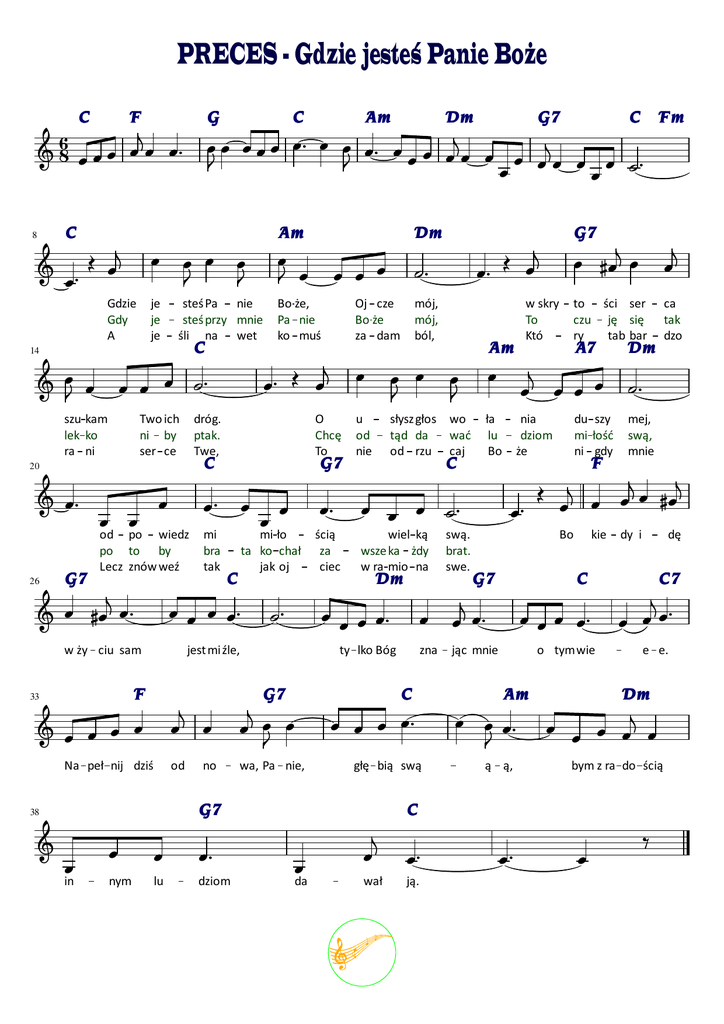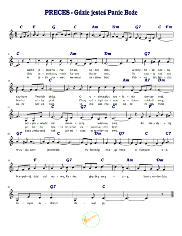 PRECES - Gdzie jesteś Panie Boże C F G 6 8 C Am Gdzie Gdy A je je je Bo że, Pa nie ko muś steś Pa nie steś przy mnie śli na wet C Two ich ni by ser ce dróg. ptak. Twe, mi bra tak mi ło ta ko chał jak oj C w ży ciu sam u od nie Na peł nij dziś w skry To Któ to ści ser czu ję się ry tab bar ca tak dzo A7 ła lu Bo C nia dziom że du szy mi łość ni gdy F Dm mej, swą, mnie G7 od wa, Pa nie, no ścią za ciec wiel ką wsze ka żdy w ra mio na Dm ty lko Bóg dziom G7 zna jąc mnie głę bią swą kie dy i dę C o tym wie Am ą ą, C7 e e. Dm bym z ra do ścią C wał ją. lu Bo swą. brat. swe. C nym Am słysz głos wo tąd da wać od rzu caj G7 38 in G7 mój, mój, ból, jest mi źle, F Fm od po wiedz po to by Lecz znów weź 33 G7 G7 C Oj cze Bo że za dam O Chcę To C 20 szu kam lek ko ra ni G7 Dm 14 26 Dm C 8 Am da C