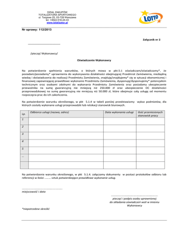 DZIAŁ ZAKUPÓW TOTALIZATORA SPORTOWEGO ul. Targowa 25, 03-728 Warszawa tel. +4822-518-24-43 www.totalizator.pl Nr sprawy: 112/2013 Załącznik nr 2 _____________________ /pieczęć Wykonawcy/ Oświadczenie Wykonawcy Na potwierdzenie spełnienia warunków, o których mowa w pkt.5.1 oświadczam/oświadczamy*, że posiadam/posiadamy* uprawnienia do wykonywania działalności obejmującej Przedmiot Zamówienia, niezbędną wiedzę i doświadczenia do realizacji Przedmiotu Zamówienia, znajduję/znajdujemy* się w sytuacji ekonomicznej i finansowej zapewniającej prawidłowe wykonanie Przedmiotu Zamówienia, dysponuję/dysponujemy* potencjałem technicznym oraz osobami zdolnymi do wykonania Przedmiotu Zamówienia oraz posiadamy ubezpieczenie przewoźnika na sumę gwarancyjną nie mniejszą niż 250.000 zł oraz ubezpieczenie OC działalności przeprowadzkowej na sumę gwarancyjną nie mniejszą niż 50.000 zł, które obejmuje całą usługę od momentu rozpoczęcia prac do ich zakończenia. Na potwierdzenie warunku określonego, w pkt 5.1.4 w tabeli poniżej przedstawiamy wykaz podmiotów, dla których zostały wykonane usługi przeprowadzki lub relokacji stanowisk biurowych. Lp. Odbiorca usługi (nazwa, adres) Data wykonania usługi Ilość przeniesionych stanowisk pracy 1 2 3 4 5 … Na potwierdzenie warunku określonego, w pkt 5.1.4. załączamy dokumenty w postaci protokołów odbioru lub referencji w ilości ……… sztuk potwierdzające prawidłowe wykonanie usług. .................................................... miejscowość i data ............................................................ pieczęć i podpis osoby uprawnionej do składania oświadczeń woli w imieniu Wykonawcy *niepotrzebne skreślić DZIAŁ ZAKUPÓW TOTALIZATORA SPORTOWEGO ul. Targowa 25, 03-728 Warszawa tel. +4822-518-24-43 www.totalizator.pl Nr sprawy: 112/2013 Załącznik Nr 4 Opis Przedmiotu Zamówienia 1. Przedmiotem zamówienia jest wykonie kompleksowej usługi przeprowadzki Stanowisk Pracy w podziale na Etapy tj.: 1.1. ETAP I - przeprowadzka z ul. Targowej 25 na ul. Kijowską 1 a. Zespół 1 – ilość osób - 3, b. Zespół 2 – ilość osób - 5, c. Zespół 3 – ilość osób - 2, d. Zespół 4 – ilość osób – 15 planowany termin przeprowadzki 29-30.06.2013 e. Zespół 2 – ilość osób - 29, f. Zespół 3 – ilość osób - 13, planowany termin przeprowadzki 27-28.07.2013 g. Zespół 1 – ilość osób – 41 planowany termin przeprowadzki 3-4.08.2013 Ponadto Etap I przewiduje przeniesienie: a. 5 szt. lodówek b. 5 szt. drukarko – kopiarek c. 41 szt. szaf metalowych i sejfów d. 5 stołów konferencyjnych 1.2. ETAP II – Relokacja w ramach Kijowskiej 1 a. Przeniesienie Zespołu 1 – ilość osób -15 z III p. na V p. planowany termin przeprowadzki 10.08.2013 Ponadto Etap II przewiduje przeniesienie: a. 6 szt. szaf metalowych i sejfów 1.3. ETAP III – relokacja w ramach Kijowskiej 1 a. Przeniesienie Zespołu 1 – ilość osób - 8 + sala konferencyjna oraz kuchnia w ramach II p. planowany termin przeprowadzki 05-06.10.2013 b. Powrót Zespołu 1– ilość osób - 8 + sala konferencyjna oraz kuchnia w ramach II p. planowany termin przeprowadzki termin 09-10.11.2013 Ponadto Etap III przewiduje przeniesienie: a. 1 szt. lodówki b. 1 szt. drukarko – kopiarki c. 3 szt. szaf metalowych i sejfów 1.4. ETAP IV – Przeprowadzka z ul. Targowej 34 na ul. Kijowską 1 a. Zespół 1 – ilość osób – 12 planowany termin przeprowadzki 16-17.11.2013 b. Zespół 2 – ilość osób – 5 planowany termin przeprowadzki 16-17.11.2013 Ponadto Etap III przewiduje przeniesienie: d. 2 szt. lodówek 1.5. ETAP V – Przeprowadzka z ul. Kijowskiej 1 na ul. Targową 25 a. Zespół 1 – ilość osób - 3 DZIAŁ ZAKUPÓW TOTALIZATORA SPORTOWEGO ul. Targowa 25, 03-728 Warszawa tel. +4822-518-24-43 www.totalizator.pl Nr sprawy: 112/2013 b. c. d. Zespół 2 – ilość osób – 5 Zespół 3 – ilość osób – 2 Zespół 4 – ilość osób -15 planowany termin przeprowadzki 18-19.01.2014 e. Zespół 1 – ilość osób - 13, f. Zespół 2 – ilość osób – 9 planowany termin przeprowadzki 25-26.01.2014 Ponadto Etap V przewiduje przeniesienie: a. 3 szt. lodówek b. 3 szt. drukarko – kopiarek c. 31 szt. szaf metalowych i sejfów d. 5 stołów konferencyjnych 1.6. ETAP VI - Przeprowadzka z ul. Targowej 34 na ul. Kijowską 1 a. Zespół 1 – ilość osób – 23 planowany termin przeprowadzki 01-02.02.2014 b. Zespół 1 – ilość osób – 13 c. Zespół 2 – ilość osób – 4, d. Zespół 3 – ilość osób – 2 planowany termin przeprowadzki 08-09.02.2014 Ponadto Etap VI przewiduje przeniesienie: a. 6 szt. lodówek b. 4 szt. drukarko – kopiarek c. 9 szt. szaf metalowych i sejfów 1.7 ETAP VII – Relokacja w ramach ul. Kijowskiej 1 a. Zespół 1 – ilość osób - 9 z I p. na V p. planowany termin przeprowadzki 15-16.01.2014 Ponadto Etap VI przewiduje przeniesienie: a. 1 szt. lodówki b. 1 szt. drukarko – kopiarki 1.8 ETAP VIII– Relokacja w ramach ul. Kijowskiej 1 a. Zespół 1 – ilość osób - 7 – relokacja w ramach I p. planowany termin przeprowadzki 22-23.02.2014 2. W ramach każdego z Etapów Wykonawca będzie zobowiązany do przeniesienia takich elementów wyposażenia jak 2.1. Sprzęt RTV, Kuchenki mikrofalowe, 2.2. Tablice magnetyczne, korkowe, kalendarze, ramki, obrazy, 2.3. Kwiaty, 2.4. Niszczarki, 2.5. Krzesła i stoliki konferencyjne, 2.6. Akcesoria biurowe – kuwety, piórniki i ich wyposażenie, 2.7. Inne drobne meble i akcesoria. 3. Zamawiający wyjaśnia, że nie jest w stanie na danym etapie przewidzieć dokładnie (precyzyjnie) ilości Etapów przewidzianych do wykonania usługi przeprowadzki lub relokacji. Szacunkowa ilość 8 Etapów wynika z ogólnych przewidywań w tym zakresie a ich ostateczna ilość zostanie określona na etapie składania Zleceń zastrzeżeniem, że ich ilość może ulec zmniejszenie w ilości nie większej niż 2 Etapy. DZIAŁ Z