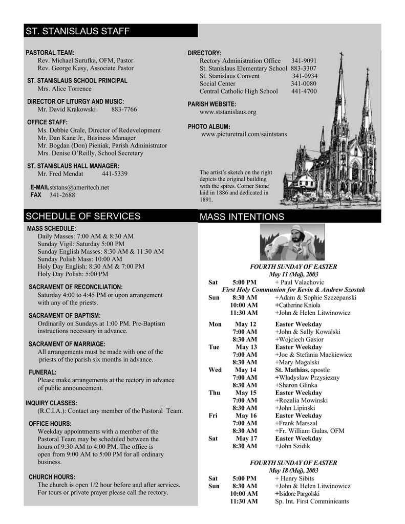 ST. STANISLAUS STAFF PASTORAL TEAM: Rev. Michael Surufka, OFM, Pastor Rev. George Kusy, Associate Pastor ST. STANISLAUS SCHOOL PRINCIPAL Mrs. Alice Torrence DIRECTORY: Rectory Administration Office St. Stanislaus Elementary School St. Stanislaus Convent Social Center Central Catholic High School DIRECTOR OF LITURGY AND MUSIC: Mr. David Krakowski 883-7766 PARISH WEBSITE: www.ststanislaus.org OFFICE STAFF: Ms. Debbie Grale, Director of Redevelopment Mr. Dan Kane Jr., Business Manager Mr. Bogdan (Don) Pieniak, Parish Administrator Mrs. Denise O’Reilly, School Secretary ST. STANISLAUS HALL MANAGER: Mr. Fred Mendat 441-5339 [email protected] FAX 341-2688 SCHEDULE OF SERVICES MASS SCHEDULE: Daily Masses: 7:00 AM & 8:30 AM Sunday Vigil: Saturday 5:00 PM Sunday English Masses: 8:30 AM & 11:30 AM Sunday Polish Mass: 10:00 AM Holy Day English: 8:30 AM & 7:00 PM Holy Day Polish: 5:00 PM SACRAMENT OF RECONCILIATION: Saturday 4:00 to 4:45 PM or upon arrangement with any of the priests. SACRAMENT OF BAPTISM: Ordinarily on Sundays at 1:00 PM. Pre-Baptism instructions necessary in advance. SACRAMENT OF MARRIAGE: All arrangements must be made with one of the priests of the parish six months in advance. FUNERAL: Please make arrangements at the rectory in advance of public announcement. INQUIRY CLASSES: (R.C.I.A.): Contact any member of the Pastoral Team. OFFICE HOURS: Weekday appointments with a member of the Pastoral Team may be scheduled between the hours of 9:30 AM to 4:00 PM. The office is open from 9:00 AM to 5:00 PM for all ordinary business. CHURCH HOURS: The church is open 1/2 hour before and after services. For tours or private prayer please call the rectory. 341-9091 883-3307 341-0934 341-0080 441-4700 PHOTO ALBUM: www.picturetrail.com/saintstans The artist’s sketch on the right depicts the original building with the spires. Corner Stone laid in 1886 and dedicated in 1891. MASS INTENTIONS FOURTH SUNDAY OF EASTER May 11 (Maj), 2003 Sat 5:00 PM + Paul Valachovic First Holy Communion for Kevin & Andrew Szostak Sun 8:30 AM +Adam & Sophie Szczepanski 10:00 AM +Catherine Kniola 11:30 AM +John & Helen Litwinowicz Mon Tue Wed Thu Fri Sat Sat Sun May 12 7:00 AM 8:30 AM May 13 7:00 AM 8:30 AM May 14 7:00 AM 8:30 AM May 15 7:00 AM 8:30 AM May 16 7:00 AM 8:30 AM May 17 8:30 AM Easter Weekday +John & Sally Kowalski +Wojciech Gasior Easter Weekday +Joe & Stefania Mackiewicz +Mary Magalski St. Mathias, apostle +W³adys³aw Przysiezny +Sharon Glinka Easter Weekday +Rozalia Mowinski +John Lipinski Easter Weekday +Frank Marszal +Fr. William Gulas, OFM Easter Weekday +John Szidik FOURTH SUNDAY OF EASTER May 18 (Maj), 2003 5:00 PM + Henry Sibits 8:30 AM +John & Helen Litwinowicz 10:00 AM +Isidore Pargolski 11:30 AM Sp. Int. First Comminicants MUSIC – FOURTH SUNDAY OF EASTER ENGLISH MASS Procession Offertory: Communion: Recessional: POLSKA MSZA ŒWIÊTA Christ The Lord Is Risen Today #186 On This Day, O Beautiful Mother #250 Body of Christ, Blood of Christ Virgin Full Of Grace #251 Procesja Ofiarowanie: Na Komuniê: Zakoñczenie SCHEDULE FOR THE WEEK Mon Tue Wed Thu Sat Sun 9:00 AM Avilas pray for vocations in church. 6:45 PM Bingo in the Social Center. 7:00 PM RCIA — Don Pieniak and Marilyn Mosinski will talk about the Church. 7:00 PM Rectory Task Force meets in convectory. 7:00 PM Worship Commission meets in convectory. 7:00 PM P.T.U. Meeting, in the Social Center. Installation of new officers. 9:30 AM Confessions for School Children in church. 6:00 PM Próba chóru w kosciele. 6:30 PM Youth Group in the all purpose room. 6:30 PM Polish Festival planning meeting in convectory. 7:00 PM English Choir meets in church. 8:00 PM A.A. & Al-Anon in the social center. 7:00 PM Education Commission meets in convectory. 4:00 PM Church Cleanup Crew works until 5:15, followed by fellowship. 4:00 PM Sacrament of Reconciliation until 4:45. 6:30 PM Parish Meeting about the rectory restoration, in the All-Purpose Room. All Masses Poppy Sale for veterans of foreign wars. 11:30 AM First Holy Communion at Mass. 1:00 PM Golden Agers Spring Social in the social center. WEDDING BANNS Brian Fitzsimons & Jennifer Mantessi (III) Matka #201 Chwalcie ³¹ki umajone #203 Panie, dobry jak chleb #162 Matko, ja wielbiê Ciê #232 Our Lady of Czêstochowa By now you will have seen the latest addition to the shrine of Our Lady of Czêstochowa, that of the new/old shrine which houses the relic of our patron, St. Stanislaus. Our intent was never to diminish the importance of the Black Madonna, but rather augment her elevated role in the history of our ancestors. As Fr. Jerzy pointed out in last week’s bulletin, Mary holds such an important position in the spiritual consciousness of the nation that she was actually crowned Queen of Poland in 1656, the historical period known as the Swedish invasion of Poland. Czêstochowa played a prominent role in this war with the Swedes attempting to capture the monastery. Officially, the reborn Polish State petitioned the Vatican to formally acknowledge Mary’s title as her Queen, such official acknowledgement having been granted in 1923. The icon referred to as the Black Madonna is often he object of numerous inaccurate conjectures regarding various aspects of that most holy representation of the Mother of God. Take, for example, the color. The reason the painting is so dark is primarily due to quite natural causes, having been painted on either teak or mahogany, both woods that carry a darker pigment in their makeup. In addition to this fact there is also the fact of years of incense and candle smoke which contributed to the discoloration. Likewise, the scars on her face were put there in 1430 by the invading Hussites, an actual historical fact. So much to learn, so little time! David Krakowski SCHEDULE FOR MINISTERS PARISH SUPPORT May 18 (Maj), 2003, Fourth Sunday of Easter Sat 5:00 PM Lector— Rob Jagelewski Euch. Min. — Connie Aliff, R. Drewnowski, Rebecca O’Reilly, Sally Davis Sun 8:30 AM Lec