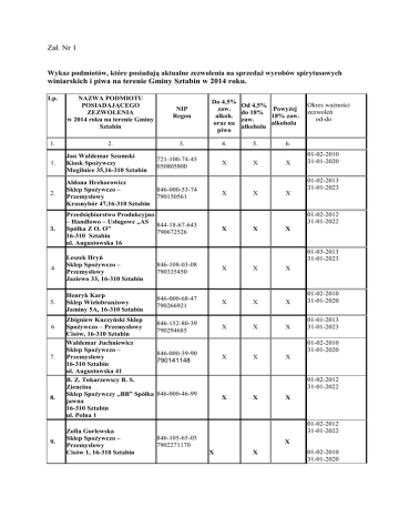 Zał. Nr 1 winiarskich i piwa na terenie Gminy Sztabin w 2014 roku.