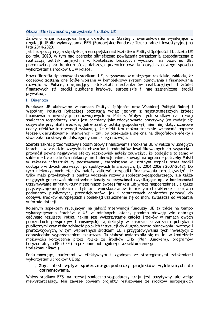 Obszar Efektywność wykorzystania środków UE Zarówno wizja rozwojowa kraju określona w Strategii, uwarunkowania wynikające z regulacji UE dla wykorzystania EFSI (Europejskie Fundusze Strukturalne i Inwestycyjne) na lata 2014-2020, jak i rozpoczynająca się dyskusja europejska nad kształtem Polityki Spójności i budżetu UE po roku 2020, w tym nad potrzebą silniejszego powiązania zarządzania gospodarczego z realizacją polityk unijnych i w kontekście bieżących wydarzeń na poziomie UE, przemawiają za koniecznością dalszego przeorientowania dotychczasowego sposobu wykorzystania środków UE w Polsce. Nowa filozofia dysponowania środkami UE, zarysowana w niniejszym rozdziale, zakłada, że docelowo zostaną one ściśle wpisane w kompleksowy system planowania i finansowania rozwoju w Polsce, obejmujący całokształt mechanizmów realizacyjnych i źródeł finansowych (tj. środki publiczne krajowe, europejskie i inne zagraniczne, środki prywatne). I. Diagnoza Fundusze UE alokowane w ramach Polityki Spójności oraz Wspólnej Polityki Rolnej i Wspólnej Polityki Rybackiej pozostają wciąż jednym z najistotniejszych źródeł finansowania inwestycji prorozwojowych w Polsce. Wpływ tych środków na rozwój społeczno-gospodarczy kraju jest oceniany jako zdecydowanie pozytywny (co wydaje się oczywiste przy skali środków, jakie zasiliły polską gospodarkę), niemniej dotychczasowe oceny efektów interwencji wskazują, że efekt ten można znacznie wzmocnić poprzez lepsze ukierunkowanie interwencji – tak, by przekładała się ona na długofalowe efekty i stwarzała podstawy do dalszego dynamicznego rozwoju. Szeroki zakres przedmiotowy i podmiotowy finansowania środkami UE w Polsce w ubiegłych latach - w zasadzie wszystkich obszarów i podmiotów kwalifikowalnych do wsparcia przyniósł pewne negatywne efekty (aczkolwiek należy zauważyć, że podejście to samo w sobie nie było do końca niekorzystne i nieracjonalne, z uwagi na ogromne potrzeby Polski w zakresie infrastruktury podstawowej, zaspokajane w istotnym stopniu przez środki dostępne w dwóch pierwszych perspektywach finansowych, tj. 2004-2006 i 2007-2013). Do tych niekorzystnych efektów należy zaliczyć przypadki finansowania przedsięwzięć nie tylko mało przydatnych z punktu widzenia rozwoju społeczno-gospodarczego, ale także mogących generować niepotrzebne koszty w przyszłości (wynikające np. z konieczności utrzymywania infrastruktury niepełniącej swojej funkcji lub wręcz niepotrzebnej), a także przyzwyczajenie polskich instytucji i wnioskodawców (o różnym charakterze – zarówno podmiotów publicznych, przedsiębiorców, jak i ostatecznych odbiorców pomocy) do dopływu środków europejskich i poniekąd uzależnienie się od nich, zwłaszcza od wsparcia w formie dotacji. Kolejnym aspektem rzutującym na jakość interwencji funduszy UE (a także na tempo wykorzystywania środków z UE w minionych latach, pomimo niewątpliwie dobrego ogólnego rezultatu Polski, jakim jest wykorzystanie całości środków w ramach dwóch poprzednich perspektyw finansowych) są deficyty w zakresie zarządzania politykami publicznymi oraz niska zdolność polskich instytucji do długofalowego planowania inwestycji prorozwojowych, w tym wspieranych środkami UE i przygotowywania tych inwestycji z odpowiednim wyprzedzeniem czasowym. Ta słabość uwidoczniła się m. in. w kontekście możliwości korzystania przez Polskę ze środków EFIS (Plan Junckera), programów horyzontalnych KE i CEF (na poziomie puli ogólnej oraz sektora energii i telekomunikacji). Podsumowując, barierami w efektywnym i zgodnym ze strategicznymi założeniami wykorzystaniu środków UE są: 1. Zbyt niski wpływ społeczno-gospodarczy projektów wybieranych do dofinansowania. Wpływ środków EFSI na rozwój społeczno-gospodarczy kraju jest pozytywny, ale wciąż niewystarczający. Nie zawsze bowiem projekty realizowane ze środków europejskich przyczyniają się do wzrostu gospodarczego rozumianego jako np.: generowanie nowych miejsc pracy, zwiększanie dochodów podmiotów gospodarczych, wzrost innowacyjności. Także projekty wchodzące w zakres podejścia terytorialnego dedykowanego obszarom wiejskim, Polsce Wschodniej, miastom wojewódzkim i ich obszarom funkcjonalnym, czy miastom i dzielnicom wymagającym rewitalizacji, realizowane są bardzo często bez powiazania z sytuacją społeczno-gospodarczą i zapewnienia komplementarności pomiędzy różnymi typami działań i funduszami, a także przy niskim poziomie koordynacji pomiędzy podobnymi działaniami realizowanymi w różnych regionach kraju. Negatywnym zjawiskiem jest również zastępowanie środków krajowych przez środki UE w obszarach, które co do zasady powinny być finansowane ze środków krajowych/lokalnych. Doświadczenia pierwszego okresu wdrażania interwencji na lata 2014-2020 pokazują, że w praktyce dotychczasowe procedury naborów nie zawsze przekładały się na wybór projektów optymalnych z punktu widzenia realizacji celów założonych w programach. Przyczyną tego stanu rzeczy są m. in.: • niska umiejętność planowania naborów i organizowanie naborów niesprofilowanych pod kątem kluczowych branż i technologii, • zbyt duża liczba kryteriów i ich niska wartość różnicująca, • niewystarczająca podaż dobrej jakości projektów w części obszarów. 2. Niska efektywność stosowanych form udzielanego wsparcia W poprzednich perspektywach finansowych polskie instytucje i wnioskodawcy przyzwyczaili się do wsparcia udzielanego w formie dotacji, co skutkuje obecnie niewielką gotowością do ubiegania się o dofinansowanie oparte na bardziej restrykcyjnych zasadach np. w formie wsparcia zwrotnego, którego zaletą – obok możliwości wielokrotnego wykorzystania tych samych środków w gospodarce- jest także większa świadomość i odpowiedzialność po stronie beneficjenta w zakresie celów podejmowanych działań, wy