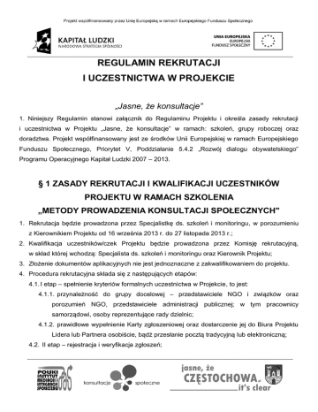 REGULAMIN REKRUTACJI I UCZESTNICTWA W PROJEKCIE „Jasne, że konsultacje” 1. Niniejszy Regulamin stanowi załącznik do Regulaminu Projektu i określa zasady rekrutacji i uczestnictwa w Projektu „Jasne, że konsultacje” w ramach: szkoleń, grupy roboczej oraz doradztwa. Projekt współfinansowany jest ze środków Unii Europejskiej w ramach Europejskiego Funduszu Społecznego, Priorytet V, Poddziałanie 5.4.2 „Rozwój dialogu obywatelskiego” Programu Operacyjnego Kapitał Ludzki 2007 – 2013. § 1 ZASADY REKRUTACJI I KWALIFIKACJI UCZESTNIKÓW PROJEKTU W RAMACH SZKOLENIA „METODY PROWADZENIA KONSULTACJI SPOŁECZNYCH" 1. Rekrutacja będzie prowadzona przez Specjalistkę ds. szkoleń i monitoringu, w porozumieniu z Kierownikiem Projektu od 16 września 2013 r. do 27 listopada 2013 r.; 2. Kwalifikacja uczestników/czek Projektu będzie prowadzona przez Komisję rekrutacyjną, w skład której wchodzą: Specjalista ds. szkoleń i monitoringu oraz Kierownik Projektu; 3. Złożenie dokumentów aplikacyjnych nie jest jednoznaczne z zakwalifikowaniem do projektu. 4. Procedura rekrutacyjna składa się z następujących etapów: 4.1. I etap – spełnienie kryteriów formalnych uczestnictwa w Projekcie, to jest: 4.1.1. przynależność do grupy docelowej – przedstawiciele NGO i związków oraz porozumień NGO, przedstawiciele administracji publicznej; w tym pracownicy samorządowi, osoby reprezentujące rady dzielnic; 4.1.2. prawidłowe wypełnienie Karty zgłoszeniowej oraz dostarczenie jej do Biura Projektu Lidera lub Partnera osobiście, bądź przesłanie pocztą tradycyjną lub elektroniczną; 4.2. II etap – rejestracja i weryfikacja zgłoszeń; 4.3. III etap – osoby spełniające kryteria formalne, o których mowa w &1 pkt. 4.1, otrzymają do wypełnienia i podpisania Deklarację przystąpienia do projektu; 4.4. IV etap – zakwalifikowanie osób spełniających kryteria oraz wskaźniki wskazane w Projekcie; 4.5. V etap – utworzenie listy rezerwowej; 5. Kwalifikacja Uczestników/czek nastąpi biorąc pod uwagę: 5.1. kompletność i poprawność formalną dokumentów zgłoszeniowych wymienionych w § 1 pkt 4; 5.2. wskaźniki odnośnie statusu na rynku pracy, zgodnie z założeniami w punkcie 3.2.1 Wniosku o dofinansowanie; 5.3. wskaźniki odnośnie liczby kobiet i mężczyzn, zgodnie z założeniami w punkcie 3.2.1 Wniosku o dofinansowanie; 5.4. Dopuszcza się zwiększenie liczby kobiet do 50%; 6. Dokumenty dostępne będą na stronie internetowej Lidera oraz Partnera Projektu oraz w Biurze Lidera oraz Partnera Projektu; 7. Rekrutacja prowadzona będzie na terenie całego miasta Częstochowy, poprzez Biuro Projektu Lidera oraz Partnera oraz z wykorzystaniem spotkań z potencjalnymi Uczestnikami Projektu; 8. Zgłoszenie do udziału w Projekcie można przesyłać pocztą tradycyjną, elektroniczną lub dostarczyć osobiście do Biura Projektu Lidera lub Partnera; 9. Jeżeli liczba chętnych, spełniających kryteria formalne, o których mowa w § 1, będzie przewyższać liczbę miejsc, utworzona zostanie lista rezerwowa; 10. Osoby z listy rezerwowej będą kwalifikowane w przypadku rezygnacji osób z listy podstawowej lub w innych wyjątkowych sytuacjach; 11. Kryterium kwalifikacyjnym w przypadku osób z listy rezerwowej będzie pozycja na liście oraz ten sam status co status osoby, która zrezygnowała lub z innych przyczyn nie weźmie udziału w Projekcie; 12. Uczestnicy/czki Projektu będą informowani o zakwalifikowaniu do Projektu telefonicznie lub/i mailowo lub/i osobiście. § 2 KRYTERIA UCZESTNICTWA W PROJEKCIE W RAMACH SZKOLENIA „METODY PROWADZENIA KONSULTACJI SPOŁECZNYCH” 1. Warunkiem uczestnictwa w Projekcie w ramach szkoleń jest: 1.1. zapoznanie z niniejszym Regulaminem; 1.2. prawidłowe wypełnienie dokumentów rekrutacyjnych; 1.3. Zakwalifikowanie przez Komisję rekrutacyjną 2. Zasady rekrutacji do Projektu są zgodne z polityką równości szans; § 3 ZASADY PRACY GRUP SZKOLENIOWYCH 1. Założono przeprowadzenie 2-dniowego szkolenia (2 dni x 8 godzin dydaktycznych) dla 10 grup. 2. Założono 16 osobowe grupy szkoleniowe. Uznaje się, że szkolenie może się odbyć, jeżeli frekwencja wyniesie co najmniej 60%. W przypadku większej ilości chętnych na dany termin, dopuszcza się zwiększenie grupy do 60%. 3. Szkolenia będą prowadzone przez 2 trenerów (para trenerska) . 4. W sprawach spornych decyzję podejmuje Komisja rekrutacyjna. § 4 ZASADY REKRUTACJI I KWALIFIKACJI UCZESTNIKÓW/UCZESTNICZEK PROJEKTU W RAMACH PRACY GRUPY ROBOCZEJ 1. Rekrutacja będzie prowadzona przez Specjalistkę ds. szkoleń i monitoringu, w porozumieniu z Kierownikiem Projektu, od momentu rozpoczęcia szkoleń, do 3 grudnia 2013 roku; 2. Kwalifikacja uczestników/czek grupy roboczej będzie prowadzona przez Komisję rekrutacyjną, w skład której wchodzą: Specjalista ds. szkoleń i monitoringu oraz Kierownik Projektu; 3. Złożenie dokumentów aplikacyjnych nie jest jednoznaczne z zakwalifikowaniem do prac grupy roboczej; 4. Procedura rekrutacyjna składa się z następujących etapów: 4.1. I etap – spełnienie kryteriów formalnych uczestnictwa w grupie roboczej, to jest: 4.1.1. ukończenie szkolenia pn. „Metody prowadzenia konsultacji społecznych”; 4.1.2. pisemne wyrażenie chęci pracy w grupie roboczej na dokumencie rekrutacyjnym; 4.2. II etap – rejestracja i weryfikacja zgłoszeń; 4.3. III etap – wybranie grupy 20 osób spełniających kryteria formalne oraz zasady kwalifikowalności przyjęte w niniejszym Regulaminie; 4.4. IV etap – wypełnienie i podpisanie Deklaracji przystąpienia do prac grupy roboczej; 4.5. V etap – utworzenie listy rezerwowej, zawierającej po 4 nazwiska uczestników szkolenia, z następujących grup - przedstawiciele NGO i związków oraz porozumień NGO, przedstawiciele administracji publicznej; w tym pracownicy samorządowi, osoby reprezentujące rady dzielnic; 5. Kwalifikacja Uczestników/czek prac grupy roboczej nastąp
