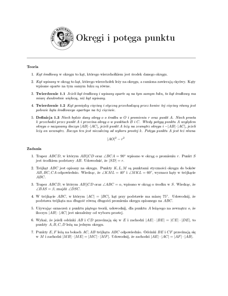 Okr¦gi i pot¦ga punktu Teoria 1. K¡t ±rodkowy w okr¦gu to k¡t, którego wierzchoªkiem jest ±rodek danego okr¦gu. 2. K¡t wpisany w okr¡g to k¡t, którego wierzchoªek le»y na okr¦gu, a ramiona zawiera j¡ ci¦ciwy. K¡ty wpisane oparte na tym samym ªuku s¡ równe. 3. Twierdzenie 1.1 Je»eli k¡t ±rodkowy i wpisany oparte s¡ na tym samym ªuku, to k¡t ±rodkowy ma miar¦ dwukrotnie wi¦ksz¡, ni» k¡t wpisany. 4. Twierdzenie 1.2 K¡t pomi¦dzy ci¦ciw¡ i styczn¡ przechodz¡c¡ przez koniec tej ci¦ciwy równy jest poªowie k¡ta ±rodkowego opartego na tej ci¦ciwie. 5. Denicja 1.3 k okr¦gu o o Niech b¦dzie dany okr¡g A przechodzi przez punkt nazywamy iloczyn o ±rodku w i przecina okr¡g |AB| · |AC|, o O i promieniu w punktach je»eli punkt A B i C. r oraz punkt A. Niech prosta A wzgl¦dem −|AB| · |AC|, je»eli punktu A jest te» równa Wtedy pot¦g¡ punktu le»y na zewn¡trz okr¦gu i le»y on wewn¡trz. Iloczyn ten jest niezale»ny od wyboru prostej k. Pot¦ga |AO|2 − r2 Zadania 1. Trapez ABCD, AB||CD oraz ∠BCA = 90◦ AB . Udowodni¢, »e |SD| = r. w którym jest ±rodkiem podstawy ABC jest opisany AB, BC, CA odpowiednio. ABC . 2. Trójk¡t na okr¦gu. ABCD, w którym AB||CD ∠BAS = β , zna jd¹ ∠DSC . 4. W tró jk¡cie ABC , w którym oraz ∠ABC = α, |AC| = |BC|, wpisano w okr¡g o ±rodku w 7. Punkty w M A, B, C, D E, F Wiedz¡c, »e 75◦ . Udowodnij, na ABC . A »e o, »e |AE| · |BE| = |CE| · |DE|, to le»¡cego na zewn¡trz AB i CD przecinaj¡ si¦ w E i zachodzi le»¡ na jednym okr¦gu. AC, AB tró jk¡ta ABC odpowiednio. Odcinki BE i CF przecinaj¡ si¦ |M B| · |M E| = |M C| · |M F |. Udowodnij, »e zachodzi |AE| · |AC| = |AF | · |AB|. le»¡ na bokach i zachodzi S jest niezale»ny od wyboru prostej. 6. Wyka», »e je»eli odcinki punkty S. k¡t przy podstawie ma miar¦ 5. U»ywa j¡c oznacze« z punktu pi¡tego teorii, udowodnij, dla punktu |AB| · |AC| Punkt K, L, M s¡ punktami styczno±ci okr¦gu do boków ∠KM L = 40◦ i ∠M KL = 60◦ , wyznacz k¡ty w tró jk¡cie podstawa tró jk¡ta ma dªugo±¢ równ¡ dªugo±ci promienia okr¦gu opisanego iloczyn r. Punkty Wiedz¡c, »e 3. Trapez wpisano w okr¡g o promieniu