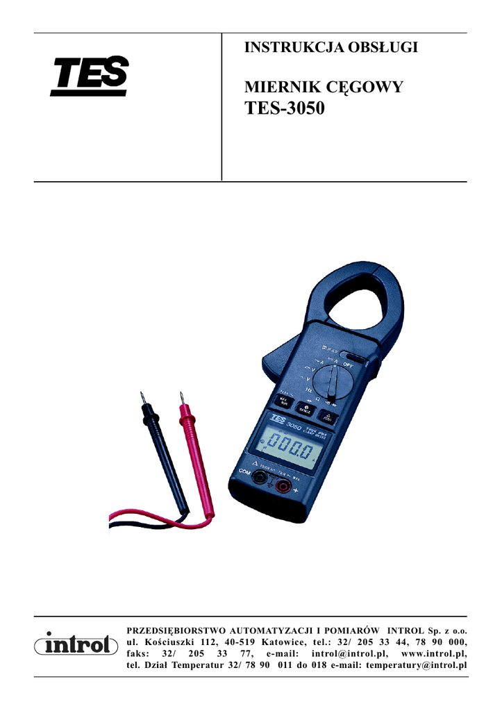 INSTRUKCJA OBS£UGI MIERNIK CÊGOWY TES-3050 PRZEDSIÊBIORSTWO AUTOMATYZACJI I POMIARÓW INTROL Sp. z o.o. ul. Kociuszki 112, 40-519 Katowice, tel.: 32/ 205 33 44, 78 90 000, faks: 32/ 205 33 77, e-mail: [email protected], www.introl.pl, tel. Dzia³ Temperatur 32/ 78 90 011 do 018 e-mail: [email protected] INTROL Sp. z o.o., ul. Kociuszki 112, 40-519 Katowice, tel.: 32/78 90 011 ÷ 018, faks: 32/2053377, e-mail: [email protected], www.introl.pl SPIS TRECI 1. Informacja o bezpieczeñstwie ...................................................................................... 3 2. Dane techniczne ............................................................................................................ 4 2.1 Informacje ogólne ..................................................................................................... 4 2.2 W³aciwoci pomiarowe ............................................................................................ 5 3. Czêci i elementy sterowania ..................................................................................... 10 3.1 Opis czêci i elementów sterowania ........................................................................ 10 4. Instrukcja eksploatacji ............................................................................................... 13 4.1 Zalecenia dotycz¹ce pomiarów ............................................................................... 13 4.2 Pomiary natê¿enia pr¹du DC ................................................................................... 13 4.3 Pomiary natê¿enia pr¹du AC .................................................................................. 14 4.4 Pomiary napiêcia DC .............................................................................................. 15 4.5 Pomiary napiêcia AC ............................................................................................... 16 4.6 Pomiary czêstotliwoci ............................................................................................ 17 4.7 Pomiar rezystancji ................................................................................................... 18 4.8 Pomiar ci¹g³oci obwodu i sprawdzanie diody ....................................................... 19 4.9 Deaktywacja funkcji automatycznego wy³¹czania zasilania ................................... 19 5. Pomiary rzeczywistej wartoci skutecznej (TRMS) ................................................ 20 6. Pomiar wartoci ekstremalnych ................................................................................ 22 7. Konserwacja ................................................................................................................ 22 7.1 Wymiana baterii ...................................................................................................... 22 7.2 Ostrze¿enie dotycz¹ce konserwacji ......................................................................... 22 2 INTROL Sp. z o.o., ul. Kociuszki 112, 40-519 Katowice, tel.: 32/78 90 011 ÷ 018, faks: 32/2053377, e-mail: [email protected], www.introl.pl 1. Informacja o bezpieczeñstwie o o o o o o o o o o Niniejsz¹ informacjê o warunkach bezpieczeñstwa nale¿y starannie przeczytaæ przed przyst¹pieniem do korzystania z miernika lub jego technicznej obs³ugi. Aby unikn¹æ uszkodzenia przyrz¹du, nie wolno przekraczaæ maksymalnych wartoci granicznych sygna³ów wejciowych, wyszczególnionych w zestawieniach danych technicznych. Nigdy nie mierzyæ natê¿enia pr¹du, gdy przewody pomiarowe wetkniête s¹ bezporednio do gniazdka wejciowego. Nie u¿ywaæ miernika lub przewodów pomiarowych, je¿eli wygl¹daj¹ one na uszkodzone. Zachowaæ najwy¿sz¹ ostro¿noæ przy pracy z przewodami nie izolowanymi lub szynami zbiorczymi. Przypadkowe dotkniêcie przewodu grozi pora¿eniem elektrycznym. Miernika nale¿y u¿ywaæ tylko zgodnie z opisem w niniejszej instrukcji; w przeciwnym razie nie gwarantuje siê przewidzianego bezpieczeñstwa. Przed u¿yciem przeczytaæ instrukcjê eksploatacji i stosowaæ siê do wszystkich zasad bezpieczeñstwa. Szczególn¹ ostro¿noæ zaleca siê przy pracy z napiêciami powy¿ej 60 V DC lub 30 V wartoci skutecznej AC. Takie napiêcia stwarzaj¹ ryzyko pora¿enia. Przed rozpoczêciem pomiarów rezystancji lub akustycznego sprawdzania ci¹g³oci, od³¹czyæ obwód elektryczny od ród³a zasilania, a tak¿e wszystkie obci¹¿enia od tego obwodu. Symbole bezpieczeñstwa Uwaga odsy³aj¹ca do niniejszej instrukcji przed u¿yciem miernika. Niebezpieczne napiêcia. Miernik jest ca³kowicie chroniony przez podwójn¹ izolacjê lub izolacjê wzmocnion¹.Przy naprawach u¿ywaæ tylko wyspecyfikowanych czêci zamiennych Zgodnoæ z EN-61010-1 3 INTROL Sp. z o.o., ul. Kociuszki 112, 40-519 Katowice, tel.: 32/78 90 011 ÷ 018, faks: 32/2053377, e-mail: [email protected], www.introl.pl 2. Dane techniczne 2.1 Informacje ogólne Warunki otoczenia: 1. Kategoria zabezpieczenia III 2. Stopieñ zanieczyszczenia 2 3. Wysokoæ do 2000 m n.p.m. 4. Do stosowania w pomieszczeniach 5. Wilgotnoæ wzglêdna maksymalnie 80% 6. Temperatura pracy 0 ~ 40°C Konserwacja i czyszczenie: 1. Naprawy i obs³ugê nie przedstawione w niniejszej instrukcji mo¿e przeprowadzaæ tylko wykwalifikowany personel. W okresie gwarancyjnym wszelkie naprawy wykonuje firma INTROL Sp. z o.o. Samodzielna naprawa, demonta¿ urz¹dzenia mo¿e skutkowaæ utrat¹ gwarancji, 2. Okresowo przetrzeæ obudowê such¹ ciereczk¹. Nie stosowaæ do czyszczenia przyrz¹du rodków ciernych, ani rozpuszczalników. Maksymalne napiêcie miêdzy dowolnym zaciskiem i potencja³em ziemi: 600 V wartoci skutecznej Zasada dzia³ania: Podwójne ca³kowanie gradientowe Wywietlacz: 3 3/4 cyfrowy wywietlacz ciek³okrystaliczny (LCD) o maksymalnym odczycie 3999. Automatyczne pokazywanie funkcji i symboli. Wskanik linijkowy: 40 segmentowy (rozdzielczoæ: 100 zliczeñ na segment) Wybór zakresu: Automatyczny lub rêczny. Wskazanie p