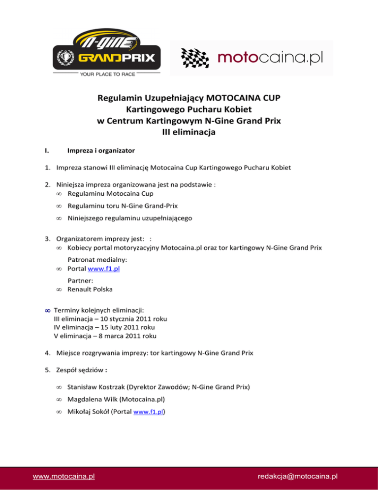 Regulamin Uzupełniający MOTOCAINA CUP Kartingowego Pucharu Kobiet w Centrum Kartingowym N-Gine Grand Prix III eliminacja I. Impreza i organizator 1. Impreza stanowi III eliminację Motocaina Cup Kartingowego Pucharu Kobiet 2. Niniejsza impreza organizowana jest na podstawie : • Regulaminu Motocaina Cup • Regulaminu toru N-Gine Grand-Prix • Niniejszego regulaminu uzupełniającego 3. Organizatorem imprezy jest: : • Kobiecy portal motoryzacyjny Motocaina.pl oraz tor kartingowy N-Gine Grand Prix Patronat medialny: • Portal www.f1.pl Partner: • Renault Polska • Terminy kolejnych eliminacji: III eliminacja – 10 stycznia 2011 roku IV eliminacja – 15 luty 2011 roku V eliminacja – 8 marca 2011 roku 4. Miejsce rozgrywania imprezy: tor kartingowy N-Gine Grand Prix 5. Zespół sędziów : • Stanisław Kostrzak (Dyrektor Zawodów; N-Gine Grand Prix) • Magdalena Wilk (Motocaina.pl) • Mikołaj Sokół (Portal www.f1.pl) www.motocaina.pl [email protected] 6. Przybliżony harmonogram czasowy 18:00 Otwarcie Biura Imprezy i wydawanie dokumentów 18:40 Obowiązkowa odprawa z Uczestniczkami 19:00 Treningi wolne 19:40 Kwalifikacje 20:30 Biegi finałowe II. Postanowienia ogólne 1. Nagrody. 1.1. Organizatorzy gwarantują następujące nagrody: - za zwycięstwo w rundzie: uczestnictwo w kursie organizowanym przez Szkołę Jazdy Renault. W przypadku drugiego oraz kolejnych zwycięstw tej samej Uczestniczki, będzie ona mogła skorzystać z następnych etapów szkolenia w Szkole Jazdy Renault. - w każdej rundzie za trzy pierwsze miejsca dla Uczestniczek oraz Uczestniczek klasy GOŚĆ: - puchary, nagrody rzeczowe - dla pozostałych Uczestniczek: - dyplomy; - nagrody w łącznej klasyfikacji sezonu (bez klasy GOŚĆ): - puchary, nagrody rzeczowe w postaci: I miejsce w Motocaina Cup – udział w programie „Feel It”; jeśli uczestniczka nie spełni warunków programu, Renault Polska ufunduje wyjazd na Grand Prix Formuły 1 w dogodnym dla siebie terminie. II miejsce w Motocaina Cup – Renault Laguna Coupe na dwa tygodnie III miejsce w Motocaina Cup – Renault Megane C-C na tydzień. www.motocaina.pl [email protected] Firma Renault Polska do wydawanych samochodów zapewni kartę paliwową. Jeśli Uczestniczka nie będzie posiadać prawa jazdy, Firma Renault Polska zezwoli na użytkowanie samochodu najbliższej rodzinie (matka, ojciec, siostra, brat). - w łącznej klasyfikacji sezonu klasy GOŚĆ za 3 pierwsze miejsca dla Uczestniczek: - gadżety firmy Renault. 1.2 . Nagrody nie podlegają wymianie na ekwiwalent pieniężny. 1.3 . Obowiązek uregulowania kwestii podatkowych od nagród spoczywa na Renault Polska. Warunki uczestnictwa w programie Feel It (wg info z 2010 r.): - uczestnik musi posiadać ważne prawo jazdy, od min. trzech lat - znajomość języka: angielski lub francuski Wymagane warunki fizyczne/zdrowotne: - Maksymalny wzrost 189 cm - Maksymalna waga: 91 kg - Maksymalne ciśnienie tętnicze 150/80 (mmHg) - Brak kryzysów epileptycznych - Brak urazów czaszki z utratą przytomności lub bez niej, także w przypadku gdy przeprowadzono leczenie osteopatyczne - Brak zawrotów głowy - Brak wypadnięcia dysku lub obecności przepukliny lędźwiowej www.motocaina.pl [email protected]