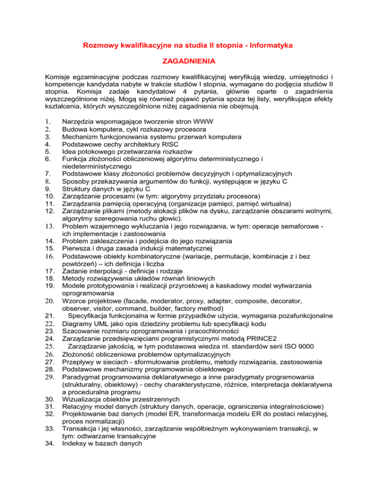 Rozmowy kwalifikacyjne na studia II stopnia - Informatyka ZAGADNIENIA Komisje egzaminacyjne podczas rozmowy kwalifikacyjnej weryfikują wiedzę, umiejętności i kompetencje kandydata nabyte w trakcie studiów I stopnia, wymagane do podjęcia studiów II stopnia. Komisja zadaje kandydatowi 4 pytania, głównie oparte o zagadnienia wyszczególnione niżej. Mogą się również pojawić pytania spoza tej listy, weryfikujące efekty kształcenia, których wyszczególnione niżej zagadnienia nie obejmują. 1. 2. 3. 4. 5. 6. 7. 8. 9. 10. 11. 12. 13. 14. 15. 16. 17. 18. 19. 20. 21. 22. 23. 24. 25. 26. 27. 28. 29. 30. 31. 32. 33. 34. Narzędzia wspomagające tworzenie stron WWW Budowa komputera, cykl rozkazowy procesora Mechanizm funkcjonowania systemu przerwań komputera Podstawowe cechy architektury RISC Idea potokowego przetwarzania rozkazów Funkcja złożoności obliczeniowej algorytmu deterministycznego i niedeterministycznego Podstawowe klasy złożoności problemów decyzyjnych i optymalizacyjnych Sposoby przekazywania argumentów do funkcji, występujące w języku C Struktury danych w języku C Zarządzanie procesami (w tym: algorytmy przydziału procesora) Zarządzania pamięcią operacyjną (organizacje pamięci, pamięć wirtualna) Zarządzanie plikami (metody alokacji plików na dysku, zarządzanie obszarami wolnymi, algorytmy szeregowania ruchu głowic). Problem wzajemnego wykluczania i jego rozwiązania, w tym: operacje semaforowe ich implementacje i zastosowania Problem zakleszczenia i podejścia do jego rozwiązania Pierwsza i druga zasada indukcji matematycznej Podstawowe obiekty kombinatoryczne (wariacje, permutacje, kombinacje z i bez powtórzeń) – ich definicja i liczba Zadanie interpolacji - definicje i rodzaje Metody rozwiązywania układów równań liniowych Modele prototypowania i realizacji przyrostowej a kaskadowy model wytwarzania oprogramowania Wzorce projektowe (facade, moderator, proxy, adapter, composite, decorator, observer, visitor, command, builder, factory method) Specyfikacja funkcjonalna w formie przypadków użycia, wymagania pozafunkcjonalne Diagramy UML jako opis dziedziny problemu lub specyfikacji kodu Szacowanie rozmiaru oprogramowania i pracochłonności Zarządzanie przedsięwzięciami programistycznymi metodą PRINCE2 Zarządzanie jakością, w tym podstawowa wiedza nt. standardów serii ISO 9000 Złożoność obliczeniowa problemów optymalizacyjnych Przepływy w sieciach - sformułowanie problemu, metody rozwiązania, zastosowania Podstawowe mechanizmy programowania obiektowego Paradygmat programowania deklaratywnego a inne paradygmaty programowania (strukturalny, obiektowy) - cechy charakterystyczne, różnice, interpretacja deklaratywna a proceduralna programu Wizualizacja obiektów przestrzennych Relacyjny model danych (struktury danych, operacje, ograniczenia integralnościowe) Projektowanie baz danych (model ER, transformacja modelu ER do postaci relacyjnej, proces normalizacji) Transakcja i jej własności, zarządzanie współbieżnym wykonywaniem transakcji, w tym: odtwarzanie transakcyjne Indeksy w bazach danych 35. 36. 37. 38. 39. 40. 41. 42. 43. 44. 45. 46. 47. 48. 49. 50. 51. 52. 53. 54. 55. 56. 57. 58. 59. 60. Porównanie różnych architektur sieci komputerowych Podział sieci na podsieci - motywacja, zasada i przykłady Podstawowe urządzenia sieciowe: karta sieciowa, modem, koncentrator, komutator i ruter Techniki przesyłania danych w sieciach rozległych; protokoły wyboru trasy Metody reprezentacji wiedzy i ich zastosowanie na przykładzie różnych dziedzin sztucznej inteligencji Przeszukiwanie przestrzeni stanów jako ogólny model procesu wnioskowania Narzędzia symulacji procesów Inteligentne urządzenia pomiarowe (inteligentne sensory) Komputer jako urządzenie sterujące procesem Podstawowe miary położenia i rozproszenia stosowane w statystycznej analizie danych Klasyfikacja architektur systemów równoległych Programowanie liniowe, podstawy algorytmu simpleksów Zasada kompresji dźwięku typu MP3 a psychofizjologia słyszenia Architektury aplikacji intra- i internetowych (WWW, HTTP, HTTPS) Technologie prezentacji danych w sieci Internet (HTML, CSS, XML, XSL, JavaScript) Technologie dynamicznego generowania stron WWW (serwlety Java, JSP, PHP, ASP.NET) Charakterystyka systemów przetwarzania rozproszonego Cechy charakterystyczne mechanizmu szyfrowania symetrycznego oraz szyfrowania asymetrycznego, sposoby wykorzystania dla zapewnienia poufności, integralności i niezaprzeczalności komunikacji Trendy rozwojowe i najistotniejsze nowe osiągnięcia w informatyce Zagrożenia związane z przestępczością elektroniczną, specyfika systemów krytycznych ze względu na bezpieczeństwo (ang. mission-critical systems) Podstawowe pojęcia z zakresu ekonomii odnoszące się do inwestycji informatycznych i projektów informatycznych takie, jak zwrot z inwestycji, koszty stałe i koszty zmienne, ryzyko finansowe, przychód a zysk, zysk a przepływy pieniężne (ang. cash flow) Podstawy zarządzania i prowadzenia działalności gospodarczej Patenty, prawo autorskie i prawa pokrewne oraz ochrona danych osobowych Dobór języka programowania odpowiedniego do danego zadania programistycznego Obwody elektroniczne (elementy obwodów, prawa Kirchhoffa, wzmocnienie, tłumienie, charakterystyki częstotliwościowe) Algebra Boole’a, funkcje i schematy logiczne
