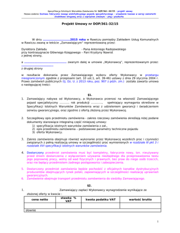 Specyfikacja Istotnych Warunków Zamówienia Nr DOP/361-32/15 – projekt umowy Nazwa zadania: Dostawa fabrycznie nowego wielofunkcyjnego pojazdu specjalistycznego – urządzenie bazowe w wersji zamiatarki chodnikowo-drogowej wraz z osprzętem zimowym – pług i piaskarka Projekt Umowy nr DOP/361-32/15 W dniu …………………………2015 roku w Rawiczu pomiędzy Zakładem Usług Komunalnych w Rawiczu zwaną w tekście „Zamawiającym” reprezentowaną przez: Dyrektora Zakładu - Pana Antoniego Radojewskiego przy kontrasygnacie Głównego Księgowego – Pani Krystyny Nawrot z jednej strony, a ......................................... zwanym dalej w umowie „Wykonawcą”, reprezentowanym przez: …………………………….. z drugiej strony w rezultacie dokonania przez Zamawiającego wyboru oferty Wykonawcy w przetargu nieograniczonym zgodnie z przepisami (art. 10 ust.1, art. 39-46) ustawy z dnia 29 stycznia 2004 r. Prawo zamówień publicznych (tj. Dz. U. z 2013 roku, poz. 907 z późn. zm.) została zawarta umowa o następującej treści: §1. 1. Zamawiający nabywa od Wykonawcy, a Wykonawca przenosi na własność Zamawiającego pojazd specjalistyczny ……….. rok produkcji …………, spełniający wymagania określone w Specyfikacji Istotnych Warunków Zamówienia wraz z udzieleniem gwarancji i świadczeniem serwisu gwarancyjnego, oraz zgodnie z ofertą złożoną przez Wykonawcę. 2. Szczegółowy opis przedmiotu zamówienia - zakres rzeczowy zamówienia określają niżej podane dokumenty stanowiące integralną część niniejszej umowy: 1) specyfikacja istotnych warunków zamówienia z zał., 2) opis przedmiotu zamówienia – podstawowe parametry techniczne pojazdu 3) oferta Wykonawcy. 3. Zakres zamówienia obejmuje również wykonanie przez Wykonawcę wszelkich prac i czynności związanych z pełną realizacją umowy w szczególności prac wymienionych w rozdziale III pkt 3 i rozdziale XVI specyfikacji istotnych warunków zamówienia. 4. Dostarczony przedmiot zamówienia musi być kompletny, fabrycznie nowy, tzn. nieużywany przed dniem dostarczenia z wyłączeniem używania niezbędnego dla przeprowadzenia testu jego poprawnej pracy, wolny od wad fizycznych i prawnych, bez praw do niego osób trzecich, oraz nie będący przedmiotem żadnego postępowania i zabezpieczenia. 5. Dostarczony przedmiot zamówienia będzie pochodzić z oficjalnych kanałów dystrybucyjnych producentów obejmujących rynek polski, zapewniających w szczególności realizację uprawnień gwarancyjnych. 6. Zamówienie obejmuje transport przedmiotu zamównienia do siedziby Zamawiającego. §2. 1. Zamawiający zapłaci Wykonawcy wynagrodzenie wynikające ze złożonej oferty w kwocie : stawka % cena netto kwota podatku VAT wartość brutto VAT słownie 1 Specyfikacja Istotnych Warunków Zamówienia Nr DOP/361-32/15 – projekt umowy Nazwa zadania: Dostawa fabrycznie nowego wielofunkcyjnego pojazdu specjalistycznego – urządzenie bazowe w wersji zamiatarki chodnikowo-drogowej wraz z osprzętem zimowym – pług i piaskarka brutto: ......................................................................................................................................... 2. 3. Podane wyżej wynagrodzenie brutto zawiera wszystkie koszty wynikające z wykonania przedmiotu zamówienia, w tym również koszty dostarczenia przedmiotu zamówienia do siedziby Zamawiającego oraz ubezpieczenie na czas transportu. Podana cena obejmuje wszelkie koszty ponoszone przez Wykonawcę w związku z realizacją przedmiotu zamówienia i Wykonawca nie może żądać od Zamawiającego żadnych dodatkowych dopłat. Podstawą do wystawienia faktury przez Wykonawcę będzie protokół zdawczo-odbiorczy przedmiotu zamówienia, który będzie sporządzony po odbiorze przedmiotu zamówienia. 5. Płatnikiem wynagrodzenia za wykonanie niniejszej umowy jest …………….. , wobec tego faktura winna być wystawiona na podmiot: ……………… ul. …………..,......................z, NIP - ……………., REGON – …………………………. 6. Zamawiający ma obowiązek zapłaty faktury w terminie do 30 dni licząc od daty ich doręczenia wraz z dokumentami rozliczeniowymi. 7. Zamawiający zastrzega możliwość udzielenia zamówień uzupełniających na podstawie art. 67 ust.1 pkt 7 ustawy PZP polegających na powtórzeniu tego samego rodzaju zamówień jak w zamówieniu podstawowym, w okresie 3 lat od udzielenia zamówienia podstawowego. §3. 1. Wykonawca zobowiązuje się oddać przedmiot umowy do eksploatacji w stanie pełnej sprawności technicznej i użytkowej , niezwłocznie po zawarciu niniejszej umowy, nie później jednak niż w terminie do dnia: …………………2015 roku. 2. Strony ustalają, że miejscem dostarczenia – odbioru pojazdu jest Rawicz .ul. Winiary 4b, 63-900 Rawicz. 4. 3. Wykonawca jest zobowiązany zgłosić pisemnie/faksem Zamawiającemu dostawę w terminie na 4. 5. 2 dni robocze przed terminem dostawy. Odbiór pojazdu nastąpi w terminie uzgodnionym pomiędzy Stronami z zachowaniem warunków niniejszej umowy. Wykonawca gwarantuje, że przygotowany do odbioru i dostarczenia pojazd jest dobrej jakości, spełnia wymogi określone przez Zamawiającego i wymogi ujęte w instrukcji użytkowania i obsługi pojazdu. 6. Wykonawca, w ramach odbioru, o którym mowa w ust. 4 zobowiązany jest do: 1) dostarczenia do siedziby Zamawiającego pojazdu kompletnie wyposażonego i przekazania do dyspozycji Zamawiającego, 2) dokonania uruchomienia pojazdu, przeprowadzenia szkolenia w zakresie jego obsługi, konserwacji i eksploatacji, 3) dostarczenia kompletnej dokumentacji i gwarancji w języku polskim (instrukcja obsługi, dokument CE) oraz innych niezbędne dokumenty dopuszczające pojazd do ruchu po drogach publicznych, 7. Do dostarczonego pojazdu Wykonawca załączy w szczególności: 1) Książkę gwarancyjną pojazdu, 2) Instrukcję użytkowania i obsługi pojazdu, 3) Książkę 