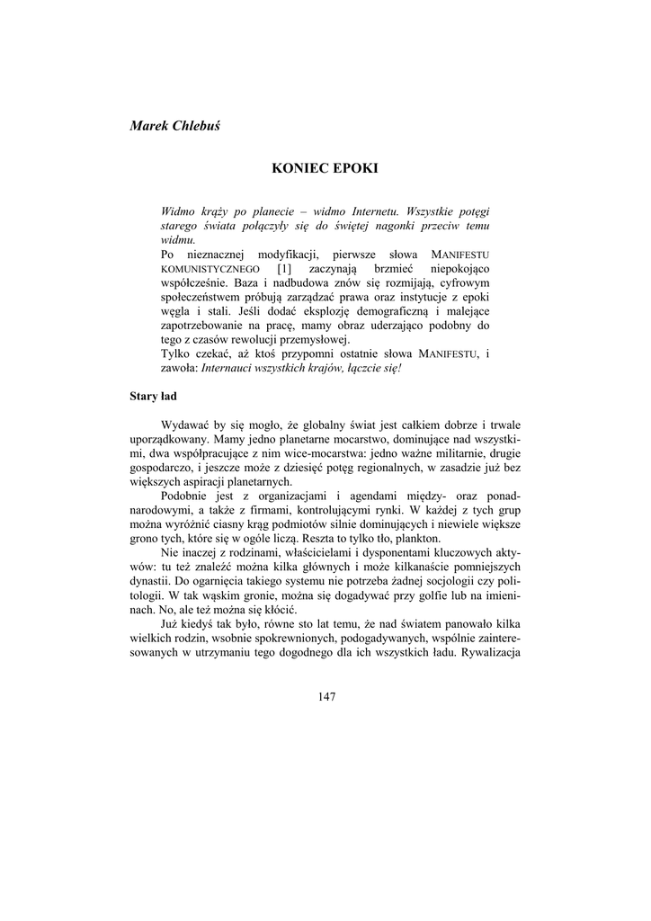 Marek Chlebuś KONIEC EPOKI Widmo krąży po planecie – widmo Internetu. Wszystkie potęgi starego świata połączyły się do świętej nagonki przeciw temu widmu. Po nieznacznej modyfikacji, pierwsze słowa MANIFESTU [1] zaczynają brzmieć niepokojąco KOMUNISTYCZNEGO współcześnie. Baza i nadbudowa znów się rozmijają, cyfrowym społeczeństwem próbują zarządzać prawa oraz instytucje z epoki węgla i stali. Jeśli dodać eksplozję demograficzną i malejące zapotrzebowanie na pracę, mamy obraz uderzająco podobny do tego z czasów rewolucji przemysłowej. Tylko czekać, aż ktoś przypomni ostatnie słowa MANIFESTU, i zawoła: Internauci wszystkich krajów, łączcie się! Stary ład Wydawać by się mogło, że globalny świat jest całkiem dobrze i trwale uporządkowany. Mamy jedno planetarne mocarstwo, dominujące nad wszystkimi, dwa współpracujące z nim wice-mocarstwa: jedno ważne militarnie, drugie gospodarczo, i jeszcze może z dziesięć potęg regionalnych, w zasadzie już bez większych aspiracji planetarnych. Podobnie jest z organizacjami i agendami między- oraz ponadnarodowymi, a także z firmami, kontrolującymi rynki. W każdej z tych grup można wyróżnić ciasny krąg podmiotów silnie dominujących i niewiele większe grono tych, które się w ogóle liczą. Reszta to tylko tło, plankton. Nie inaczej z rodzinami, właścicielami i dysponentami kluczowych aktywów: tu też znaleźć można kilka głównych i może kilkanaście pomniejszych dynastii. Do ogarnięcia takiego systemu nie potrzeba żadnej socjologii czy politologii. W tak wąskim gronie, można się dogadywać przy golfie lub na imieninach. No, ale też można się kłócić. Już kiedyś tak było, równe sto lat temu, że nad światem panowało kilka wielkich rodzin, wsobnie spokrewnionych, podogadywanych, wspólnie zainteresowanych w utrzymaniu tego dogodnego dla ich wszystkich ładu. Rywalizacja 147 Przyszłość: Świat-Europa-Polska Nr 1/2014 Materiały nadesłane między nimi miała się sprowadzać już tylko do handlu i sportu, a walka, jak twierdzono, utraciła wszelki racjonalny sens. Wystarczyło jednak parę kul z Browninga, wystrzelonych w Sarajewie, by wybuchła Wielka Wojna, którą przegrali praktycznie wszyscy. Dzisiejsza sytuacja świata może wydawać się wyjątkowa, i skłaniać do ostrożności w stosowaniu ścisłych analogii historycznych. Pewne jednak ogólne prawidłowości zawsze zachowują moc, szczególnie ta, że kiedy instytucje i prawa nie są zharmonizowane z rzeczywistością, pojawia się napięcie, które powoli wzbiera, by w końcu rozładować się gwałtownie, w jakiejś rewolucji lub wojnie. W ostatnim półwieczu, bardzo pozmieniała się rzeczywistość społeczna, polityczna, gospodarcza, pojawiły się zupełnie nowe techniki i narzędzia, zmieniło się życie większości ludzi. Oficjalna wizja świata pozostaje jednak uwięziona w anachronicznych kręgach pojęciowych, dostosowanych do zupełnie innego stanu rzeczy. Nie tylko nie mamy nowej wizji pozytywnej, ale nawet w większości nie wierzymy w sens jej poszukiwania. Co gorsza, tkwimy w fałszywej i zgubnej samoświadomości, myląc procesy degeneracyjne z ewolucyjnymi, a rozkład z rozwojem. Tendencje, co do których występowania jesteśmy dziś w większości zgodni, i zwykliśmy je uważać za nieuniknione, to przede wszystkim: komercjalizacja kolejnych dziedzin życia, prywatyzacja i kartelizacja sfery publicznej, barbaryzacja kultury, biurokratyzacja nauki, infantylizacja demokracji, demontaż społeczeństwa dobrobytu, wzrastające rozwarstwienie, odrzucenie aksjologii, i w końcu redukcja ontologicznego statusu człowieka. Procesy te można by teoretycznie przedłużać w przyszłość, zwiastując jakieś post- społeczeństwo, ale są to raczej przejawy dekompozyzji i rozkładu, towarzyszące po prostu końcowi, a nie początkowi czegokolwiek. Nasza cywilizacja więdnie i prawdopodobnie ginie. Może nam się oczywiście przydarzyć długotrwałe gnicie, jak kiedyś Bizancjum czy Indiom, możliwe też byłoby odrodzenie, a nawet nowa młodość, co już się kiedyś przytrafiło Europie, ale najbardziej prawdopodobny wydaje się schyłek. Jest coraz bardziej wyobrażalne, że to nie my i nie nasze dzieci utworzą kolejną cywilizację, cywilizację sieci. Kto to zrobi – dziś trudno powiedzieć, najprawdopodobniej ktoś, kto odrzuci mechanistyczne i materialistyczne koncepcje porządku, wyzwoli się z fetyszy komercji, własności, praw autorskich, konsumeryzmu, a przynajmniej będzie zdolny do ich nowego zdefiniowania. My możemy znaleźć się poza głównym nurtem przemian. Żadna to pociecha, że nie umiemy dziś wskazać na naszych mapach państwa, które by nas miało podbić, ani też znaleźć w swoich encyklopediach nazwy dla nowej religii lub ideologii, która by mogła nad nami zapanować. A któż to w Kairze albo Damaszku mógł pomyśleć w roku hidżry, gdy Mahomet z pa- 148 MAREK CHLEBUŚ Koniec epoki roma rodzinami opuszczał Mekkę, że ta garstka bezradnych uchodźców w ciągu dwudziestu lat przyjdzie i podbije Syrię oraz Egipt? Zdumiewał się nawet ich własny poeta, gdy napisał potem tak: „Poszliśmy za nim... bosi, nadzy, bez ekwipunku, bez siły, bez broni, bez żywności, przeciwko narodom posiadającym najpotężniejszych królów, najstraszniejszą potęgę, najliczniejsze wojska, najgęściej zaludnione kraje, największe możliwości podporządkowywania sobie ludów... Bóg dał nam zwycięstwo, pozwolił zagarnąć ich kraje i osiedlić się na ich ziemiach, zająć ich domostwa i posiadłości, choć nie posiadaliśmy żadnej siły ani potęgi poza prawdą”. (cytat za [2]). Czy nie jesteśmy dziś sami podobni do tamtych dojrzewających do podboju mocarstw, posiadając wszelkie materialne czynniki potęgi i odrzucając wszelką prawdę? Nowy świat Globalny porządek instytucjonalny jest w większości oparty na rozwiązaniach, ustanowiony