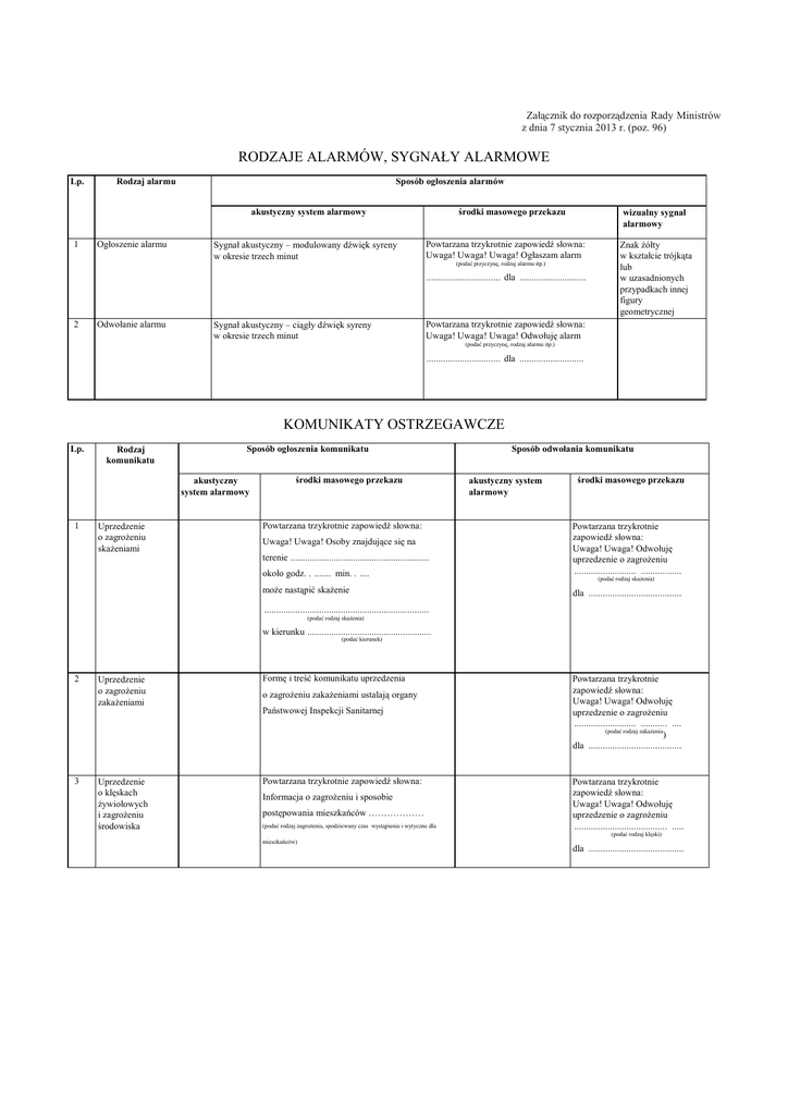 Załącznik do rozporządzenia Rady Ministrów z dnia 7 stycznia 2013 r. (poz. 96) RODZAJE ALARMÓW, SYGNAŁY ALARMOWE Lp. Rodzaj alarmu Sposób ogłoszenia alarmów akustyczny system alarmowy 1 Ogłoszenie alarmu Sygnał akustyczny – modulowany dźwięk syreny w okresie trzech minut środki masowego przekazu wizualny sygnał alarmowy Powtarzana trzykrotnie zapowiedź słowna: Uwaga! Uwaga! Uwaga! Ogłaszam alarm (podać przyczynę, rodzaj alarmu itp.) ............................... dla ............................ 2 Odwołanie alarmu Sygnał akustyczny – ciągły dźwięk syreny w okresie trzech minut Znak Ŝółty w kształcie trójkąta lub w uzasadnionych przypadkach innej figury geometrycznej Powtarzana trzykrotnie zapowiedź słowna: Uwaga! Uwaga! Uwaga! Odwołuję alarm (podać przyczynę, rodzaj alarmu itp.) ............................... dla ........................... KOMUNIKATY OSTRZEGAWCZE Lp. Rodzaj komunikatu Sposób ogłoszenia komunikatu akustyczny system alarmowy 1 Uprzedzenie o zagroŜeniu skaŜeniami środki masowego przekazu Powtarzana trzykrotnie zapowiedź słowna: Sposób odwołania komunikatu akustyczny system alarmowy środki masowego przekazu około godz. . ....... min. . .... Powtarzana trzykrotnie zapowiedź słowna: Uwaga! Uwaga! Odwołuję uprzedzenie o zagroŜeniu .......................... ................. moŜe nastąpić skaŜenie dla ....................................... Uwaga! Uwaga! Osoby znajdujące się na terenie .......................................................... (podać rodzaj skaŜenia) ..................................................................... (podać rodzaj skaŜenia) w kierunku .................................................... (podać kierunek) 2 3 Uprzedzenie o zagroŜeniu zakaŜeniami Formę i treść komunikatu uprzedzenia Uprzedzenie o klęskach Ŝywiołowych i zagroŜeniu środowiska Powtarzana trzykrotnie zapowiedź słowna: o zagroŜeniu zakaŜeniami ustalają organy Państwowej Inspekcji Sanitarnej Informacja o zagroŜeniu i sposobie postępowania mieszkańców ……………… (podać rodzaj zagroŜenia, spodziewany czas wystąpienia i wytyczne dla Powtarzana trzykrotnie zapowiedź słowna: Uwaga! Uwaga! Odwołuję uprzedzenie o zagroŜeniu .......................... ........... .... (podać rodzaj zakaŜenia ) dla ....................................... Powtarzana trzykrotnie zapowiedź słowna: Uwaga! Uwaga! Odwołuję uprzedzenie o zagroŜeniu ....................................... ..... (podać rodzaj klęski) mieszkańców) dla ........................................