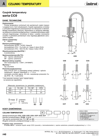 A CZUJNIKI TEMPERATURY Czujnik temperatury CZUJNIK TEMPERATURY seria seria CC0 CC0 DANE DANE TECHNICZNE TECHNICZNE Zastosowanie: Pomiar temperatury ruchomych lub wymiennych czêci maszyn i urz¹dzeñ (m.in. form wtryskowych). Czujnik wyposa¿ony w króciec z uchwytem bagnetowym przeznaczonym do wkrêcania w element, którego temperaturê mierzymy. Wyposa¿ony w sprê¿ynê os³aniaj¹c¹ elastyczny przewód przy³¹czeniowy z nasadk¹ stanowi¹c¹ czêæ uchwytu bagnetowego. Umo¿liwia to ³atwe i szybkie mocowanie czujnika w gniedzie pomiarowym oraz regulacjê g³êbokoci zanurzenia czujnika. Zakres pomiarowy: 0... +400°C Element przetwarzaj¹cy *: termorezystor (RTD) - Pt100 / klasa B termoelement (TC) - Fe-CuNi (J) / klasa 2 (drut ∅0,5) termoelement (TC) - NiCr-Ni (K) / klasa 2 (drut ∅0,5) Obwód pomiarowy (dla RTD) *: 2-przewodowy Spoina pomiarowa (dla TC): SO - spoina odizolowana SP - spoina uziemiona CCD Materia³ os³ony czujnika: stal kwasoodporna 1.4541 (1H18N9T) CCE CCP CCS CCT CCK CCC Wymiary *: wg rysunków Przewód przy³¹czeniowy: linka 2×0,22 mm2 w podwójnej izolacji szklanej i oplocie metalowym, d³ugoæ (standard) Lp = 1,5 m minimalny promieñ giêcia: 25 mm, rezystancja przewodu Cu dla RTD - Rp = 0,25 Ω/mb * Inne parametry (wymiary, gwint, materia³ os³ony) na ¿yczenie (po uzgodnieniu) W³asnoci dynamiczne (w gniedzie metalowym) sek. T05 ≤ TC / SO 7 TC / SP 1,5 RTD 7 T09 ≤ 23 7 23 LEGENDA: B - bia³y C - czerwony SO SP KODY ZAMÓWIENIA SPOSÓB OZNACZANIA I ZAMAWIANIA CZUJNIK TEMPERATURY IT - - - - Wersja konstrukcyjna: CCC, CCD, CCE, CCK, CCP, CCS, CCT Element przetwarzaj¹cy: Pt100, J lub K Typ spoiny pomiarowej (dla TC): SP lub SO D³ugoæ przewodu przy³¹czeniowego Lp [m]: ... Przyk³ad kodu zamówienia: IT-CCD-J-SP-2 - oznacza czujnik wersji CCD (rysunek), z termoelementem J, spoina uziemiona, przewód przy³¹czeniowy Lp = 2 m. A40 INTROL Sp. z o.o., 40-519 Katowice, ul. Ko ściusz ki 112, http://www.introl.pl tel. 032/ 7890150, fax 032/ 2053377, e-mail: [email protected] edycja 1/2005