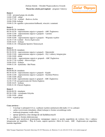 Zielona Szkoła – Ośrodek Wypoczynkowy Gwarek Mazurska szkoła pod żaglami – program 5 dniowy Dzień 1 13.00 – przyjazd grupy do ośrodka 14.00-15.00 – obiad 15.30-17.30 – wykład – Budowa Jachtu 18.00-19.00- kolacja 19.00-21.30- ognisko z pieczeniem kiełbasek, wieczór z szantami Dzień 2 08.00-08.30- śniadanie 08.30-10.30 – naprzemienne zajęcia w grupach – ABC Żeglarstwa 10.40-12.40 - naprzemienne zajęcia w grupach – I pomoc 13.00-14.00- obiad 14.00-16.00 - naprzemienne zajęcia w grupach – Wiązanie węzłów 16.30-17.30- wykład – Teoria Żeglowania 18.00-18.45 – kolacja 19.00-21.30 - Olimpiada Sportów Śmiesznych Dzień 3 08.00-08.30- śniadanie 08.30-10.30 – naprzemienne zajęcia w grupach – Optymistki 10.40-12.40 - naprzemienne zajęcia w grupach – Gry i zabawy integracyjne 13.00-14.00 - obiad 14.00-16.00 - naprzemienne zajęcia w grupach – ABC Żeglarstwa 16.30-17.30- wykład – Meteorologia 18.00-18.45 – kolacja 19.00-21.30 – dyskoteka - Bal Pirata Dzień 4 08.00-08.30- śniadanie 08.30-10.30 – naprzemienne zajęcia w grupach – Kajaki 10.40-12.40 - naprzemienne zajęcia w grupach – Kuchnia Polowa 13.00-14.00- obiad 14.00-16.00- naprzemienne zajęcia w grupach – ABC Żeglarstwa 16.30-17.30- przygotowanie do Chrztu Żeglarza 18.00-18.45 – kolacja 19.00-21.30 -Chrzest Żeglarza Dzień 5 08.00-08.30 - śniadanie 09.30-13.00 – zwiedzanie Giżycka 13.00-14.00 – obiad 14.00 - wyjazd grupy Cena zawiera : – 4 noclegi w pokojach 4-6 os. z pełnym węzłem sanitarnym (dla kadry 2-3 os. pokoje) – pełne wyżywienie (śniadanie, obiad, kolacja) w formie szwedzkiego stołu – realizację programy wedle oferty – sprzęt sportowy oraz dostęp do sal dydaktycznych – zdjęcia w formie elektronicznej W ramach opcji językowej proponujemy następujące zajęcia w języku angielskim do wyboru: Gry i zabawy integracyjne po angielsku – Play & Learn, zajęcia sportowe -Move & Learn, ABC Żeglowania po angielsku, karaoke angielskie. Salut Voyages Organizator Turystyki Aktywnej, 03-253 Warszawa, ul. Zbożowa 13, tel. (22) 614 33 02, www.salutvoyages.pl Dodatkowym atutem przy wyborze opcji językowej będzie stała obecność 2 lektorów/native speakerów w realizacji całego programu zielonej szkoły. Istniej możliwość organizacji transportu (za dopłatą). Powyższa oferta jest ofertą przykładową, zawierającą proponowany program zielonej szkoły. Istnieje możliwość modyfikacji oferty, dokonywania zmian programowych (w zależności od dokonanych zmian cena może ulec odpowiednio zmniejszeniu lub zwiększeniu) Program zielonej szkoły z podziałem na grupy Dzień I Grupa1 Grupa2 przyjazd 14:00 -15:00 15:30-17:30 18:00 -19:00 19:00-21:30 Dzień II 8:00-8:30 8:30-10:30 10:40-12:40 13:00-14:00 14:00-16:00 16:30-17:30 18:00-18:45 19:00-21:30 Dzień III 8:00-8:30 8:30-10:30 10:40-12:40 13:00-14:00 14:00-16:00 16:30-17:30 18:00-18:45 19:00-21:30 Dzień IV 8:00-8:30 8:30-10:30 10:40-12:40 13:00-14:00 14:00-16:00 16:30-17:30 18:00-18:45 19:00-21:30 Dzień V 8:00- 8:30 9:30- 13:00 13:00 – 14:00 Grupa 3 obiad Wykład – budowa jachtu kolacja Ognisko z śpiewaniem szant i pieczeniem kiełbasek Grupa1 Grupa2 I pomoc ABC Żeglarstwa Grupa1 Grupa2 ABC Żeglarstwa Gry i zabawy integracyjne ABC Żeglarstwa Kuchnia polowa I pomoc Grupa 3 ABC Żeglarstwa Gry i zabawy integracyjne obiad Abc Żeglarstwa Wykład - Meteorologia kolacja Dyskoteka – Bal Pirata Grupa2 Kajaki Wiązanie węzłów śniadanie Gry i zabawy integracyjne Optymistki Optymistki Grupa1 ABC Żeglarstwa I pomoc obiad ABC Żeglarstwa Wykład – Teoria Żeglowania kolacja Olimpiada Sportów Śmiesznych Wiązanie węzłów Grupa1 Grupa 3 śniadanie Wiązanie węzłów Optymistki Grupa 3 śniadanie Kuchnia polowa ABC Żeglarstwa Kajaki obiad ABC Żeglarstwa Przygotowanie do chrztu żeglarza kolacja Chrzest żeglarza Grupa2 Śniadanie + prowiant Zwiedzanie Giżycka Obiad wyjazd Kuchnia polowa Kajaki Grupa 3 Salut Voyages Organizator Turystyki Aktywnej, 03-253 Warszawa, ul. Zbożowa 13, tel. (22) 614 33 02, www.salutvoyages.pl Dodatkowe informacje Ośrodek Wypoczynkowy „Gwarek” położony jest bezpośrednio nad jeziorem Tajty, krok od Giżycka – żeglarskiej stolicy Polski. Bezpośredni dostęp do wody, otaczający las oraz piękne widoki tworzą niepowtarzalną atmosferę tego miejsca. Do dyspozycji gości jest ok. 275 miejsc noclegowych w pokojach (2-6 os) z pełnym węzłem sanitarnym oraz widokiem na jezioro i las. Piaszczysta plaża z kąpieliskiem, przystań żeglarska oraz sprzęt pływający pozwoli niewątpliwie w pełni korzystać z uroków Mazur. Dodatkowo, ośrodek gwarantuje duży wybór sal dydaktycznych, a bogata infrastruktura sportowa umożliwi dzieciom aktywny wypoczynek. ABC Żeglarstwa ( Ż ) – nauka żeglarstwa w praktyce Najpierw poznajemy podstawowe węzły, później żagle na maszt i w drogę… wszystko pod okiem wykwalifikowanej kadry instruktorów żeglarstwa. Młodzi adepci żeglarstwa będą uczyć się sterować siedmio/ośmio osobowym jachtem podczas rejsu po mazurskich jeziorach. Pierwsza Pomoc (PP) – Zajęcia z ratownictwa przedmedycznego Zajęcia przygotowywane pod okiem zawodowego Ratownika Medycznego przeprowadzane na profesjonalnym sprzęcie treningowym, dostosowane do różnych grup wiekowych mające na celu propagowanie udzielania pierwszej pomocy, oraz podnoszenia świadomości społecznej na zagrożenia XXI w. Zakres obejmuje następujące zagadanienia: dlaczego warto udzielać pierwszej pomocy, jak wzywać pogotowie, mechanizmy powstawania zagrożenia życia i zdrowia, poszkodowany nieprzytomny, udrożnienie dróg oddechowych, zabezpieczenie miejsca wypadku/ bezpieczeństwo ratującego, BLS – reanimacja krążeniowo oddechowa, urazówka ( krwotoki, złamania, poparzenia), skład apteczki Salut Voyages Organizator Turystyki Aktywnej, 03-253 Warszawa, ul. Zbożowa 13, tel. (22) 614 33 02, www.salutvoyages.pl