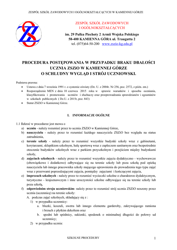 ZESPÓŁ SZKÓŁ ZAWODOWYCH I OGÓLNOKSZTAŁCĄCYCH W KAMIENNEJ GÓRZE ZESPÓŁ SZKÓŁ ZAWODOWYCH I OGÓLNOKSZTAŁCĄCYCH im. 29 Pułku Piechoty 2 Armii Wojska Polskiego 58-400 KAMIENNA GÓRA ul. Traugutta 2 tel. (075)64-50-200 www.zszio-kg.edu.pl PROCEDURA POSTĘPOWANIA W PRZYPADKU BRAKU DBAŁOŚCI UCZNIA ZSZiO W KAMIENNEJ GÓRZE O SCHLUDNY WYGLĄD I STRÓJ UCZNIOWSKI. Podstawa prawna: Ustawa z dnia 7 września 1991 r. o systemie oświaty (Dz. U. z 2004r. Nr 256, poz. 2572, z późn. zm.) Rozporządzenie MEN z dnia 10 czerwca 2015 roku w sprawie warunków i sposobu oceniania, klasyfikowania i promowania uczniów i słuchaczy oraz przeprowadzania sprawdzianów i egzaminów w szkołach publicznych ( Dz.U. z 2015r, poz. 843) Statut ZSZiO w Kamiennej Górze. I. INFORMACJE OGÓLNE 1.1 Ilekroć w procedurze jest mowa o a) uczniu - należy rozumieć przez to ucznia ZSZiO w Kamiennej Górze, b) nauczycielu - należy przez to rozumieć każdego nauczyciela ZSZiO bez względu na status zatrudnienia, c) terenie szkoły - należy przez to rozumieć wszystkie budynki szkoły wraz z gabinetami, korytarzami, sklepikiem szkolnym, halę sportową wraz z zapleczem sanitarnym oraz bezpośrednie otoczenie budynków szkolnych wraz z parkiem przyszkolnym i przejściem między budynkami szkoły, d) zajęciach szkolnych - należy przez to rozumieć wszystkie zajęcia dydaktyczno - wychowawcze (obowiązkowe i dodatkowe) odbywające się na terenie szkoły lub poza szkołą pod opieką nauczyciela lub innego pracownika szkoły mającego uprawnienia do prowadzenia tego typu zajęć wraz z przerwami poprzedzającymi zajęcia, pomiędzy zajęciami i kończącymi zajęcia, e) imprezach szkolnych - należy przez to rozumieć wycieczki szkolne o charakterze dydaktycznym, turystyczno - krajoznawczym i inne uroczystości szkolne odbywające się na terenie szkoły lub poza szkołą, f) odpowiednim stroju uczniowskim- należy przez to rozumieć strój ucznia ZSZiO noszony przez ucznia (uczennicę) na terenie szkoły: A. podczas zajęć szkolnych, składający się z : 1) w przypadku uczennicy: a. bluzki, koszuli, swetra lub innego elementu garderoby, zakrywającego ramiona i brzuch z płytkim dekoltem oraz b. spodni lub spódnicy, sukienki, spodenek o minimalnej długości do połowy ud uczennicy; 2) w przypadku ucznia: SZKOLNE PROCEDURY 1 ZESPÓŁ SZKÓŁ ZAWODOWYCH I OGÓLNOKSZTAŁCĄCYCH W KAMIENNEJ GÓRZE a. koszulki, swetra, bluzy lub innego elementu garderoby zakrywającego ramiona i brzuch oraz b. spodni lub spodenek o minimalnej długości do połowy ud ucznia B. podczas uroczystości szkolnych i egzaminów tzw. strój galowy, składający się z : 1) w przypadku uczennicy: a. białej bluzki lub koszuli zakrywającej ramiona i brzuch oraz b. spodni lub spódnicy w kolorze czarnym lub granatowym o minimalnej długości do połowy ud uczennicy; 2) w przypadku ucznia: a. białej koszuli oraz b. spodni albo garnituru w kolorze czarnym lub granatowym; Wszystkie elementy garderoby damskiej i męskiej odpowiedniego stroju uczniowskiego nie mogą być wykonane z przezroczystego materiału oraz nie mogą być ozdobione jakimikolwiek symbolami powszechnie uważanymi za niemoralne, obraźliwe lub dyskryminujące, m.in.: wulgaryzmami, zakazanymi znakami nacjonalistycznymi, a także symbolami lub zdjęciami substancji odurzających, alkoholu, narkotyków. g) schludnym wyglądzie - należy przez to rozumieć wygląd ucznia ZSZiO w odpowiednim stroju uczniowskim, o którym mowa w ppkt f) oraz zadbanych włosach. 1.2. Uczeń ZSZiO jest obowiązany do dbania o schludny wygląd oraz noszenia właściwego stroju uczniowskiego podczas zajęć szkolnych oraz w trakcie imprez i uroczystości szkolnych. 1.3. Dopuszcza się odstępstwa od stroju uczniowskiego o którym mowa w ppkt f) w przypadkach: 1) udziału ucznia w zajęciach wychowania fizycznego, 2) udziału ucznia w imprezach o charakterze turystycznym lub artystycznym, 3) ucznia klasy mundurowej. 1.4. W przypadkach wymienionych w pkt. 1.3.1) strój uczniowski określa PSO wychowania fizycznego. 1.5. W przypadkach wymienionych w pkt. 1.3.2) strój uczniowski jest ustalony z opiekunem imprezy. 1.6.W przypadkach wymienionych w pkt. 1.3.3) strój uczniowski określa „Regulamin klasy mundurowej”. 1.7. Dbałość ucznia o schludny wygląd i noszenie odpowiedniego stroju podlega ocenie zachowania zgodnie ze Statutem ZSZiO i Regulaminem Oceniania Zachowania. 1.8. Na początku każdego roku szkolnego, wychowawca klasy informuje uczniów o kryteriach oceniania zachowania i obowiązujących procedurach, w tym procedurze postępowania w przypadku braku dbałości ucznia ZSZiO o schludny wygląd i strój uczniowski. 1.9. W przypadku niewywiązywania się ucznia z obowiązku dbałości o schludny wygląd i odpowiedni strój uczniowski, podczas zajęć szkolnych oraz w trakcie imprez i uroczystości szkolnych, mają zastosowanie przepisy zgodnie ze Statutem ZSZiO, Regulaminem Oceniania Zachowania. II. Postępowanie nauczycieli w przypadku braku dbałości ucznia ZSZiO o schludny wygląd i odpowiedni strój uczniowski. SZKOLNE PROCEDURY 2 ZESPÓŁ SZKÓŁ ZAWODOWYCH I OGÓLNOKSZTAŁCĄCYCH W KAMIENNEJ GÓRZE 2.1. W przypadku zauważenia przez nauczyciela nieodpowiedniego stroju u ucznia ZSZiO lub braku schludnego wyglądu w trakcie zajęć na terenie szkoły bądź imprez szkolnych nauczyciel dyscyplinuje ucznia (zwraca uwagę i prosi o poprawę wyglądu) oraz wpisuje uwagę uczniowi do dziennika lub informuje wychowawcę o zaistniałym zdarzeniu. 2.2.Wychowawca klasy po przeczytaniu uwagi negatywnej bądź otrzymaniu informacji ustnej od innego nauczyciela lub pracownika szkoły przyznaje uczniowi punkty negatywne zgodnie z Regulaminem Oceniania Zachowania. 2.3. W przypadku notorycznego niewywiązywania się ucznia z obowiązku dbałości o schludny wygląd i odpowiedni strój uczniowski, wychowawca klasy kieruje ucznia na Komisję Wychowawczą. 2.4. Komisja Wychowawcza może po rozpatrze