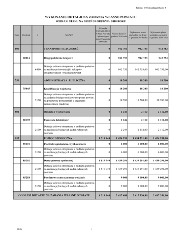 Tabela nr 9 do załącznika nr 1 WYKONANIE DOTACJI NA ZADANIA WŁASNE POWIATU WEDŁUG STANU NA DZIEŃ 31 GRUDNIA 2010 ROKU Dział Rozdział § 600 60014 6430 750 75045 2120 801 80195 2130 Uchwała XXXVIII/289/0 Wykonanie planu Wykonanie planu 9 Rady Powiatu Plan na dzień 31 dochodów na dzień wydatków na dzień Lęborskiego z grudnia 2010 roku 31 grudnia 2010 roku 31 grudnia 2010 roku dnia 22 grudnia 2009 roku NAZWA TRANSPORT I ŁĄCZNOŚĆ 0 942 753 942 753 942 753 Drogi publiczne krajowe 0 942 753 942 753 942 753 Dotacje celowe otrzymane z budżetu państwa na realizacje inwestycji i zakupów inwestycyjnych własnych powiat 0 942 753 942 753,00 942 753,00 ADMINISTRACJA PUBLICZNA 0 18 200 18 200 18 200 Kwalifikacja wojskowa 0 18 200 18 200 18 200 Dotacje celowe otrzymane z budżetu państwa na zadania bieżące realizowane przez powiat na podstawie porozumień z organami administracji rządowej 0 18 200 18 200,00 18 200,00 Oświata i wychowanie 0 2 244 2 112 2 112,00 Pozostała działalność 0 2 244 2 112 2 112,00 Dotacje celowe otrzymane z budżetu państwa na realizację bieżących zadań własnych powiatu 0 2 244 2 112,00 2 112,00 1 519 940 1 454 291 1 454 291,00 1 454 291,00 Placówki opiekuńczo-wychowawcze 0 6 000 6 000,00 6 000,00 Dotacje celowe otrzymane z budżetu państwa na realizację bieżących zadań własnych powiatu 0 6 000 6 000,00 6 000,00 Domy pomocy społecznej 1 519 940 1 439 291 1 439 291,00 1 439 291,00 Dotacje celowe otrzymane z budżetu państwa na realizację bieżących zadań własnych powiatu 1 519 940 1 439 291 1 439 291,00 1 439 291,00 Powiatowe centra pomocy rodzinie 0 9 000 9 000,00 9 000,00 Dotacje celowe otrzymane z budżetu państwa na realizację bieżących zadań własnych powiatu 0 9 000 9 000,00 9 000,00 1 519 940 2 417 488 2 417 356,00 2 417 356,00 POMOC SPOŁECZNA 852 85201 2130 85202 2130 85218 2130 OGÓŁEM DOTACJE NA ZADANIA WŁASNE POWIATU GD/GJ 1