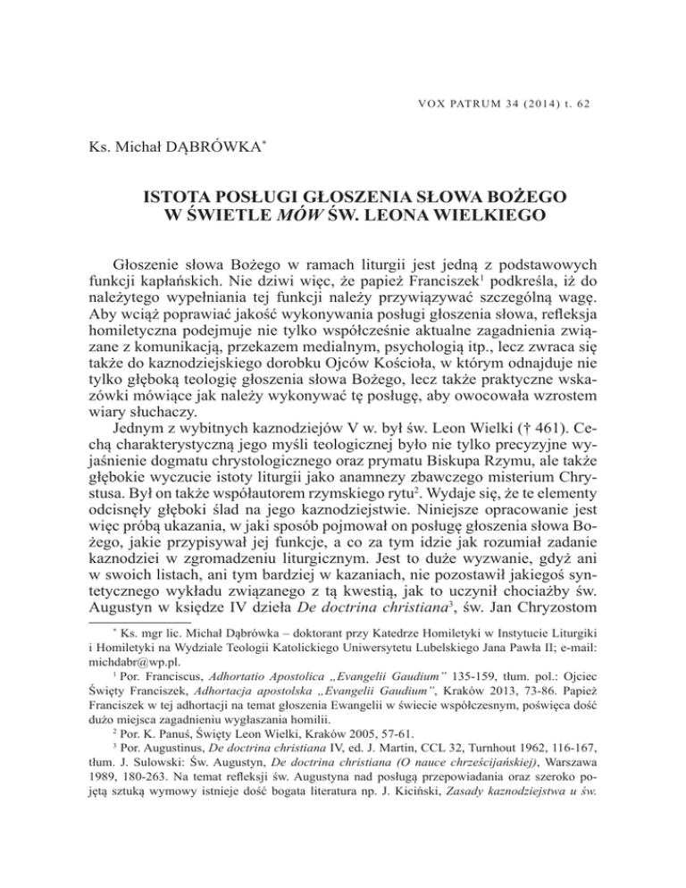 V O X PAT R U M 3 4 ( 2 0 1 4 ) t . 6 2 Ks. Michał DĄBRÓWKA* ISTOTA POSŁUGI GŁOSZENIA SŁOWA BOŻEGO W ŚWIETLE MÓW ŚW. LEONA WIELKIEGO Głoszenie słowa Bożego w ramach liturgii jest jedną z podstawowych funkcji kapłańskich. Nie dziwi więc, że papież Franciszek1 podkreśla, iż do należytego wypełniania tej funkcji należy przywiązywać szczególną wagę. Aby wciąż poprawiać jakość wykonywania posługi głoszenia słowa, refleksja homiletyczna podejmuje nie tylko współcześnie aktualne zagadnienia związane z komunikacją, przekazem medialnym, psychologią itp., lecz zwraca się także do kaznodziejskiego dorobku Ojców Kościoła, w którym odnajduje nie tylko głęboką teologię głoszenia słowa Bożego, lecz także praktyczne wskazówki mówiące jak należy wykonywać tę posługę, aby owocowała wzrostem wiary słuchaczy. Jednym z wybitnych kaznodziejów V w. był św. Leon Wielki († 461). Cechą charakterystyczną jego myśli teologicznej było nie tylko precyzyjne wyjaśnienie dogmatu chrystologicznego oraz prymatu Biskupa Rzymu, ale także głębokie wyczucie istoty liturgii jako anamnezy zbawczego misterium Chrystusa. Był on także współautorem rzymskiego rytu2. Wydaje się, że te elementy odcisnęły głęboki ślad na jego kaznodziejstwie. Niniejsze opracowanie jest więc próbą ukazania, w jaki sposób pojmował on posługę głoszenia słowa Bożego, jakie przypisywał jej funkcje, a co za tym idzie jak rozumiał zadanie kaznodziei w zgromadzeniu liturgicznym. Jest to duże wyzwanie, gdyż ani w swoich listach, ani tym bardziej w kazaniach, nie pozostawił jakiegoś syntetycznego wykładu związanego z tą kwestią, jak to uczynił chociażby św. Augustyn w księdze IV dzieła De doctrina christiana3, św. Jan Chryzostom * Ks. mgr lic. Michał Dąbrówka – doktorant przy Katedrze Homiletyki w Instytucie Liturgiki i Homiletyki na Wydziale Teologii Katolickiego Uniwersytetu Lubelskiego Jana Pawła II; e-mail: [email protected]. 1 Por. Franciscus, Adhortatio Apostolica „Evangelii Gaudium” 135-159, tłum. pol.: Ojciec Święty Franciszek, Adhortacja apostolska „Evangelii Gaudium”, Kraków 2013, 73-86. Papież Franciszek w tej adhortacji na temat głoszenia Ewangelii w świecie współczesnym, poświęca dość dużo miejsca zagadnieniu wygłaszania homilii. 2 Por. K. Panuś, Święty Leon Wielki, Kraków 2005, 57-61. 3 Por. Augustinus, De doctrina christiana IV, ed. J. Martin, CCL 32, Turnhout 1962, 116-167, tłum. J. Sulowski: Św. Augustyn, De doctrina christiana (O nauce chrześcijańskiej), Warszawa 1989, 180-263. Na temat refleksji św. Augustyna nad posługą przepowiadania oraz szeroko pojętą sztuką wymowy istnieje dość bogata literatura np. J. Kiciński, Zasady kaznodziejstwa u św. 94 KS. MICHAŁ DĄBRÓWKA w Dialogu o kapłaństwie4, czy też św. Grzegorz Wielki w Księdze reguły pasterskiej5. Jedyne bezpośrednie uwagi dotyczące kaznodziejstwa, które można odnaleźć w listach Papieża, wskazują iż wyłącznie kapłani są uprawnieni do głoszenia słowa Bożego i nie mogą jej podejmować ani mnisi, ani tym bardziej ludzie świeccy6. Chcąc zatem stworzyć obraz posługi przepowiadania w rozumieniu Leona Wielkiego, trzeba to czynić na podstawie analizy różnych odniesień do tego tematu rozsianych po jego Mowach. One to – zarówno w wydaniu przygotowanym przez J.P. Migne’a, jak i w ich polskim tłumaczeniu – stanowią bazę źródłową dla tego artykułu. W realizacji tego celu stały się pomocne także różnego rodzaju publikacje dotyczące teologicznej myśli św. Leona. Poniższy tekst jest więc próbą pewnej syntezy Leonowej wizji kaznodziejstwa. Wskazuje ona najpierw na obowiązek głoszenia słowa Bożego, jaki – według św. Leona – spoczywa na kapłanie sprawującym liturgię, następnie kreśli wizję Augustyna, PHom 8 (1930) 161-167 i 241-247; J. Czuj, Św. Augustyn jako mówca, PrzKat 72 (1934) 450-451, 466-467 i 485-486; J. Czuj, Poglądy św. Augustyna na wymowę kościelną, Warszawa 1936; N. Juvany, S. Agustín y la formaciόn oratoria cristiana. Estudio comparada del libro IV del „De doctrina christiana” y del „De catechizandis rudibus”, „Analecta Sacra Tarraconensia” 15 (1942) 9-22; Ch. Mohrmann, Saint Augustin prédicateur, w: Études sur le latin des chrétiens, t. 1, ed. Ch. Mohrmann, Roma 1961, 351-370; M.F. Berrouard, Saint Augustin et le ministère de la prédication. Le thème des anges qui montent et qui descendent, RechAug 2 (1962) 447-501; J. Oroz, La retόrica en los sermones de San Agustín, Madrid 1963; J. Sulowski, Wstęp (Św. Augustyn, kaznodzieja i teolog), w: Św. Augustyn, Objaśnienia Psalmów, PSP 37, Warszawa 1986, 26-32; E. Staniek, Sekrety dobrego kaznodziejstwa w ujęciu św. Augustyna, RBL 42 (1989) 302-308; A. Eckmann, Sztuka wymowy w teorii i praktyce św. Augustyna, w: Słowo Boga i drogi człowieka, red. Z. Machnikowski, Tczew – Pelplin 1998, 155-160; E. Staniek, Wielcy mówcy starożytnego Kościoła: św. Augustyn, MH 25 (1998) nr 173, 48-52; B. Kursawe, Docere – delectare – movere: die officia oratoris bei Augustinus in Rhetorik und Gnadenlehre, Paderborn 2000; K. Panuś, Historia kaznodziejstwa, Kraków 2007, 68-80. 4 Por. Joannes Chrysostomus, De sacerdotio IV-V, ed. A.M. Malingrey, SCh 272, Paris 1980, 224-304, tłum. W. Kania: Św. Jan Chryzostom, Dialog o kapłaństwie, BOK 27, Kraków 1992, 99-127. Zob. W. Kosiński, Teoretycy kaznodziejstwa i twórcy szkół kaznodziejskich: św. Jan Chryzostom, PHom 10 (1932) 161-174 i 249-254; W. Kania, Ideał mówcy według św. Jana Chryzostoma, AK 39 (1947) 113-131, 225-240 i 329-339; tenże, Zasady wymowy kościelnej u św. Jana Chryzostoma, „Currenda” 91 (1947) 447-454; Staniek, Wielcy mówcy starożytnego Kościoła, s. 30-52; L. Brottier, Le prédicateur émule du prophète ou rival de l’acteur? Jean Chrysostome: un pasteur déchiré entre ses auditeurs et son Dieu, CPE 