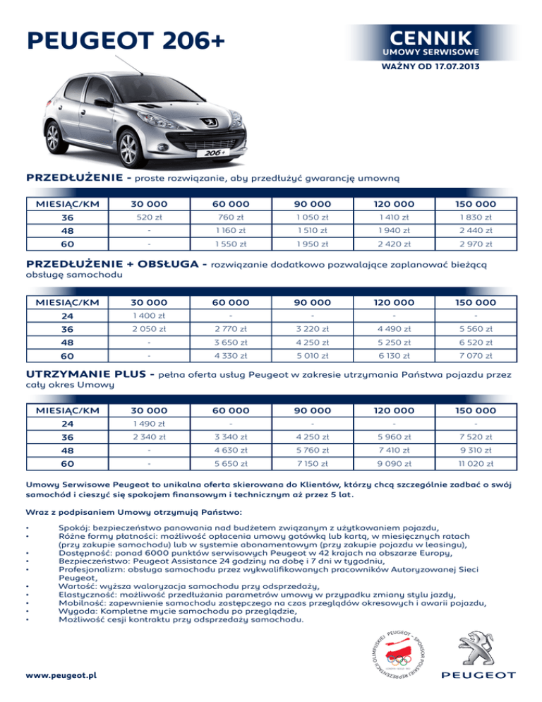 PEUGEOT 206+ CENNIK UMOWY SERWISOWE WAŻNY OD 17.07.2013 PRZEDŁUŻENIE - proste rozwiązanie, aby przedłużyć gwarancję umowną MIESIĄC/KM 30 000 60 000 90 000 120 000 150 000 36 520 zł 760 zł 1 050 zł 1 410 zł 1 830 zł 48 - 1 160 zł 1 510 zł 1 940 zł 2 440 zł 60 - 1 550 zł 1 950 zł 2 420 zł 2 970 zł PRZEDŁUŻENIE + OBSŁUGA - rozwiązanie dodatkowo pozwalające zaplanować bieżącą obsługę samochodu MIESIĄC/KM 30 000 60 000 90 000 120 000 150 000 24 1 400 zł - - - - 36 2 050 zł 2 770 zł 3 220 zł 4 490 zł 5 560 zł 48 - 3 650 zł 4 250 zł 5 250 zł 6 520 zł 60 - 4 330 zł 5 010 zł 6 130 zł 7 070 zł UTRZYMANIE PLUS - pełna oferta usług Peugeot w zakresie utrzymania Państwa pojazdu przez cały okres Umowy MIESIĄC/KM 30 000 60 000 90 000 120 000 150 000 24 1 490 zł - - - - 36 2 340 zł 3 340 zł 4 250 zł 5 960 zł 7 520 zł 48 - 4 630 zł 5 760 zł 7 410 zł 9 310 zł 60 - 5 650 zł 7 150 zł 9 090 zł 11 020 zł Umowy Serwisowe Peugeot to unikalna oferta skierowana do Klientów, którzy chcą szczególnie zadbać o swój samochód i cieszyć się spokojem finansowym i technicznym aż przez 5 lat. Wraz z podpisaniem Umowy otrzymują Państwo: • • • • • • • • • • Spokój: bezpieczeństwo panowania nad budżetem związanym z użytkowaniem pojazdu, Różne formy płatności: możliwość opłacenia umowy gotówką lub kartą, w miesięcznych ratach (przy zakupie samochodu) lub w systemie abonamentowym (przy zakupie pojazdu w leasingu), Dostępność: ponad 6000 punktów serwisowych Peugeot w 42 krajach na obszarze Europy, Bezpieczeństwo: Peugeot Assistance 24 godziny na dobę i 7 dni w tygodniu, Profesjonalizm: obsługa samochodu przez wykwalifikowanych pracowników Autoryzowanej Sieci Peugeot, Wartość: wyższa waloryzacja samochodu przy odsprzedaży, Elastyczność: możliwość przedłużania parametrów umowy w przypadku zmiany stylu jazdy, Mobilność: zapewnienie samochodu zastępczego na czas przeglądów okresowych i awarii pojazdu, Wygoda: Kompletne mycie samochodu po przeglądzie, Możliwość cesji kontraktu przy odsprzedaży samochodu. www.peugeot.pl