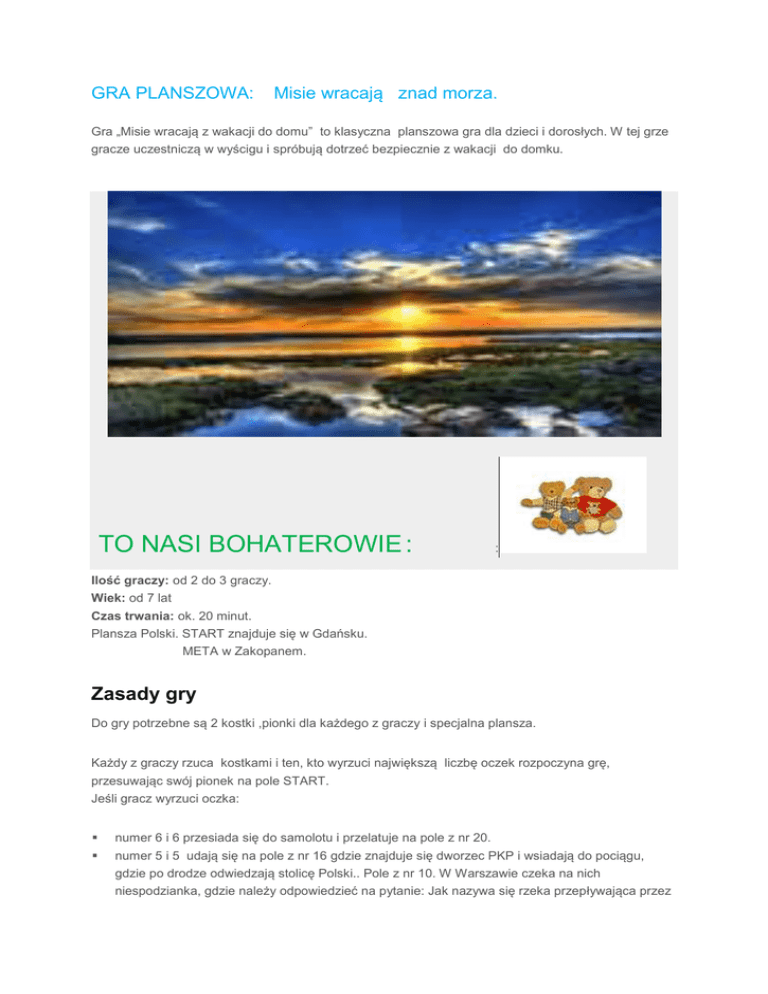 GRA PLANSZOWA: Misie wracają znad morza. Gra „Misie wracają z wakacji do domu” to klasyczna planszowa gra dla dzieci i dorosłych. W tej grze gracze uczestniczą w wyścigu i spróbują dotrzeć bezpiecznie z wakacji do domku. TO NASI BOHATEROWIE : : Ilość graczy: od 2 do 3 graczy. Wiek: od 7 lat Czas trwania: ok. 20 minut. Plansza Polski. START znajduje się w Gdańsku. META w Zakopanem. Zasady gry Do gry potrzebne są 2 kostki ,pionki dla każdego z graczy i specjalna plansza. Każdy z graczy rzuca kostkami i ten, kto wyrzuci największą liczbę oczek rozpoczyna grę, przesuwając swój pionek na pole START. Jeśli gracz wyrzuci oczka: numer 6 i 6 przesiada się do samolotu i przelatuje na pole z nr 20. numer 5 i 5 udają się na pole z nr 16 gdzie znajduje się dworzec PKP i wsiadają do pociągu, gdzie po drodze odwiedzają stolicę Polski.. Pole z nr 10. W Warszawie czeka na nich niespodzianka, gdzie należy odpowiedzieć na pytanie: Jak nazywa się rzeka przepływająca przez Warszawę? (Wisła) lub Podaj herb Stolicy? (Syrenka) itp. Pytanie może zadać przeciwnik w zależności od poziomu wiedzy. Jeśli gracz nie udzielił poprawnej odpowiedzi traci kolejkę. Gdy udzieli prawidłowej odpowiedzi przesuwa się na pole z numerem 18. Gracz, który stanie na polu: numer 8 wsiada na motocykl i przesuwa się na pole 16; numer 9 wsiada na rower i odpowiada na pytanie: Jak aktywnie można spędzić czas wolny np. numer 12 – przesuwa się na pole 19 i jeszcze raz rzucasz kostką; numer 15 - wraca na pole 9 i układa zdanie z wyrazem „morze”. numer 20 – odpowiada na pytanie matematyczne z dodawania zadane przez przeciwnika. numer 23 – odpowiada na pytanie matematyczne z odejmowania zadane przez przeciwnika. numer 25 -2 razy opuszcza kolejkę; numer 11 -1 raz opuszcza kolejkę i odpowiada na pytanie Co można robić podczas wakacji? Jeśli z rodzicami. nie udzieli odpowiedzi opuszcza 2 kolejki; numer 45 -2 razy opuszcza kolejkę; numer 35 -3 razy opuszcza kolejkę; numer 50 i 60 – pole ze statkiem oznacza powrót z powrotem na START. Aby dojść do ostatniego pola 100, trzeba wyrzucić dokładną liczbę równą nieparzystej liczbie oczek. Jeśli liczba jest za parzysta, trzeba cofnąć się na pole z nr 90. Życzę udanej zabawy!!!