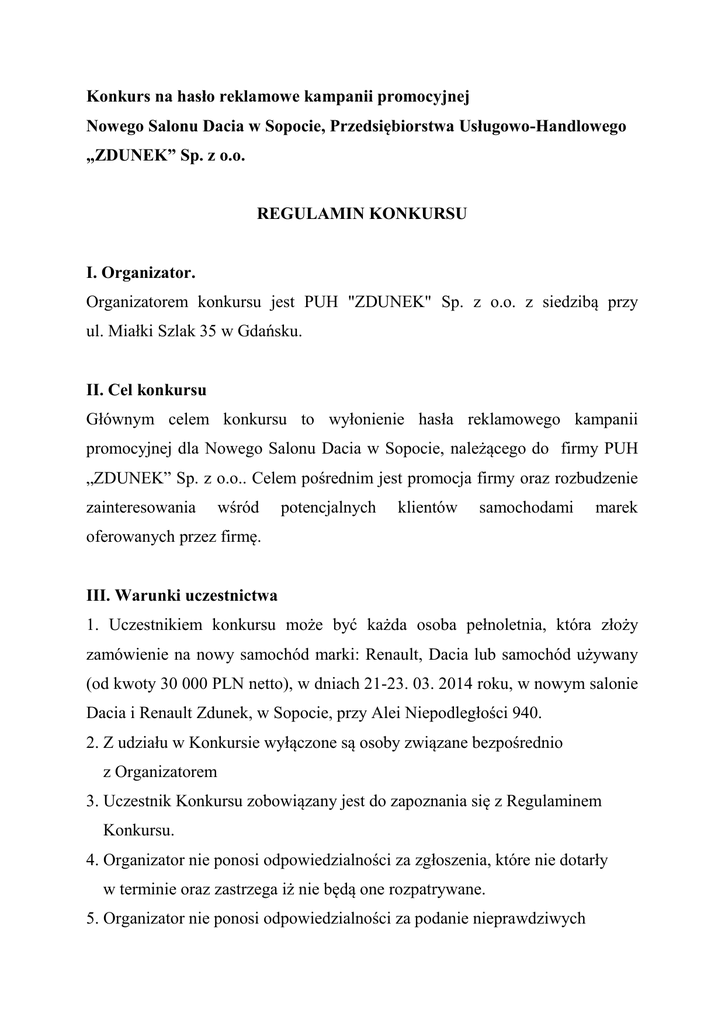 Konkurs na hasło reklamowe kampanii promocyjnej Nowego Salonu Dacia w Sopocie, Przedsiębiorstwa Usługowo-Handlowego „ZDUNEK” Sp. z o.o. REGULAMIN KONKURSU I. Organizator. Organizatorem konkursu jest PUH "ZDUNEK" Sp. z o.o. z siedzibą przy ul. Miałki Szlak 35 w Gdańsku. II. Cel konkursu Głównym celem konkursu to wyłonienie hasła reklamowego kampanii promocyjnej dla Nowego Salonu Dacia w Sopocie, należącego do firmy PUH „ZDUNEK” Sp. z o.o.. Celem pośrednim jest promocja firmy oraz rozbudzenie zainteresowania wśród potencjalnych klientów samochodami marek oferowanych przez firmę. III. Warunki uczestnictwa 1. Uczestnikiem konkursu może być każda osoba pełnoletnia, która złoży zamówienie na nowy samochód marki: Renault, Dacia lub samochód używany (od kwoty 30 000 PLN netto), w dniach 21-23. 03. 2014 roku, w nowym salonie Dacia i Renault Zdunek, w Sopocie, przy Alei Niepodległości 940. 2. Z udziału w Konkursie wyłączone są osoby związane bezpośrednio z Organizatorem 3. Uczestnik Konkursu zobowiązany jest do zapoznania się z Regulaminem Konkursu. 4. Organizator nie ponosi odpowiedzialności za zgłoszenia, które nie dotarły w terminie oraz zastrzega iż nie będą one rozpatrywane. 5. Organizator nie ponosi odpowiedzialności za podanie nieprawdziwych danych lub danych osoby trzeciej przez Uczestników. Podanie nieprawdziwych danych skutkuje odebraniem prawa do nagrody. 6. Udział w Konkursie jest bezpłatny. IV. Zasady konkursu. 1. Hasło konkursowe należy wypełnić na specjalnie przygotowanym do tego celu formularzu, który będzie dostępny w salonie Dacia Zdunek w Sopocie w czasie trwania konkursu oraz na stronie internetowej organizatora pod adresem: www.renault.zdunek.pl oraz www.dacia.zdunek.pl 2. Jeden uczestnik konkursu ma prawo przesłać nieograniczoną liczbę haseł konkursowych. 3. Zgłoszenie hasła do Konkursu jest równoznaczne z oświadczeniem Uczestnika, że przysługują mu nieograniczone autorskie prawa osobiste i majątkowe do przedmiotu konkursu i że ponosi on wszelką odpowiedzialność za złamanie tych praw. 4. Zgłoszenie hasła do Konkursu jest równoznaczne z udzieleniem przez Uczestnika zgody na prezentowanie zgłoszonych haseł w mediach oraz w internecie. 5. Konkurs jest moderowany przez Organizatora. Moderacja w Konkursie polega na prawie Organizatora do niedopuszczeniu do konkursu, bez konieczności poinformowania o tym Uczestnika, haseł, które: a) narusza prawo obowiązujące w Polsce, b) narusza prawa i uczucia osób trzecich, c) zawiera treści powszechnie uznane za społecznie niewłaściwe i naganne moralnie (np. hasła zawierające treści obraźliwe, wulgarne, obsceniczne, nawołujące do nienawiści i przemocy), d) zawiera treści o charakterze komercyjnym (reklamy), e) narusza inne postanowienia zawarte w Regulaminie Konkursu. 6. Uczestnik ma prawo wycofać zgłoszone hasło wyłącznie w czasie trwania Konkursu. V. Rozstrzygnięcie konkursu i nagrody. 1. Pierwszy etap konkursu dokonywany będzie przez komisję powołaną przez Organizatora, z których to komisja wybierze 3 najlepsze hasła. Zwycięskie hasło zostanie wyłonione poprzez największą liczbę oklasków gości przebywających w salonie Dacia w Sopocie pod adresem Aleja Niepodległości 940, w dniu rozstrzygnięcia konkursu. 2. Rozstrzygnięcie konkursu nastąpi w dniu :23.03.2014 roku o godzinie 16:00. 3. W konkursie zostanie przyznana następująca nagroda: Renault Twingo. 4. Nagrody w Konkursie nie można zamienić na inną nagrodę, ani na ekwiwalent pieniężny. 5. Zwycięzca Konkursu nie może przenieść prawa do otrzymania nagrody na osoby trzecie. 6. Zwycięzca konkursu wyraża zgodę na opłacenie podatku od wygranej, w wysokości 10 % wartości samochodu. 7. Nagroda przepada jeżeli, zwycięzca wycofa się z wcześniej złożonego zamówienia. W takim wypadku nagroda trafi do kolejnej osoby, która zdobyła największą liczbę punktów przyznaną w półfinale przez komisję konkursową. 8.Warunkiem odbiory nagrody jest odbiór zamówionego samochodu. VI. Postanowienia końcowe. 1.Organizator zastrzega sobie prawo do nieodpłatnego wykorzystania nadesłanych haseł reklamowych: w prasie, w telewizji, w internecie, w katalogach, w informatorach, na plakatach, itp. w celach promocji konkursu. 2. Regulamin znajduje się do wglądu w siedzibie Organizatora konkursu firmy PUH "ZDUNEK" Sp. z o.o. w Gdańsku oraz na jej stronie internetowej: www.zdunek.pl. 3. Złamanie ustaleń regulaminu Konkursu przez Uczestnika będzie oznaczało jego wykluczenie z uczestnictwa w Konkursie. 4. W sprawach nie uregulowanych niniejszym Regulaminem zastosowanie znajdą odpowiednie przepisy Kodeksu Cywilnego. 5. Nadesłane na Konkurs dane osobowe uczestników mogą być przetwarzane przez Organizatora wyłącznie w celu wykonania ich obowiązków związanych z Konkursem oraz w celach informacyjno-marketingowych Organizatora. Dane będą chronione zgodnie z Ustawą o Ochronie Danych Osobowych (Dz. U. Nr 133/97, poz. 883 z późn. zm.) Uczestnikom Konkursu przysługuje prawo dostępu do treści swoich danych oraz ich poprawiania. Organizator: PUH "ZDUNEK" Sp. z o.o. ul. Miałki Szlak 35 80-717 Gdańsk www.zdunek.pl