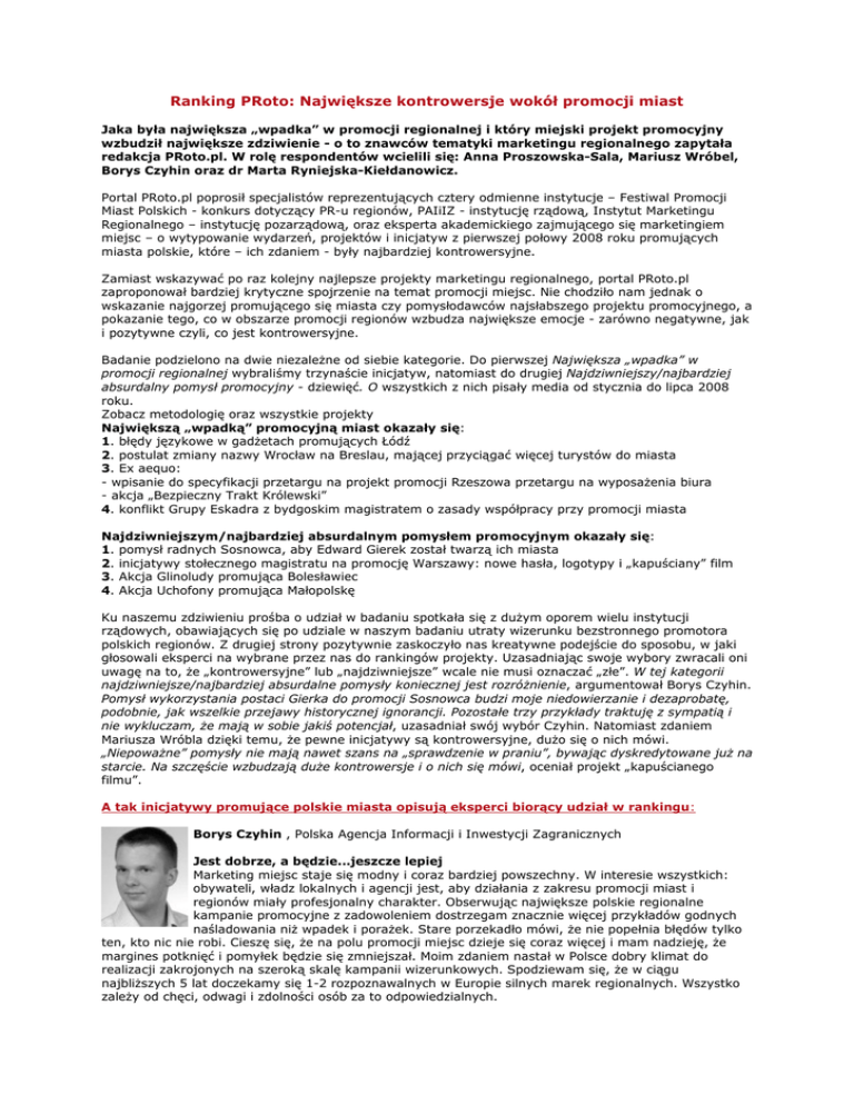 Ranking PRoto: Największe kontrowersje wokół promocji miast Jaka była największa „wpadka” w promocji regionalnej i który miejski projekt promocyjny wzbudził największe zdziwienie - o to znawców tematyki marketingu regionalnego zapytała redakcja PRoto.pl. W rolę respondentów wcielili się: Anna Proszowska-Sala, Mariusz Wróbel, Borys Czyhin oraz dr Marta Ryniejska-Kiełdanowicz. Portal PRoto.pl poprosił specjalistów reprezentujących cztery odmienne instytucje – Festiwal Promocji Miast Polskich - konkurs dotyczący PR-u regionów, PAIiIZ - instytucję rządową, Instytut Marketingu Regionalnego – instytucję pozarządową, oraz eksperta akademickiego zajmującego się marketingiem miejsc – o wytypowanie wydarzeń, projektów i inicjatyw z pierwszej połowy 2008 roku promujących miasta polskie, które – ich zdaniem - były najbardziej kontrowersyjne. Zamiast wskazywać po raz kolejny najlepsze projekty marketingu regionalnego, portal PRoto.pl zaproponował bardziej krytyczne spojrzenie na temat promocji miejsc. Nie chodziło nam jednak o wskazanie najgorzej promującego się miasta czy pomysłodawców najsłabszego projektu promocyjnego, a pokazanie tego, co w obszarze promocji regionów wzbudza największe emocje - zarówno negatywne, jak i pozytywne czyli, co jest kontrowersyjne. Badanie podzielono na dwie niezaleŜne od siebie kategorie. Do pierwszej Największa „wpadka” w promocji regionalnej wybraliśmy trzynaście inicjatyw, natomiast do drugiej Najdziwniejszy/najbardziej absurdalny pomysł promocyjny - dziewięć. O wszystkich z nich pisały media od stycznia do lipca 2008 roku. Zobacz metodologię oraz wszystkie projekty Największą „wpadką” promocyjną miast okazały się: 1. błędy językowe w gadŜetach promujących Łódź 2. postulat zmiany nazwy Wrocław na Breslau, mającej przyciągać więcej turystów do miasta 3. Ex aequo: - wpisanie do specyfikacji przetargu na projekt promocji Rzeszowa przetargu na wyposaŜenia biura - akcja „Bezpieczny Trakt Królewski” 4. konflikt Grupy Eskadra z bydgoskim magistratem o zasady współpracy przy promocji miasta Najdziwniejszym/najbardziej absurdalnym pomysłem promocyjnym okazały się: 1. pomysł radnych Sosnowca, aby Edward Gierek został twarzą ich miasta 2. inicjatywy stołecznego magistratu na promocję Warszawy: nowe hasła, logotypy i „kapuściany” film 3. Akcja Glinoludy promująca Bolesławiec 4. Akcja Uchofony promująca Małopolskę Ku naszemu zdziwieniu prośba o udział w badaniu spotkała się z duŜym oporem wielu instytucji rządowych, obawiających się po udziale w naszym badaniu utraty wizerunku bezstronnego promotora polskich regionów. Z drugiej strony pozytywnie zaskoczyło nas kreatywne podejście do sposobu, w jaki głosowali eksperci na wybrane przez nas do rankingów projekty. Uzasadniając swoje wybory zwracali oni uwagę na to, Ŝe „kontrowersyjne” lub „najdziwniejsze” wcale nie musi oznaczać „złe”. W tej kategorii najdziwniejsze/najbardziej absurdalne pomysły koniecznej jest rozróŜnienie, argumentował Borys Czyhin. Pomysł wykorzystania postaci Gierka do promocji Sosnowca budzi moje niedowierzanie i dezaprobatę, podobnie, jak wszelkie przejawy historycznej ignorancji. Pozostałe trzy przykłady traktuję z sympatią i nie wykluczam, Ŝe mają w sobie jakiś potencjał, uzasadniał swój wybór Czyhin. Natomiast zdaniem Mariusza Wróbla dzięki temu, Ŝe pewne inicjatywy są kontrowersyjne, duŜo się o nich mówi. „NiepowaŜne” pomysły nie mają nawet szans na „sprawdzenie w praniu”, bywając dyskredytowane juŜ na starcie. Na szczęście wzbudzają duŜe kontrowersje i o nich się mówi, oceniał projekt „kapuścianego filmu”. A tak inicjatywy promujące polskie miasta opisują eksperci biorący udział w rankingu: Borys Czyhin , Polska Agencja Informacji i Inwestycji Zagranicznych Jest dobrze, a będzie...jeszcze lepiej Marketing miejsc staje się modny i coraz bardziej powszechny. W interesie wszystkich: obywateli, władz lokalnych i agencji jest, aby działania z zakresu promocji miast i regionów miały profesjonalny charakter. Obserwując największe polskie regionalne kampanie promocyjne z zadowoleniem dostrzegam znacznie więcej przykładów godnych naśladowania niŜ wpadek i poraŜek. Stare porzekadło mówi, Ŝe nie popełnia błędów tylko ten, kto nic nie robi. Cieszę się, Ŝe na polu promocji miejsc dzieje się coraz więcej i mam nadzieję, Ŝe margines potknięć i pomyłek będzie się zmniejszał. Moim zdaniem nastał w Polsce dobry klimat do realizacji zakrojonych na szeroką skalę kampanii wizerunkowych. Spodziewam się, Ŝe w ciągu najbliŜszych 5 lat doczekamy się 1-2 rozpoznawalnych w Europie silnych marek regionalnych. Wszystko zaleŜy od chęci, odwagi i zdolności osób za to odpowiedzialnych. Anna Proszowska-Sala , szefowa projektu Festiwal Promocji Miast Polskich, dyrektor ds. public affairs w Grupie Ströer Chodzi o spójną wizję celów promocji Jest pewna zasada, która dotyczy praktycznie kaŜdej profesji, jednak do dziedziny jaką jest promocja pasuje wybitnie. Samorządy miast, podobnie jak i firmy, dziewięćdziesiąt procent czasu tracą na sprawy, projekty, które nie mają większego znaczenia. Dlatego, w kaŜdym roku wystarczy zrobić naprawdę dobrze dwie albo trzy wielkie rzeczy. Do tych strategicznych projektów powinna być dopasowana cała reszta mniejszych, kontrowersyjnych jeśli trzeba działań dodatkowych. Ani komentowane uchofony Małopolski, ani glinoludy Bolesławca nie stanowią strategicznych punktów promocyjnych, więc nie mogą być celem samym w sobie. I zakładam, Ŝe stanowią jedynie uzupełnienie. Nie chodzi przecieŜ o pojedyncze działania, które wzbudzają zainteresowanie mediów, czy dla odmiany oburzenie opinii publicznej, ale o spójną wizję celu, do którego dochodzić moŜna wieloma drogami, za pomocą róŜnych narzędzi komunikacyjnych. NajwaŜniej