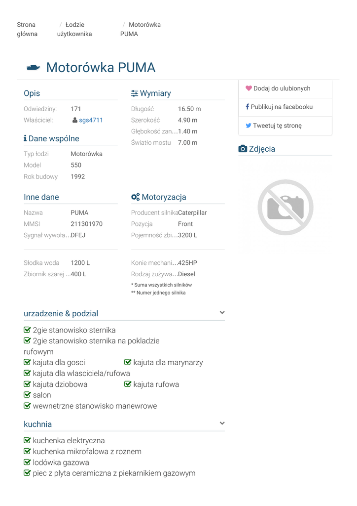 Strona główna / Łodzie użytkownika / Motorówka PUMA Motorówka PUMA Opis Dodaj do ulubionych Wymiary Odwiedziny: 171 Długość 16.50 m Właściciel: sgs4711 Szerokość 4.90 m Dane wspólne Typ łodzi Motorówka Model 550 Rok budowy 1992 Inne dane Publikuj na facebooku Tweetuj tę stronę Głębokość zan…1.40 m Światło mostu 7.00 m Zdjęcia Motoryzacja Nazwa PUMA Producent silnikaCaterpillar MMSI 211301970 Pozycja Front Sygnał wywoła…DFEJ Pojemność zbi…3200 L Słodka woda Konie mechani…425HP 1200 L Zbiornik szarej …400 L Rodzaj zużywa…Diesel * Suma wszystkich silników ** Numer jednego silnika urzadzenie & podzial 2gie stanowisko sternika 2gie stanowisko sternika na pokladzie rufowym kajuta dla gosci kajuta dla marynarzy kajuta dla wlasciciela/rufowa kajuta dziobowa kajuta rufowa salon wewnetrzne stanowisko manewrowe kuchnia kuchenka elektryczna kuchenka mikrofalowa z roznem lodówka gazowa piec z plyta ceramiczna z piekarnikiem gazowym zmywarka instrumentarium nautyczne echosonda GPS z urzadzeniem peryferyjnym Instrumentarium nautyczne kompas komputer pokladowy odbiornik map synoptycznych ploter do map radar radionadajnik UKF samoster sumlog plandeki & pokrowce bimini plandeka na flybridge wyposazenie akumulator generator glówny wlacznik do akumulatora kotwica kotwica z lancuchem ladowarka do akumulatora pompa odpompowujaca pralka przylacze ladowe 230V skrzynia kotwiczna tratwa ratunkowa winda kotwiczna (elektryczny) wycieraczki wycieraczki z tarcza rozpryskowa osprzet barek pokladowy chlodziarka dodatkowe wyposazenie drabinka kapielowa drzwi na poklad kapielowy na rufie dywan w kokpicie dziobowy ster strumieniowy gasnica klapka wywazajaca komora napedów osprzetu kosz na rufie z drewniana porecza kosz na rufie ze stali nierdzewnej luk pokladowy obicia na poduszki ze skóry odtwarzacz CD ogrzewanie ogrzewanie cieplym powietrzem ogrzewanie klimatyzacja podgrzewacz wody podwodna powloka malarska poklad kapielowy poklad kapielowy zintegrowany pompa zenzowa pompa zenzowa mechaniczna prysznic rufowy cieply/zimny radio reling pokladowy telewizor kolorowy urzadzenie gasnicze urzadzenie hydrauliczne wideo zmianiacz plyt CD cy Go rą cy Go rą cy rą Go Go rą cy Podobne łodzie Maria Silia etinsider www.yachtpriva… czeczelits IMAGO ChaosOpa Grand Chaos