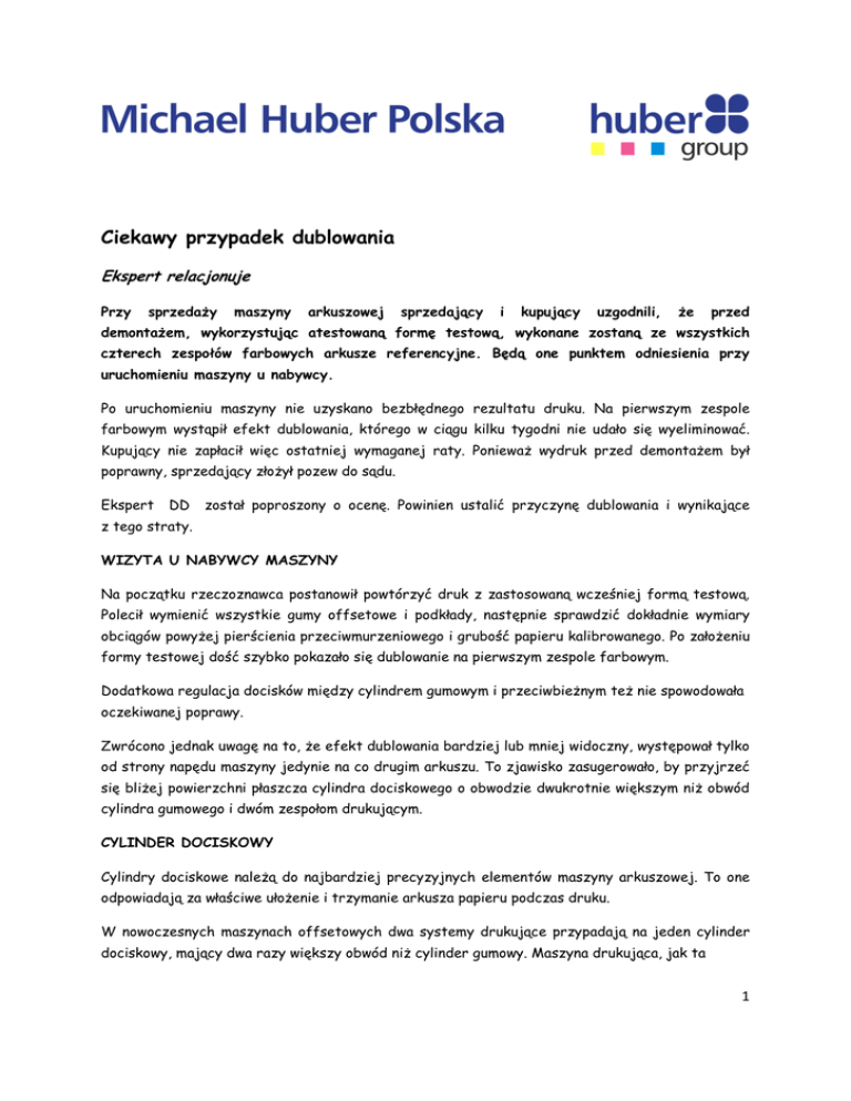 Ciekawy przypadek dublowania Ekspert relacjonuje Przy sprzedaŜy maszyny arkuszowej sprzedający i kupujący uzgodnili, Ŝe przed demontaŜem, wykorzystując atestowaną formę testową, wykonane zostaną ze wszystkich czterech zespołów farbowych arkusze referencyjne. Będą one punktem odniesienia przy uruchomieniu maszyny u nabywcy. Po uruchomieniu maszyny nie uzyskano bezbłędnego rezultatu druku. Na pierwszym zespole farbowym wystąpił efekt dublowania, którego w ciągu kilku tygodni nie udało się wyeliminować. Kupujący nie zapłacił więc ostatniej wymaganej raty. PoniewaŜ wydruk przed demontaŜem był poprawny, sprzedający złoŜył pozew do sądu. Ekspert DD został poproszony o ocenę. Powinien ustalić przyczynę dublowania i wynikające z tego straty. WIZYTA U NABYWCY MASZYNY Na początku rzeczoznawca postanowił powtórzyć druk z zastosowaną wcześniej formą testową. Polecił wymienić wszystkie gumy offsetowe i podkłady, następnie sprawdzić dokładnie wymiary obciągów powyŜej pierścienia przeciwmurzeniowego i grubość papieru kalibrowanego. Po załoŜeniu formy testowej dość szybko pokazało się dublowanie na pierwszym zespole farbowym. Dodatkowa regulacja docisków między cylindrem gumowym i przeciwbieŜnym teŜ nie spowodowała oczekiwanej poprawy. Zwrócono jednak uwagę na to, Ŝe efekt dublowania bardziej lub mniej widoczny, występował tylko od strony napędu maszyny jedynie na co drugim arkuszu. To zjawisko zasugerowało, by przyjrzeć się bliŜej powierzchni płaszcza cylindra dociskowego o obwodzie dwukrotnie większym niŜ obwód cylindra gumowego i dwóm zespołom drukującym. CYLINDER DOCISKOWY Cylindry dociskowe naleŜą do najbardziej precyzyjnych elementów maszyny arkuszowej. To one odpowiadają za właściwe ułoŜenie i trzymanie arkusza papieru podczas druku. W nowoczesnych maszynach offsetowych dwa systemy drukujące przypadają na jeden cylinder dociskowy, mający dwa razy większy obwód niŜ cylinder gumowy. Maszyna drukująca, jak ta 1 u opisanego nabywcy, która w ciągu dwóch lat wydrukowała około 30 mln arkuszy, moŜe wykazywać na powierzchniach cylindra dociskowego obu systemów drukowych błąd ruchu obrotowego (bicie cylindra) nie większy niŜ 8 µm (=0,0008 mm) na całej szerokości cylindra. Fabrycznie nowe maszyny są justowane tak, Ŝe tolerancje koncentryczności są mniejsze niŜ 5 µm. Cylindry dociskowe kaŜdego zespołu farbowego zostały dokładnie sprawdzone. UŜyto skalibrowanego czujnika zegarowego mierzącego z dokładnością do 1 µm (= o,ooo1 mm), a specjalne ramię i magnetycznie mocowana stopka pomiarowa umoŜliwiły kontrolę prawie kaŜdej części powierzchni cylindra. WYNIKI Wielokrotne pomiary wszystkich cylindrów dociskowych dały powtarzalny i jednoznaczny wniosek. Na pierwszym zespole drukującym od strony napędu (pierwsza połowa cylindra) stwierdzono róŜnicę w 12 µm w pomiarze krągłości. Na drugim zespole drukującym podwójnego cylindra dociskowego zanotowano wynik mniejszy niŜ 5 µm, co jest róŜnicą dopuszczalną. Pozostałe trzy cylindry dociskowe wykazywały tolerancję ruchu obrotowego mniejszą niŜ 6 µm. OSTATECZNA OPINIA Opinia eksperta była jednoznaczna. Stwierdzono, Ŝe przyczyną występującego dublowania był błąd koncentryczności pierwszego cylindra dociskowego od strony napędu. Cylinder naleŜy wymontować, aby dokładnie móc zeszlifować wgniecioną powierzchnię. Następnie pokryć nową warstwą chromową i oszlifować. Konieczne są teŜ dwa nowe łoŜyska. Koszty naprawy łącznie z kosztami montaŜu oszacowano na ok. 50 tys. Euro. Powodem uszkodzeń cylindra była niewątpliwie większa ilość arkuszy, które wtłoczyły się pomiędzy cylinder gumowy a dociskowy pierwszego zespołu drukującego i wgniotły powierzchnię cylindra. Sprzedający skorygował to uszkodzenie podczas druku testowego za pomocą specjalnej gumy offsetowej. Źródło: Deutscher Drucker, nr 4 z dn.03.02.2011 2