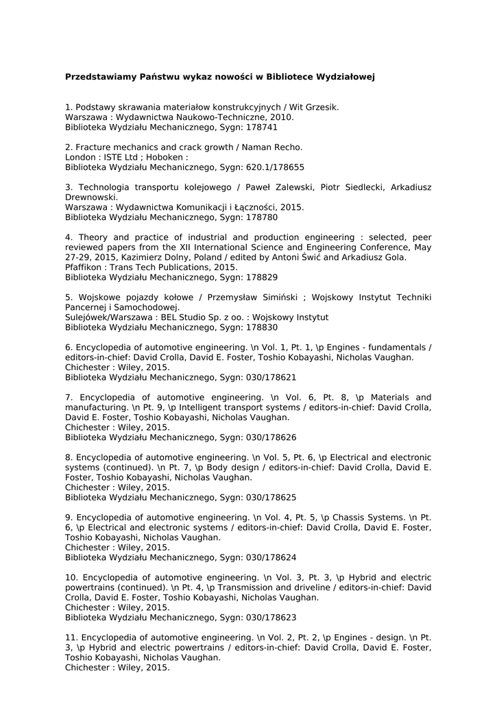 Przedstawiamy Państwu wykaz nowości w Bibliotece Wydziałowej 1. Podstawy skrawania materiałow konstrukcyjnych / Wit Grzesik. Warszawa : Wydawnictwa Naukowo-Techniczne, 2010. Biblioteka Wydziału Mechanicznego, Sygn: 178741 2. Fracture mechanics and crack growth / Naman Recho. London : ISTE Ltd ; Hoboken : Biblioteka Wydziału Mechanicznego, Sygn: 620.1/178655 3. Technologia transportu kolejowego / Paweł Zalewski, Piotr Siedlecki, Arkadiusz Drewnowski. Warszawa : Wydawnictwa Komunikacji i Łączności, 2015. Biblioteka Wydziału Mechanicznego, Sygn: 178780 4. Theory and practice of industrial and production engineering : selected, peer reviewed papers from the XII International Science and Engineering Conference, May 27-29, 2015, Kazimierz Dolny, Poland / edited by Antoni Świć and Arkadiusz Gola. Pfaffikon : Trans Tech Publications, 2015. Biblioteka Wydziału Mechanicznego, Sygn: 178829 5. Wojskowe pojazdy kołowe / Przemysław Simiński ; Wojskowy Instytut Techniki Pancernej i Samochodowej. Sulejówek/Warszawa : BEL Studio Sp. z oo. : Wojskowy Instytut Biblioteka Wydziału Mechanicznego, Sygn: 178830 6. Encyclopedia of automotive engineering. \n Vol. 1, Pt. 1, \p Engines - fundamentals / editors-in-chief: David Crolla, David E. Foster, Toshio Kobayashi, Nicholas Vaughan. Chichester : Wiley, 2015. Biblioteka Wydziału Mechanicznego, Sygn: 030/178621 7. Encyclopedia of automotive engineering. \n Vol. 6, Pt. 8, \p Materials and manufacturing. \n Pt. 9, \p Intelligent transport systems / editors-in-chief: David Crolla, David E. Foster, Toshio Kobayashi, Nicholas Vaughan. Chichester : Wiley, 2015. Biblioteka Wydziału Mechanicznego, Sygn: 030/178626 8. Encyclopedia of automotive engineering. \n Vol. 5, Pt. 6, \p Electrical and electronic systems (continued). \n Pt. 7, \p Body design / editors-in-chief: David Crolla, David E. Foster, Toshio Kobayashi, Nicholas Vaughan. Chichester : Wiley, 2015. Biblioteka Wydziału Mechanicznego, Sygn: 030/178625 9. Encyclopedia of automotive engineering. \n Vol. 4, Pt. 5, \p Chassis Systems. \n Pt. 6, \p Electrical and electronic systems / editors-in-chief: David Crolla, David E. Foster, Toshio Kobayashi, Nicholas Vaughan. Chichester : Wiley, 2015. Biblioteka Wydziału Mechanicznego, Sygn: 030/178624 10. Encyclopedia of automotive engineering. \n Vol. 3, Pt. 3, \p Hybrid and electric powertrains (continued). \n Pt. 4, \p Transmission and driveline / editors-in-chief: David Crolla, David E. Foster, Toshio Kobayashi, Nicholas Vaughan. Chichester : Wiley, 2015. Biblioteka Wydziału Mechanicznego, Sygn: 030/178623 11. Encyclopedia of automotive engineering. \n Vol. 2, Pt. 2, \p Engines - design. \n Pt. 3, \p Hybrid and electric powertrains / editors-in-chief: David Crolla, David E. Foster, Toshio Kobayashi, Nicholas Vaughan. Chichester : Wiley, 2015. Biblioteka Wydziału Mechanicznego, Sygn: 030/178622 12. Welding metallurgy and weldability / John C. Lippold. Hoboken : A John Wiley Sons, Inc., cop. 2015. Biblioteka Wydziału Mechanicznego, Sygn: 669.2/.8/178640 13. Materials science and engineering / William D. Callister jr., David G. Rethwisch. Hoboken : Wiley, cop. 2015. Biblioteka Wydziału Mechanicznego, Sygn: 620.1/178631 14. Introduction to hybrid vehicle system modeling and control / Wei Liu. Hoboken, N.J. : ; Wiley, 2013. Biblioteka Wydziału Mechanicznego, Sygn: 629.3/178660 15. Electric and hybrid vehicles : technologies, modeling, and control : a mechatronic approach / Amir Khajepour, M. Saber Fallah, Avesta Goodarzi. Chichester : John Wiley Sons, cop. 2014. Biblioteka Wydziału Mechanicznego, Sygn: 629.3/178651 16. Thermo-hydrodynamic lubrication in hydrodynamic bearings / Dominique Bonneau, Aurelian Fatu, Dominique Souchet. London : ISTE Ltd ; Hoboken : Biblioteka Wydziału Mechanicznego, Sygn: 178636 17. Mixed lubrication in hydrodynamic bearings / Dominique Bonneau, Aurelian Fatu, Dominique Souchet. London : ISTE Ltd ; Hoboken : Biblioteka Wydziału Mechanicznego, Sygn: 178633 18. Turbulence : an introduction for scientists and engineers / P. A. Davidson. Oxford : Oxford University Press, 2015. Biblioteka Wydziału Mechanicznego, Sygn: 178639 19. Thermodynamics and statistical mechanics : an integrated approach / M. Scott Shell. Cambridge : Cambridge University Press, 2015. Biblioteka Wydziału Mechanicznego, Sygn: 178637 20. Materials science of polymers : plastics, rubber, blends and composites / edited by A. K. Haghi, Eduardo A. Castro, Sabu Thomas, P. M. Sivakumar, Andrew G. Mercader. Oakville ; Waretown : Apple Academic Press, Biblioteka Wydziału Mechanicznego, Sygn: 178632 21. Thin films and coatings : toughening and toughness characterization / edited by Sam Zhang. Boca Raton : CRC Press - Taylor Group, 2016. Biblioteka Wydziału Mechanicznego, Sygn: 178638 22. Batteries for electric vehicles : materials and electrochemistry / Helena Berg. Cambridge : Cambridge University Press, 2015. Biblioteka Wydziału Mechanicznego, Sygn: 178644 23. Plastics reinforcement and industrial application / T. R. Crompton. Boca Raton : CRC Press - Taylor Francis Group, 2016. Biblioteka Wydziału Mechanicznego, Sygn: 178634 24. Machining of hard materials / [editor] J. Paulo Davim. London [etc.] : Springer, 2011. Biblioteka Wydziału Mechanicznego, Sygn: 178629 25. Materials characterization : modern methods and applications / edited by Narayanaswami Ranganathan. Singapore : Pan Stanford Publishing, 2015. Biblioteka Wydziału Mechanicznego, Sygn: 178630 26. Machine analysis with computer applications for mechanical engineers / James Doane. Chichester : John Wiley Sons, 2016. Biblioteka Wydziału Mechanicznego, Sygn: 178628 27. Surface coating and modification of metallic biomaterials / edited by Cuie Wen. Cambridge : Elsevier ; Waltham : Biblioteka Wydziału Mechanicznego, Sygn: 178635 28. Electric vehicle machines and drives : design, analysis and application / K. T. Chan. Singapore : John Wiley Sons Singapore, 2015. Biblioteka Wydziału Mechanicznego, 